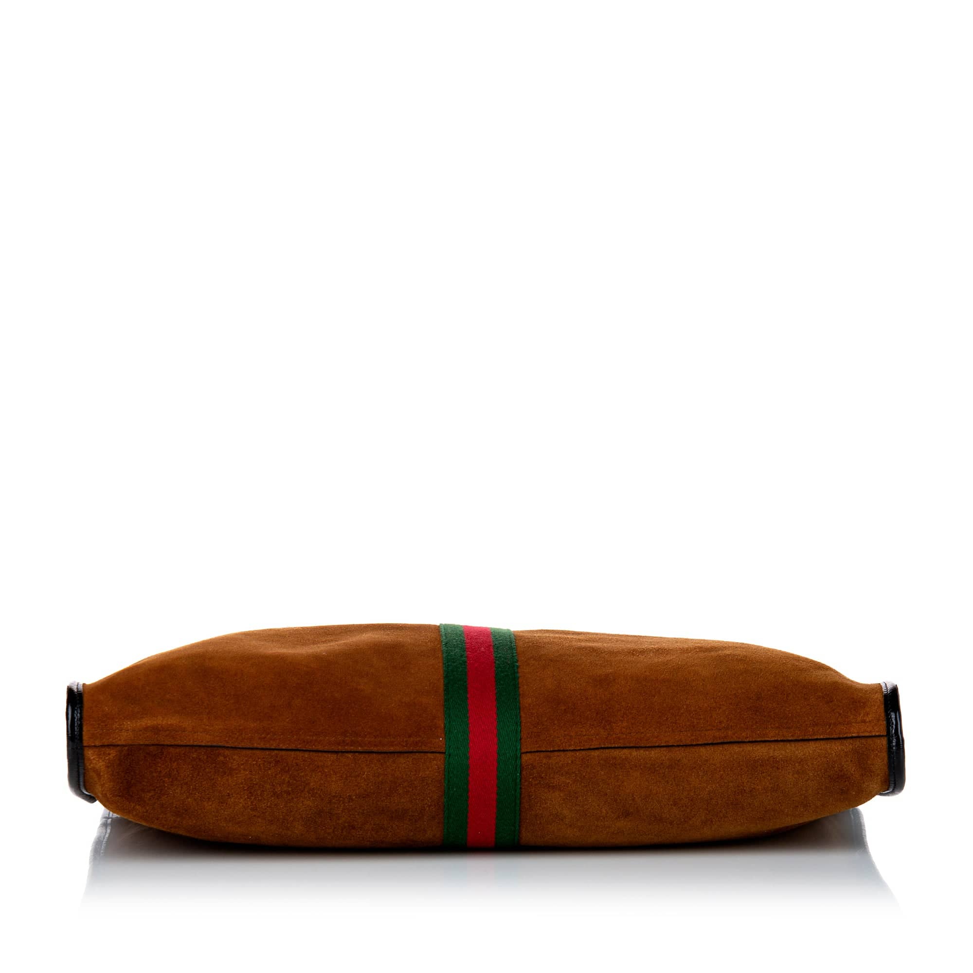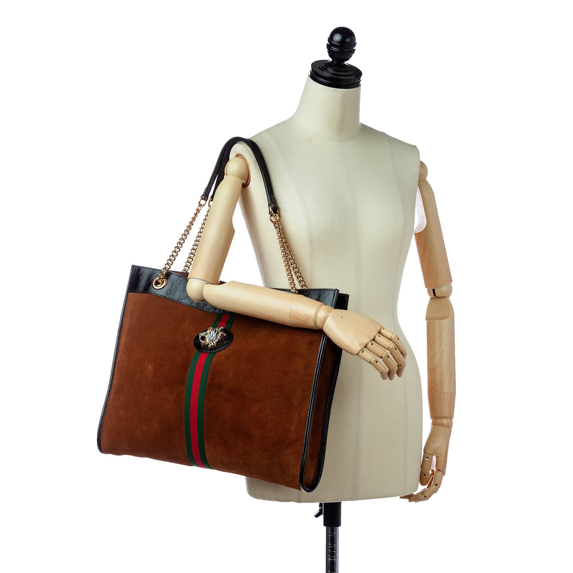 This fantastic Gucci Rajah Tote Bag in the large size Large was made of brown suede and has caps made of black paint leather and golden details. the Bag On the front there is a golden tiger head display typical for the model on the green and red striped wovenband.At the top has the Bag a magnetic closure. the Bag has two gold chain straps with leather inserts in the shoulder area. the Bag Comes with a suitable pochette and represents a sporty elegant companion for all kinds of situations.