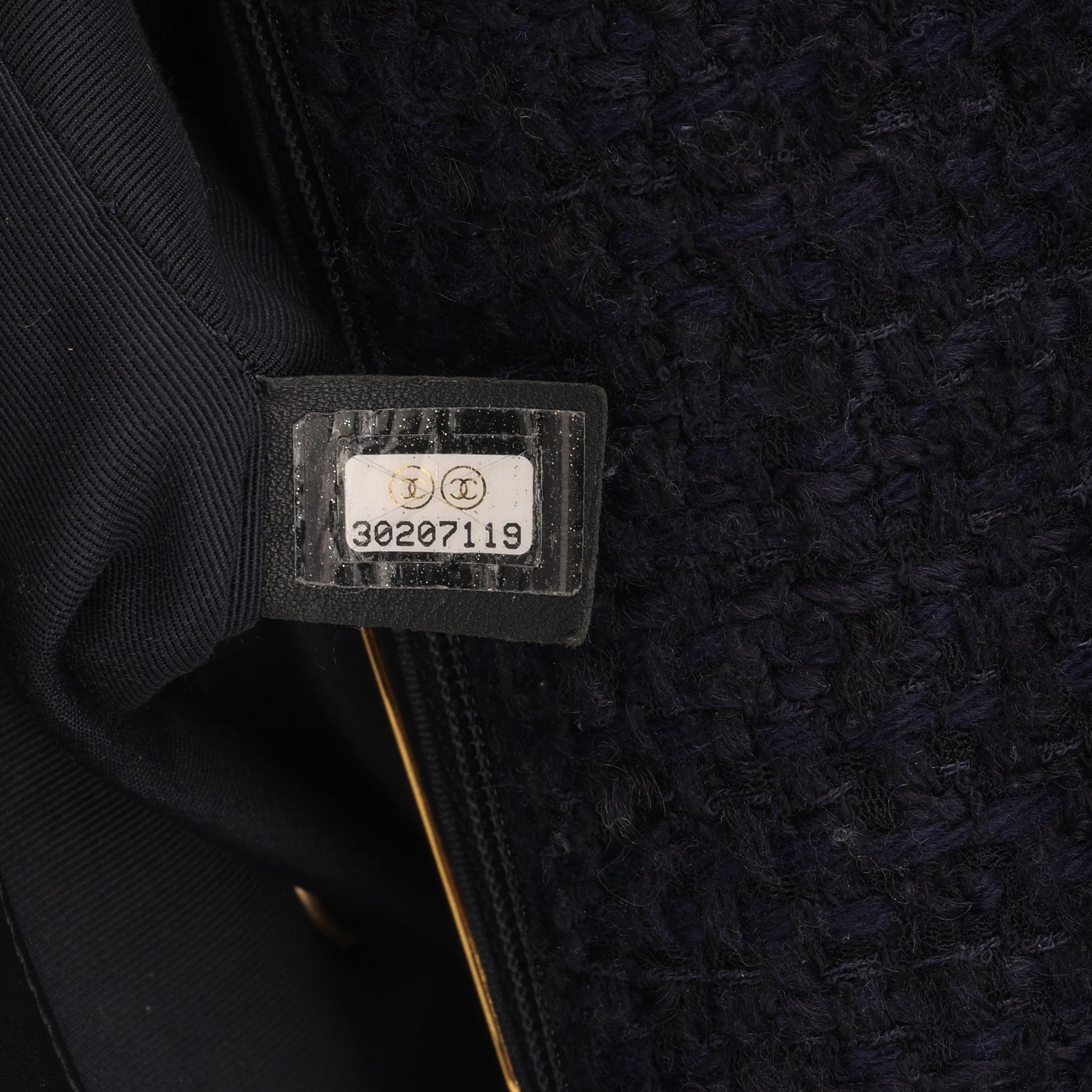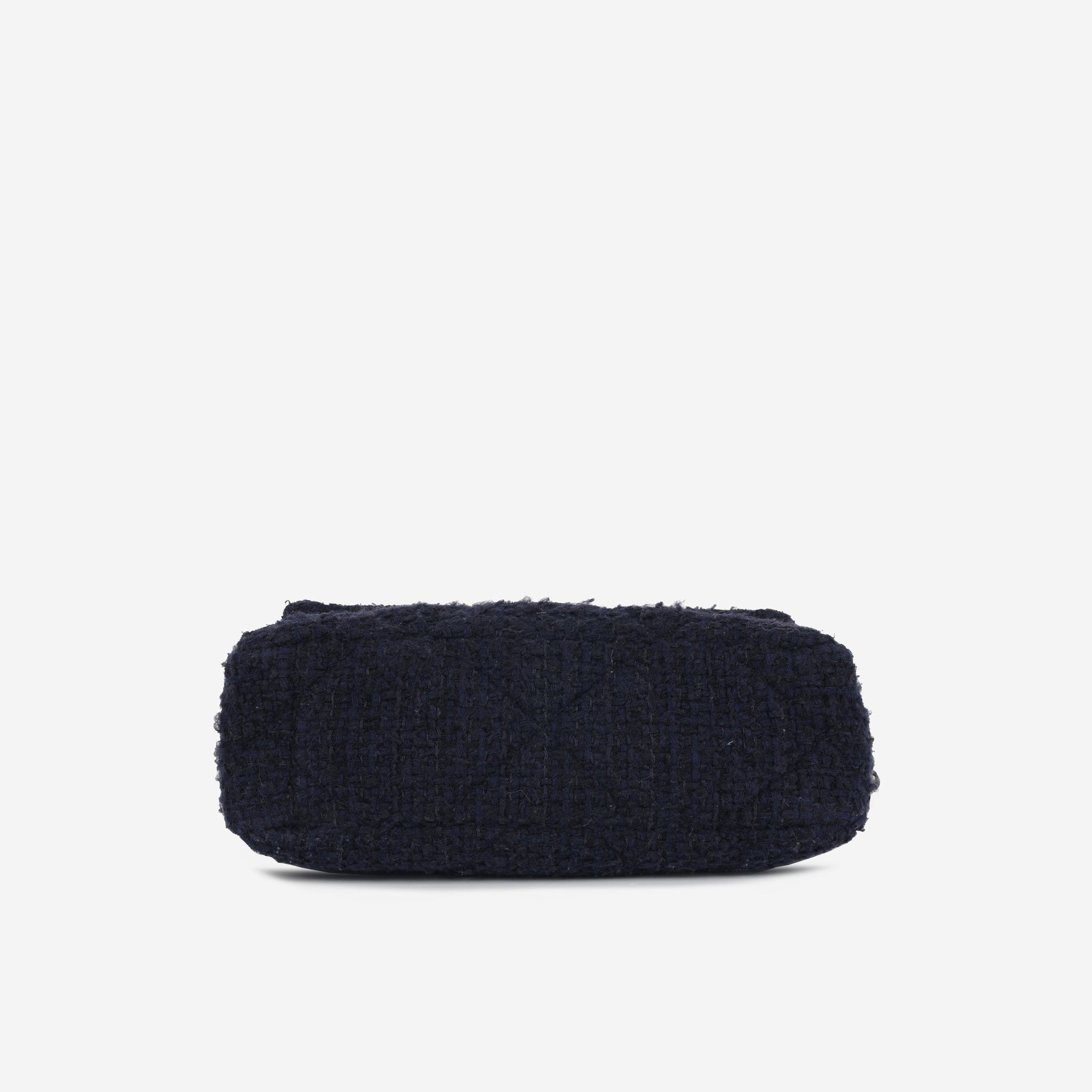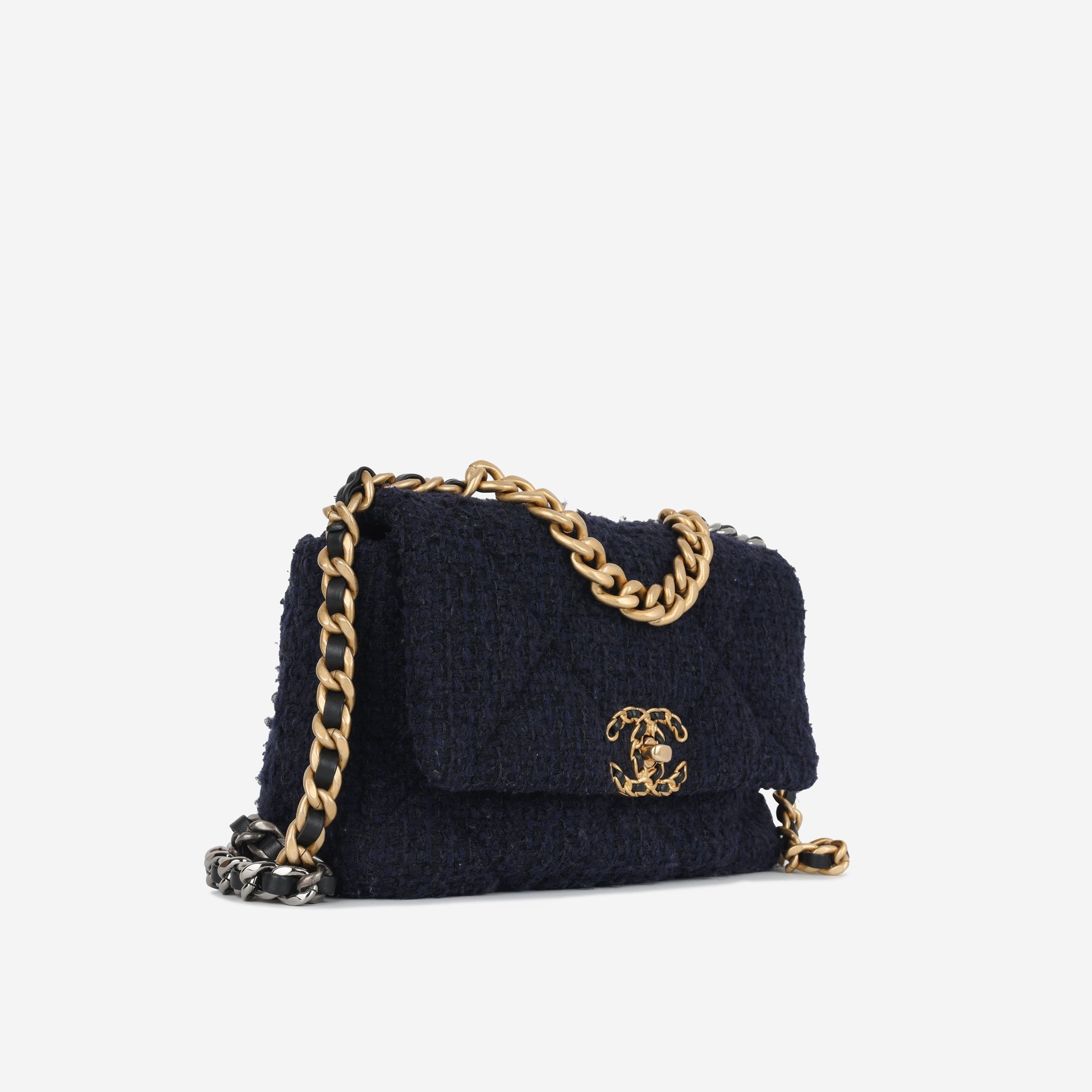 For timeless Parisian-chic there is no better investment than a Chanel flap bag. This particular Chanel 19 is crafted Chanel's bouclé tweed in a navy colour scheme. The interwoven chain sits elegantly on your shoulder or doubled up on your arm. Under the creative direction of Karl Lagerfeld, Chanel continues with its line of classic quilted bags.