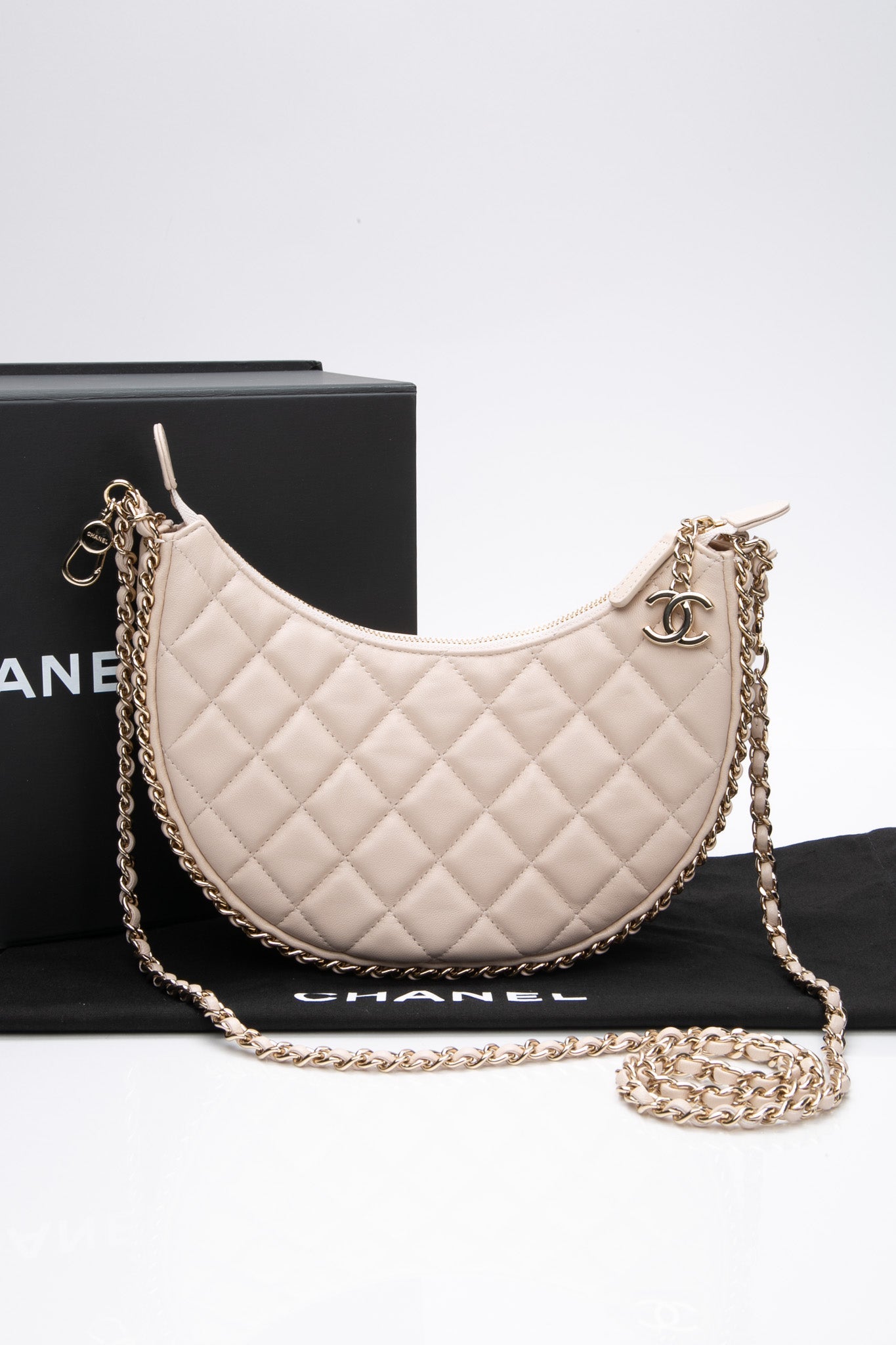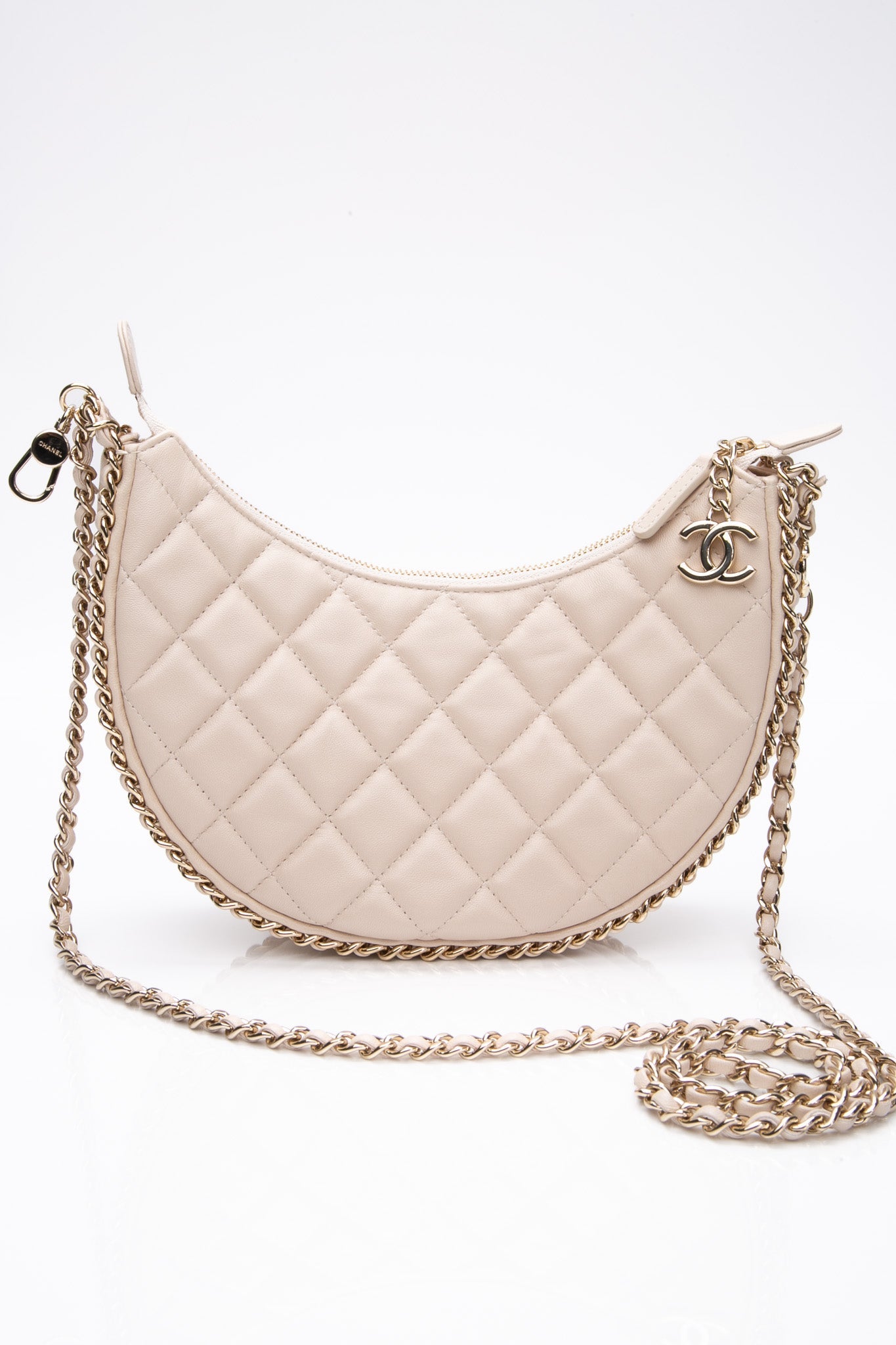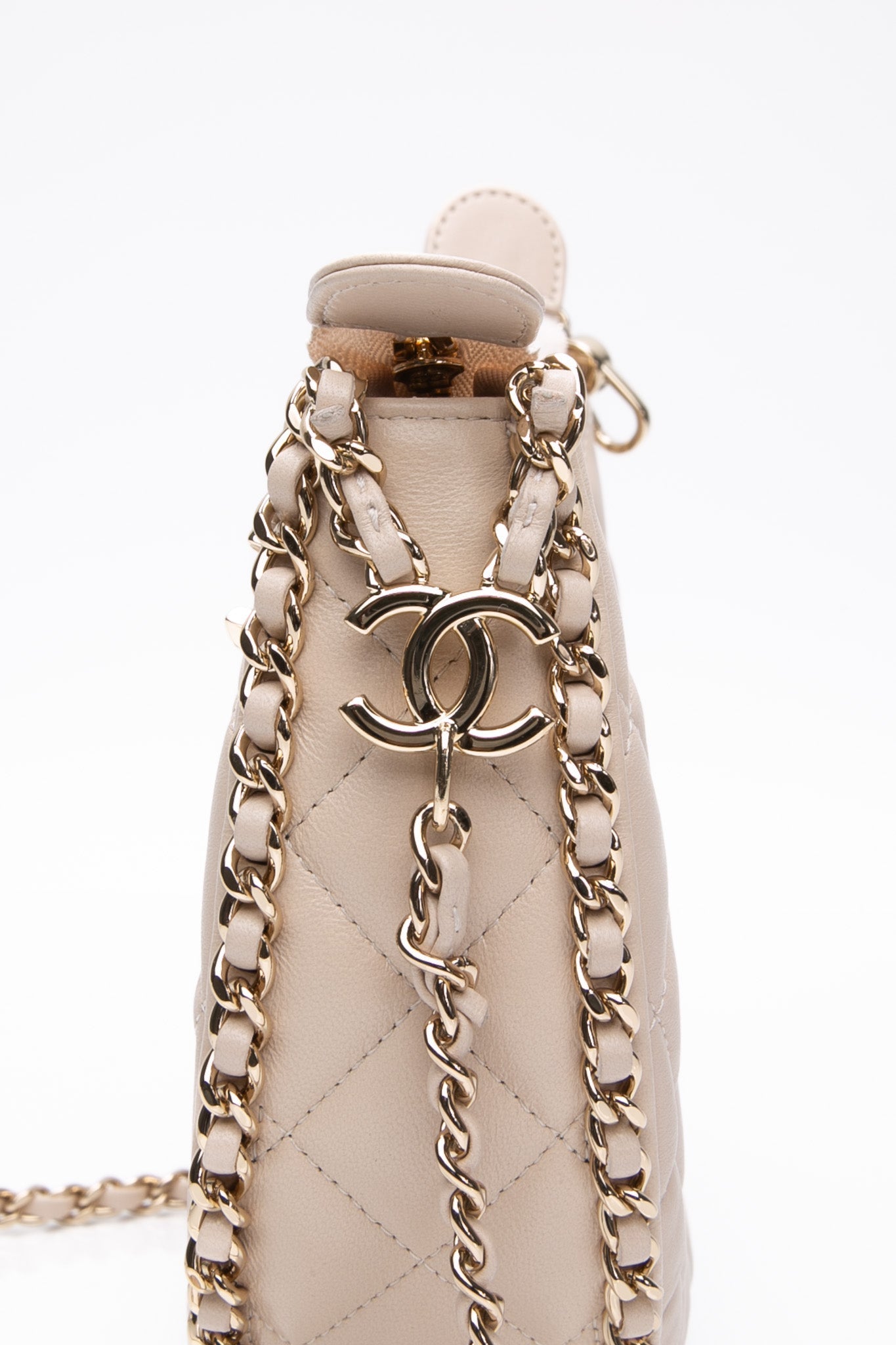 This chic shoulder bag is crafted of diamond-quilted lambskin leather in beige. The bag features a lambskin threaded light gold chain strap lining the edges of the bag with light gold Chanel CC charms. The top unzips to a beige fabric interior.