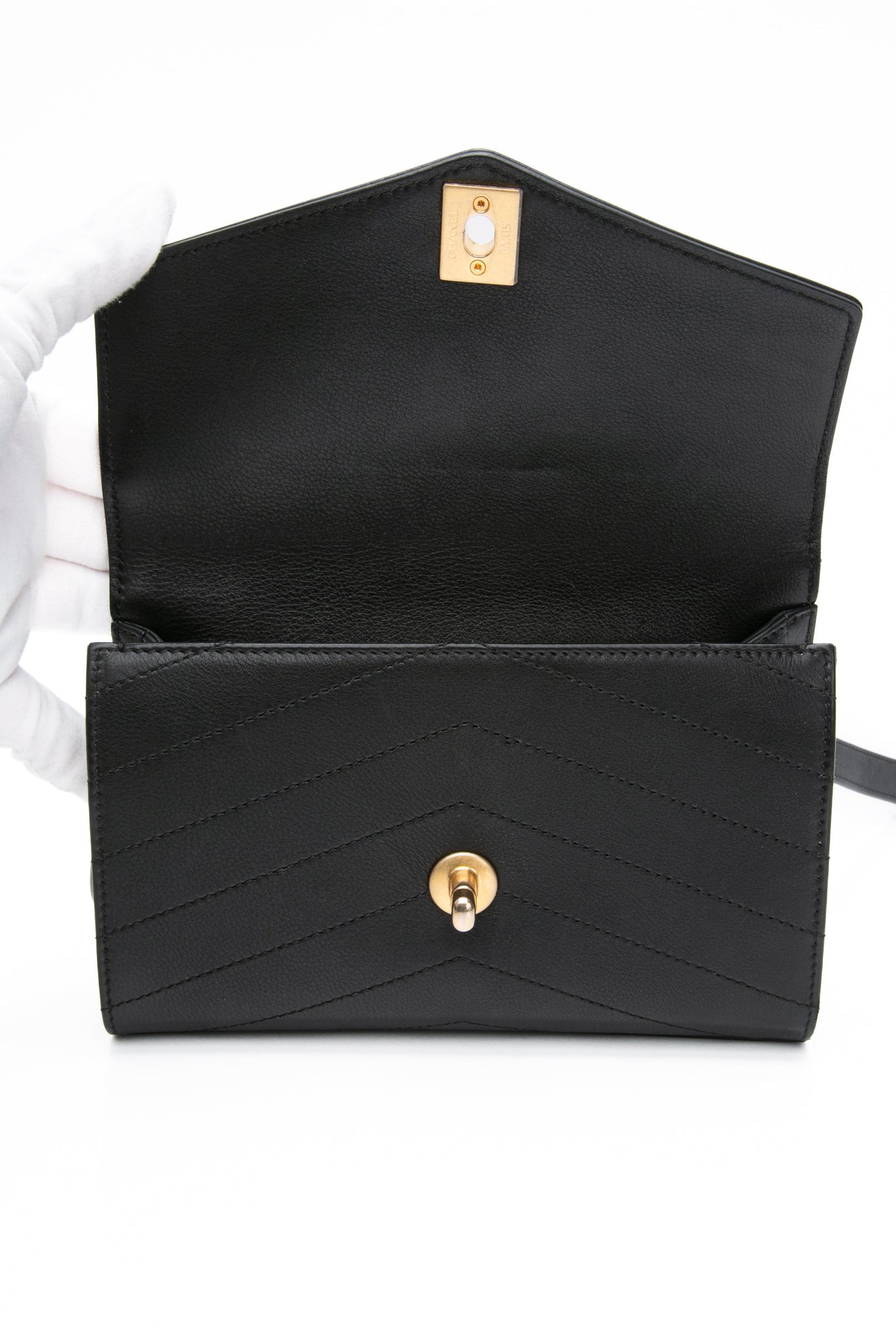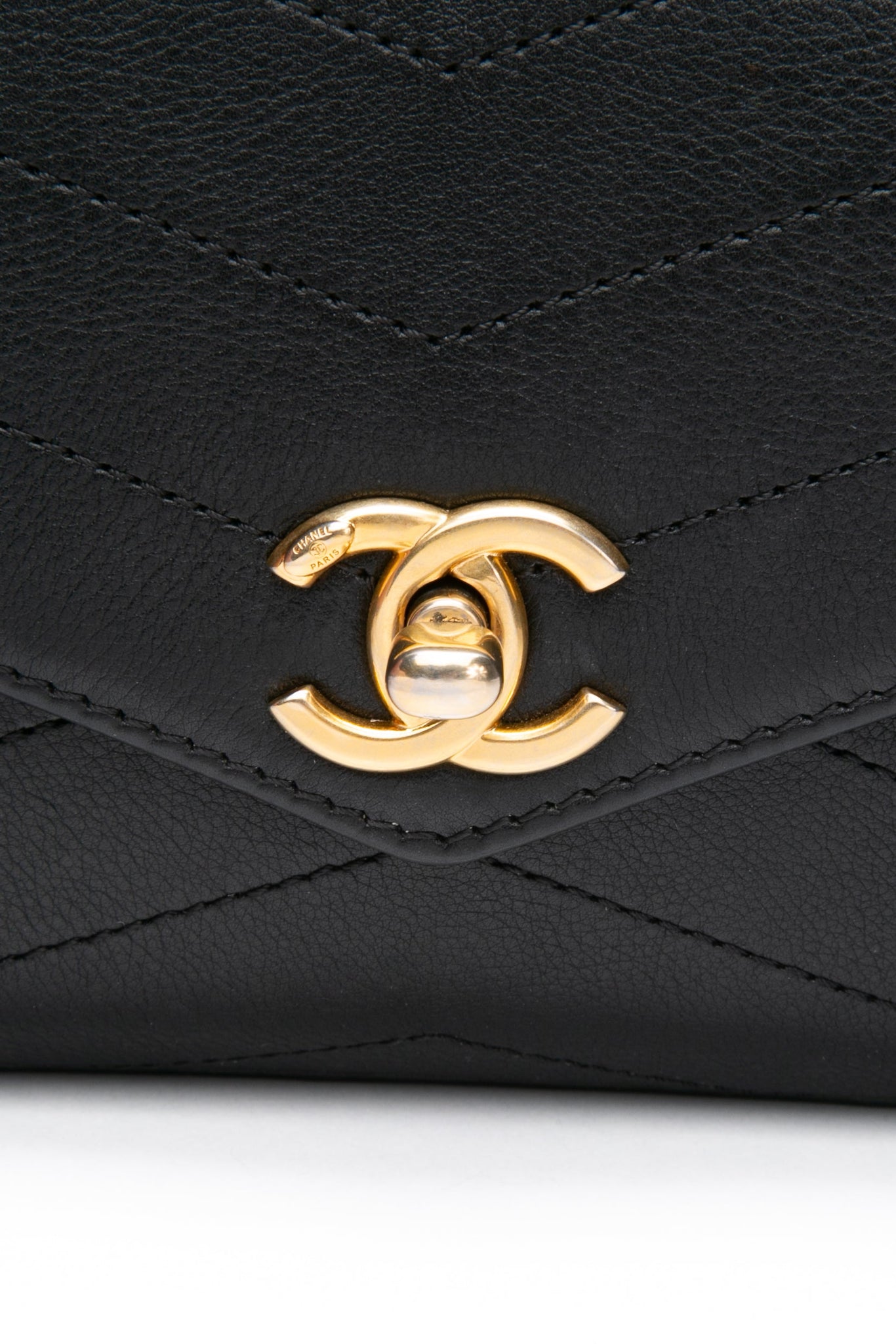 This stylish waist bag is finely crafted of chevron quilted lambskin leather in black. The bag features a gold chain link and leather belt strap and an envelope flap opening with a gold Chanel CC turn lock.