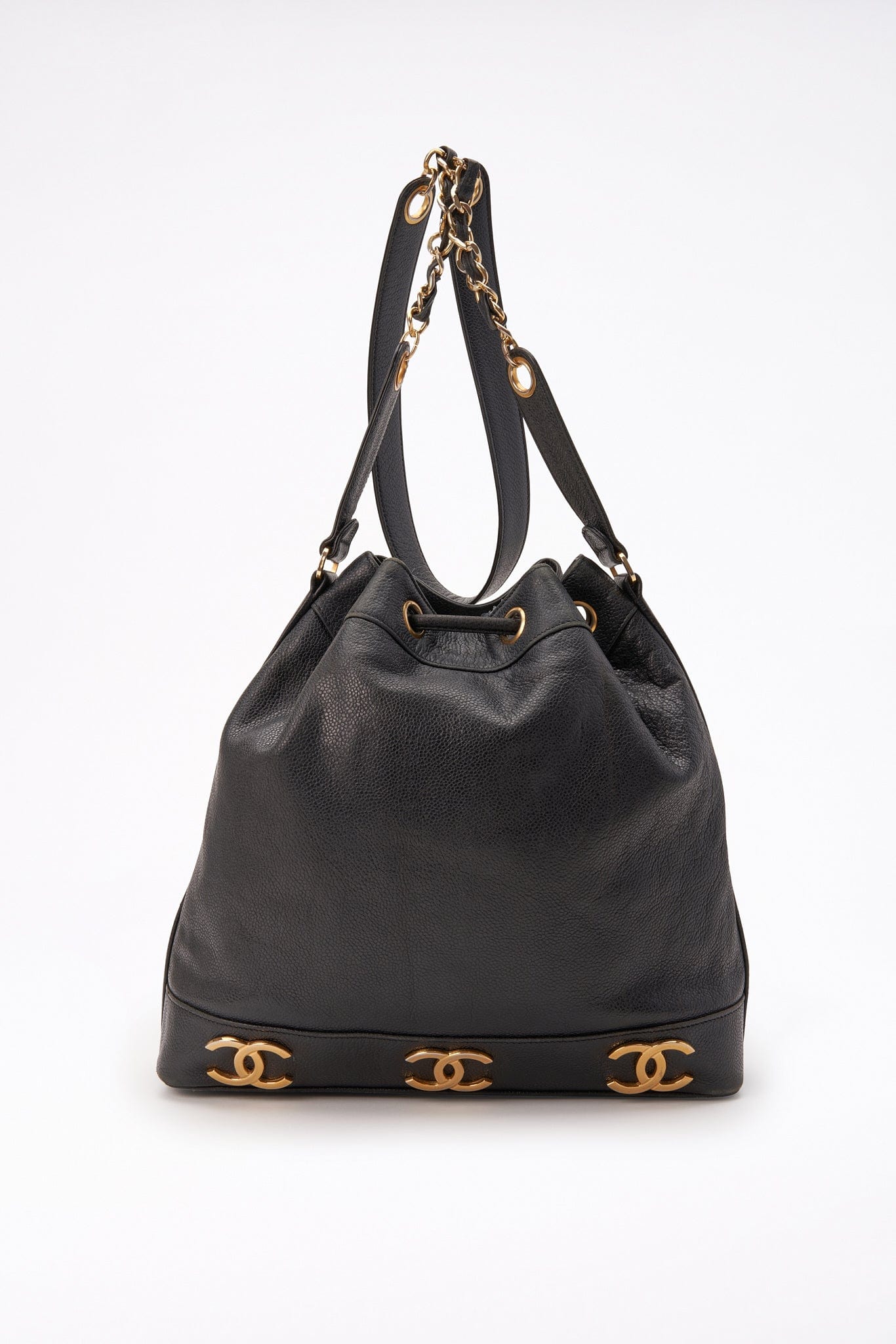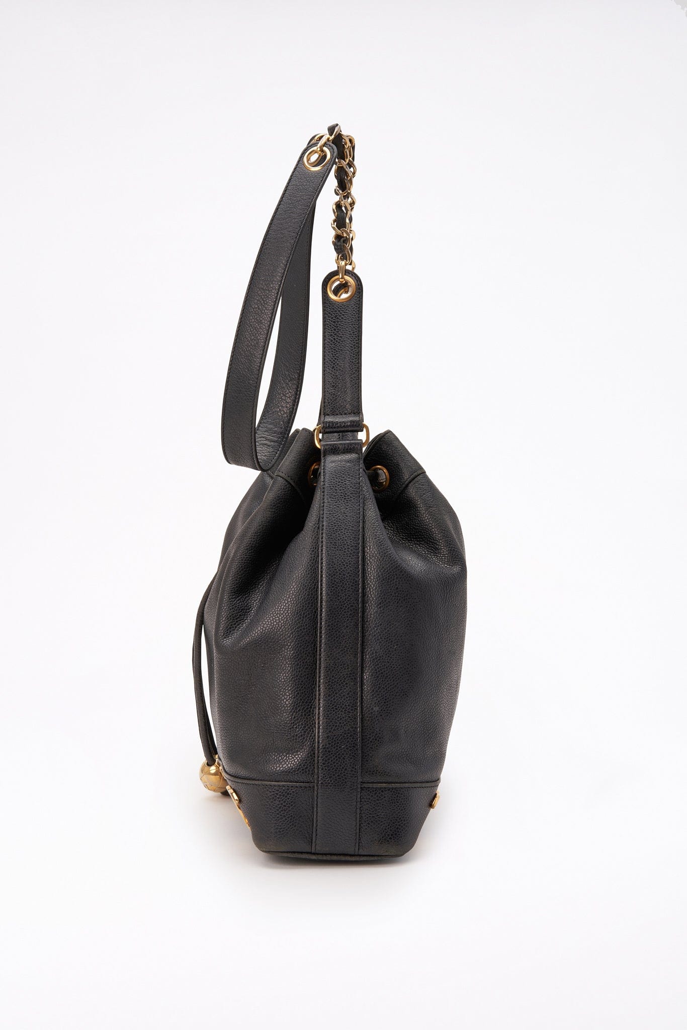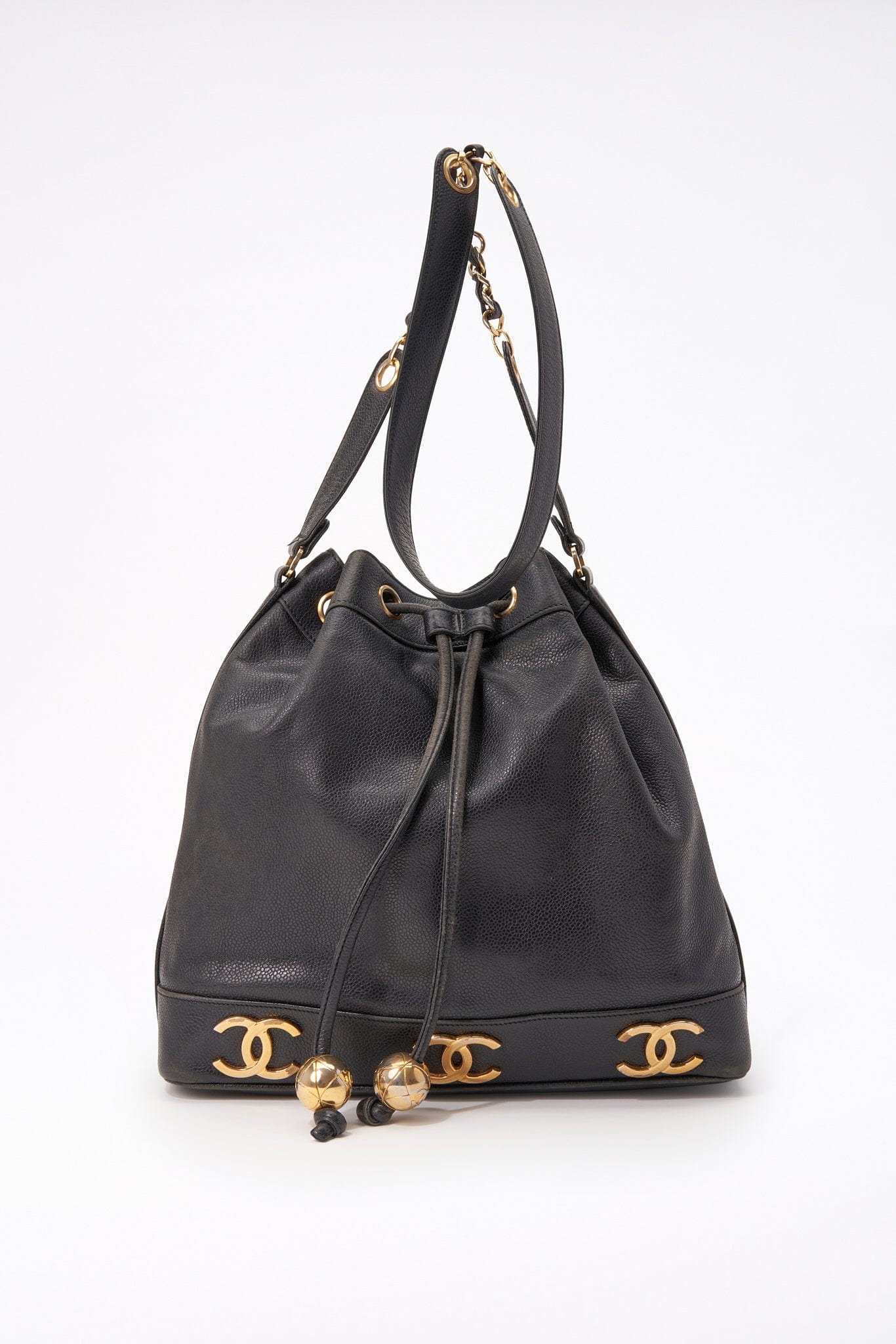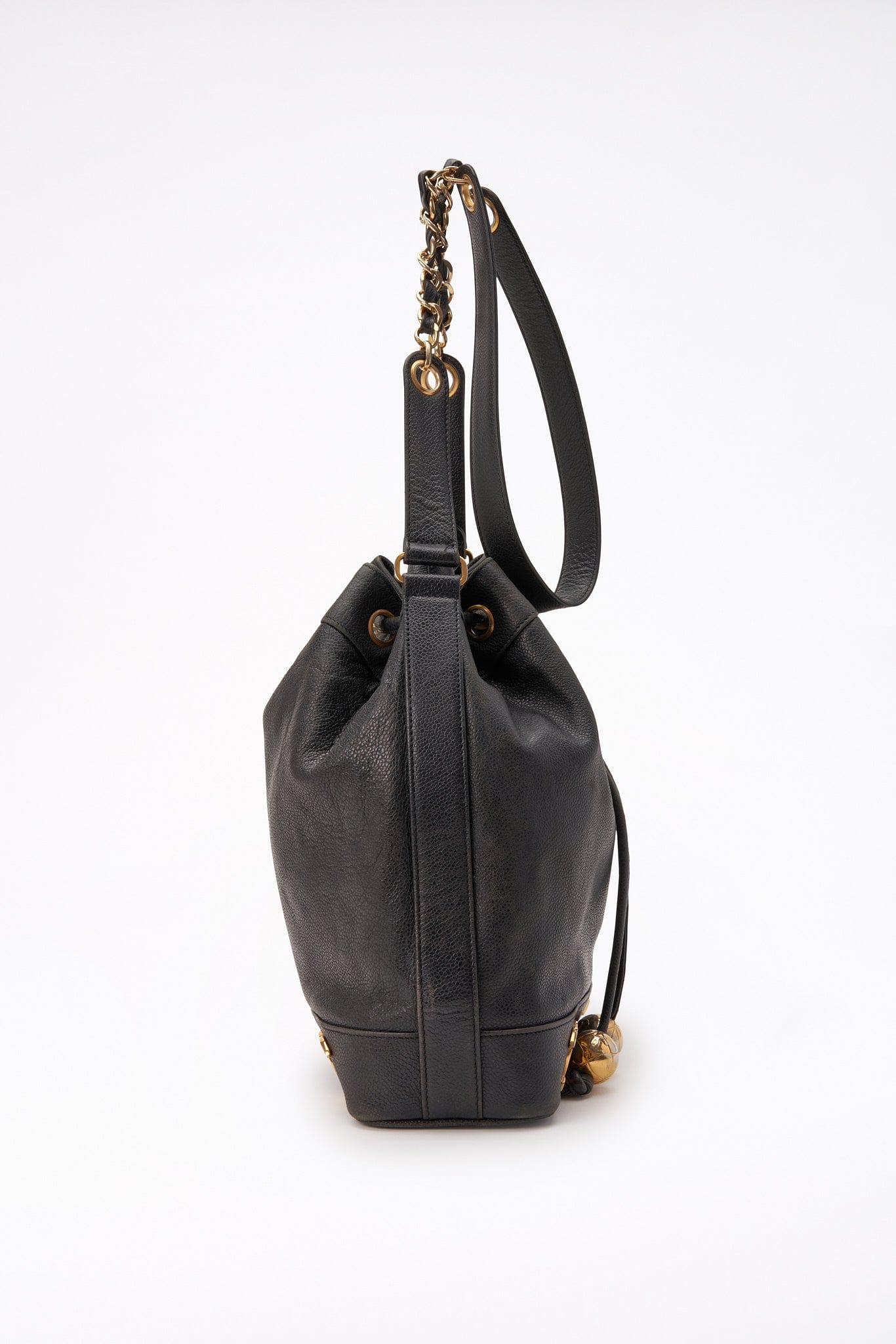 A beautiful vintage Chanel leather bucket tote bag with the iconic CC gold ball charms at the end of drawstring and CC branding at base.