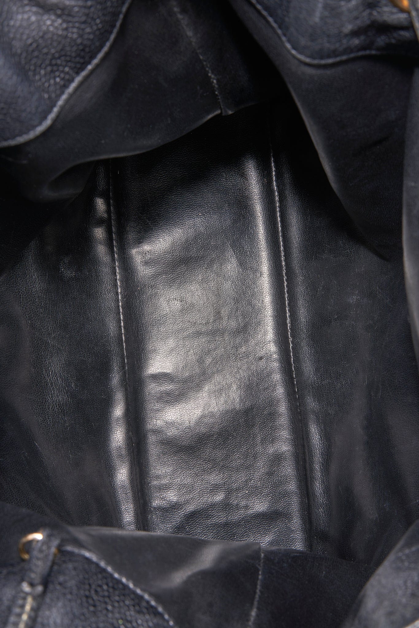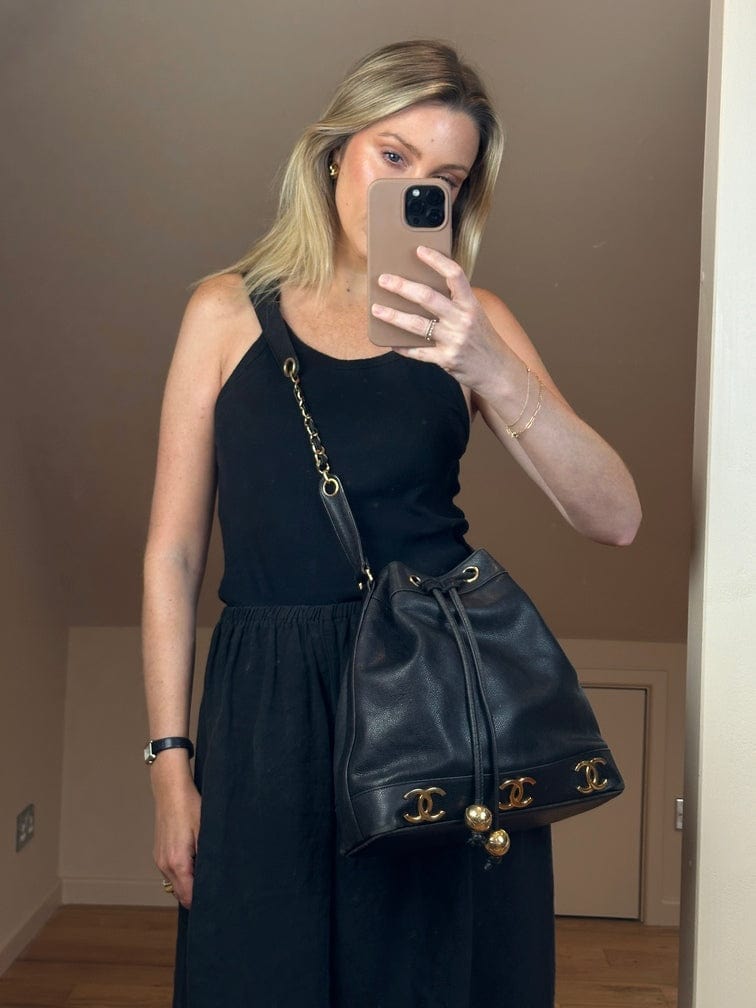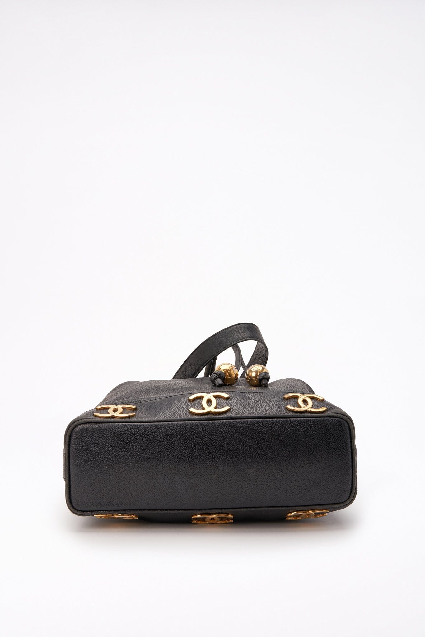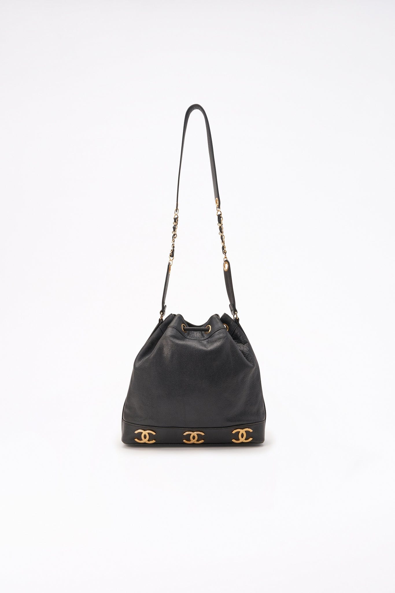 A beautiful vintage Chanel leather bucket tote bag with the iconic CC gold ball charms at the end of drawstring and CC branding at base.
