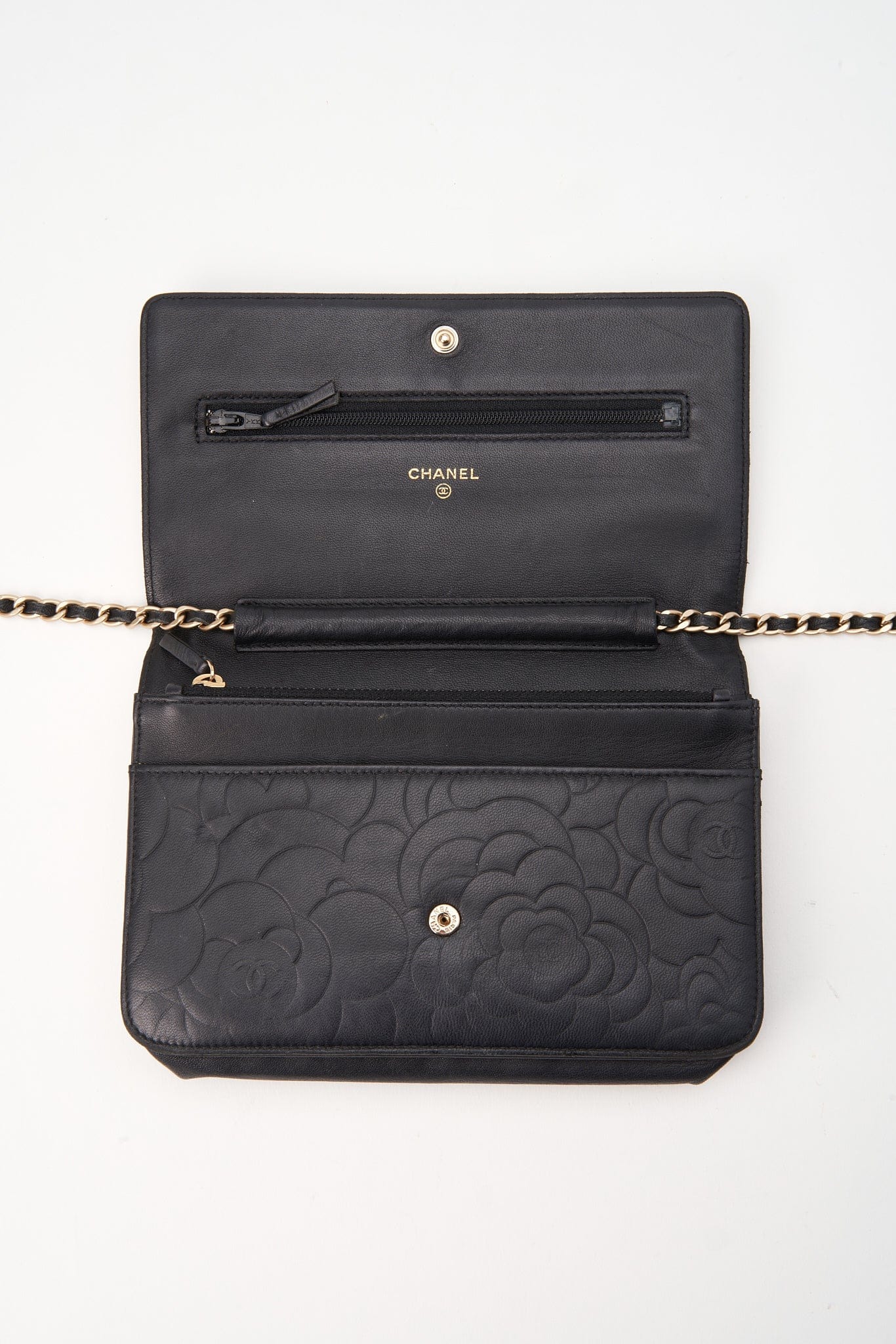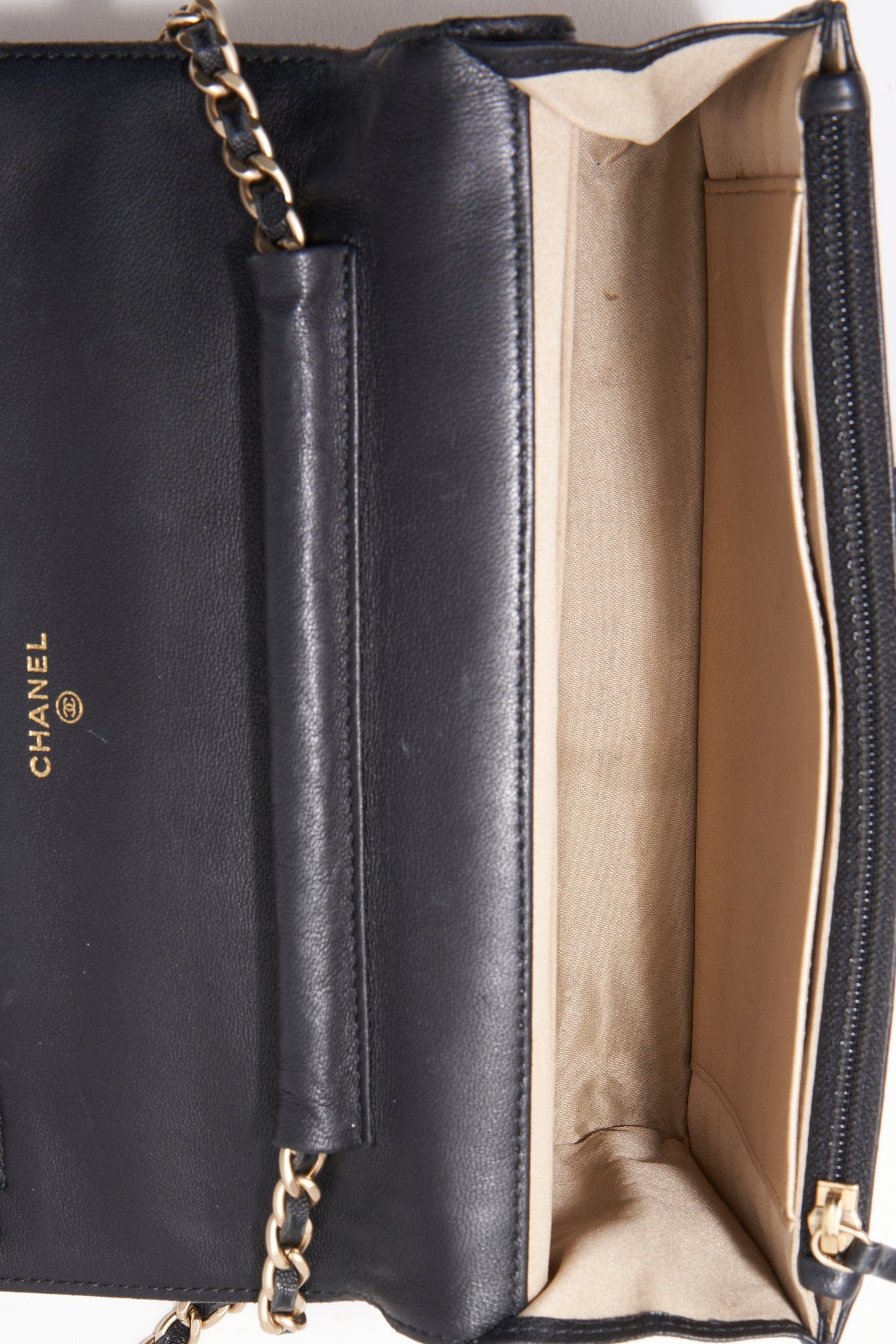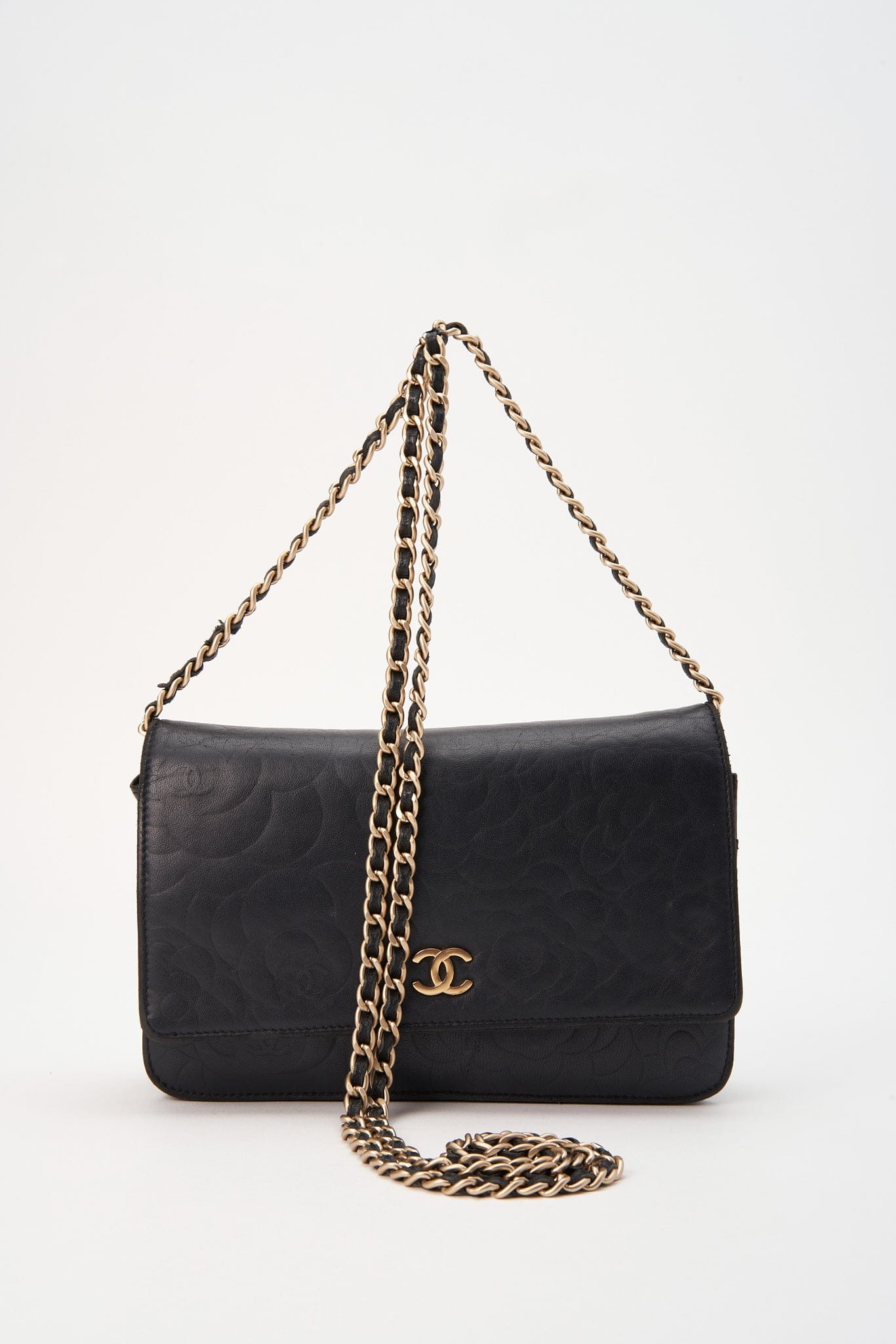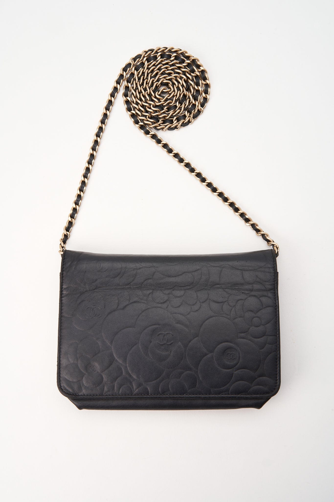 This Chanel wallet on chain, WOC, is crafted with black smooth lambskin leather embossed with a floral pattern, gold hardware and a single leather-trimmed chain-link shoulder strap.