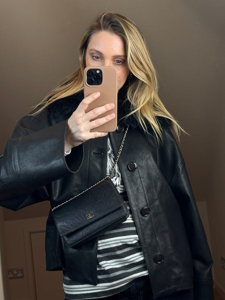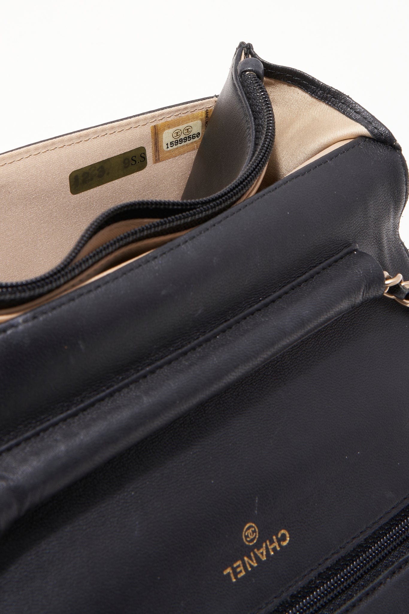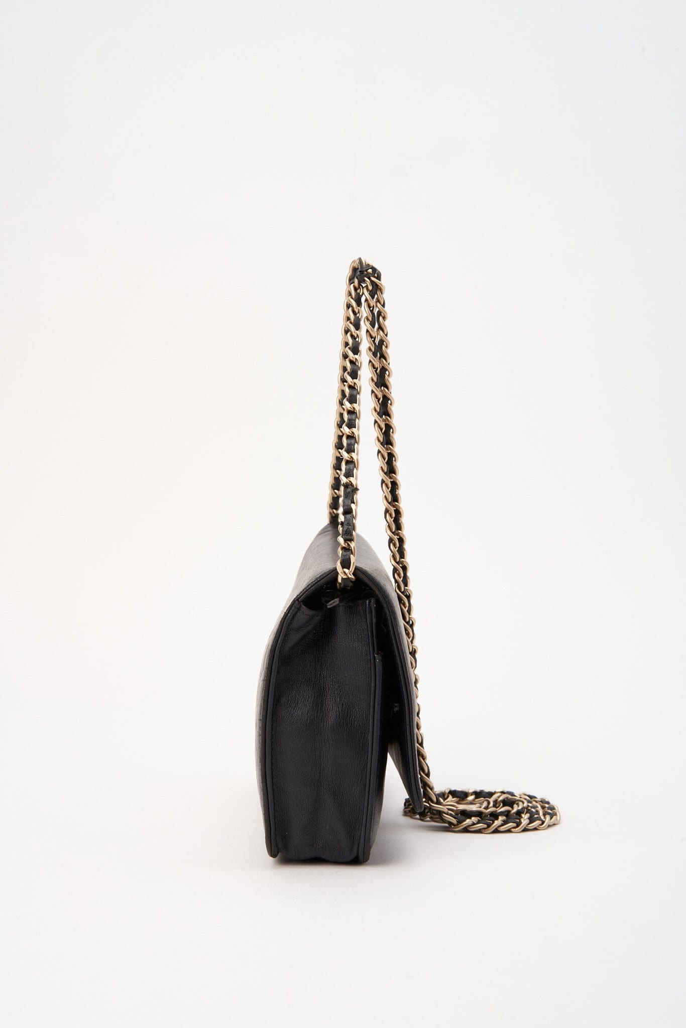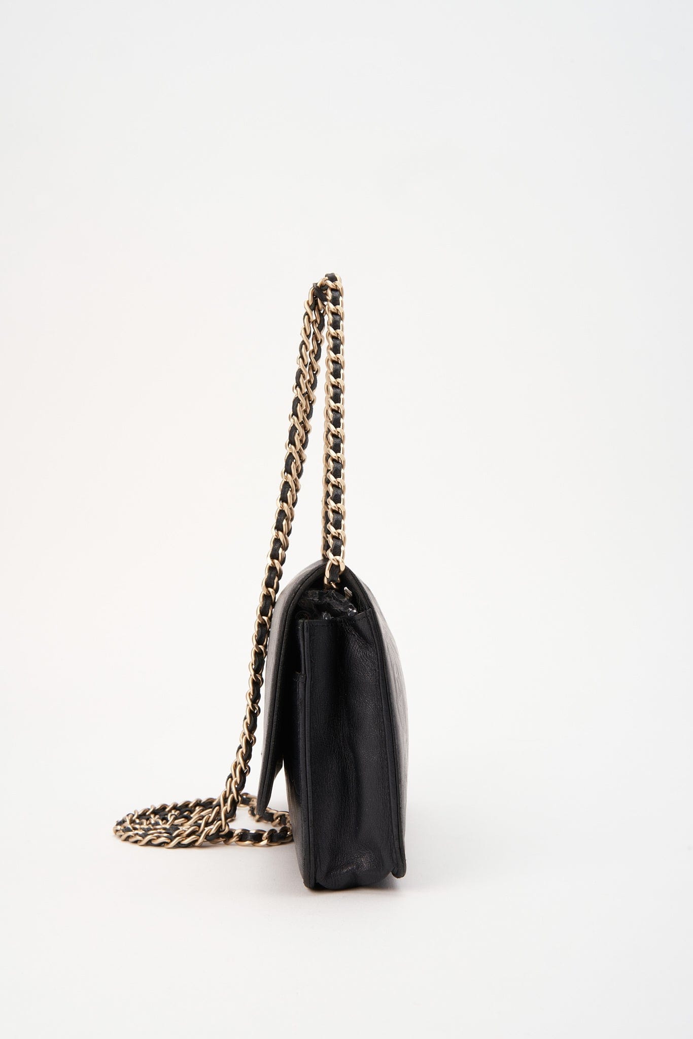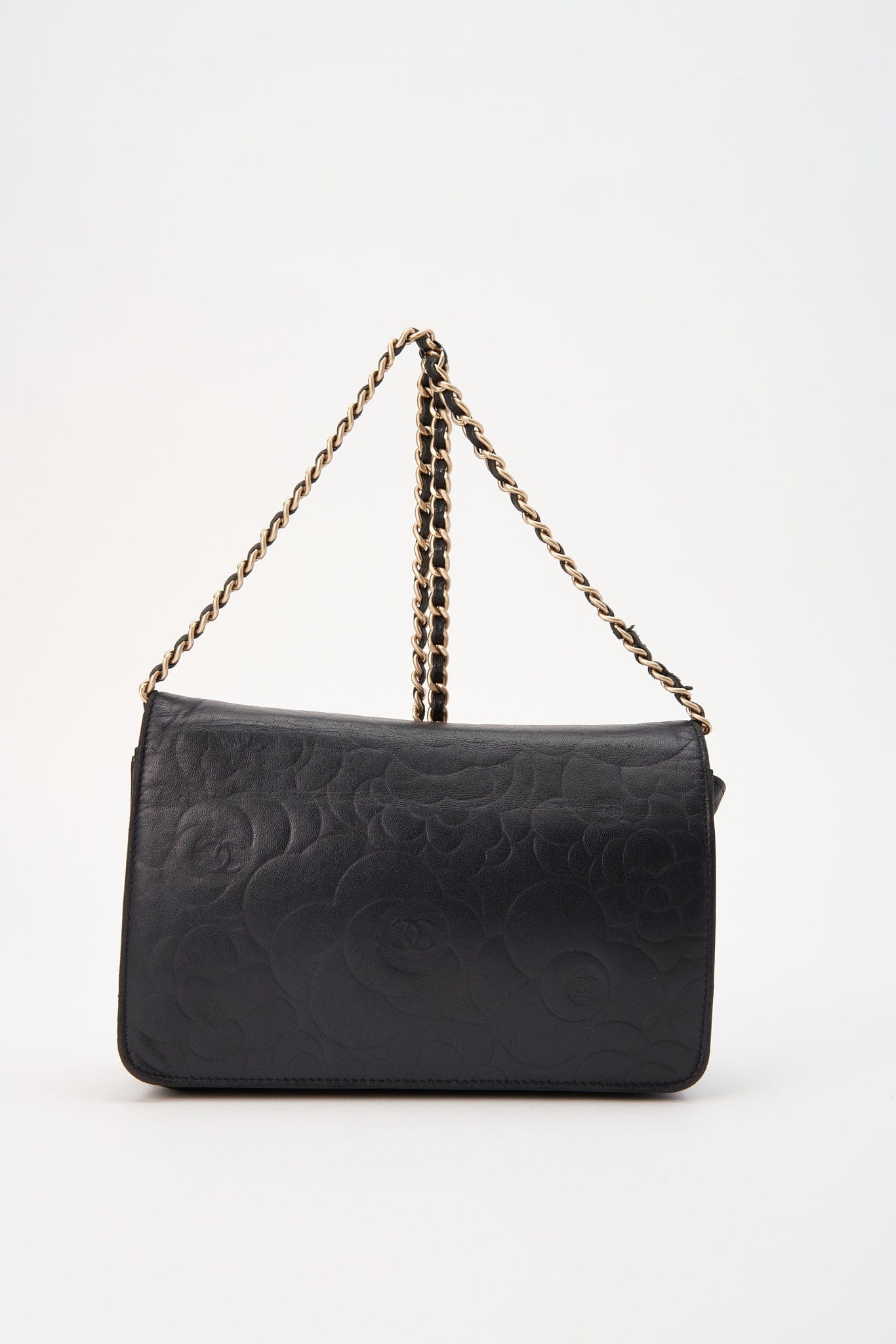 This Chanel wallet on chain, WOC, is crafted with black smooth lambskin leather embossed with a floral pattern, gold hardware and a single leather-trimmed chain-link shoulder strap.