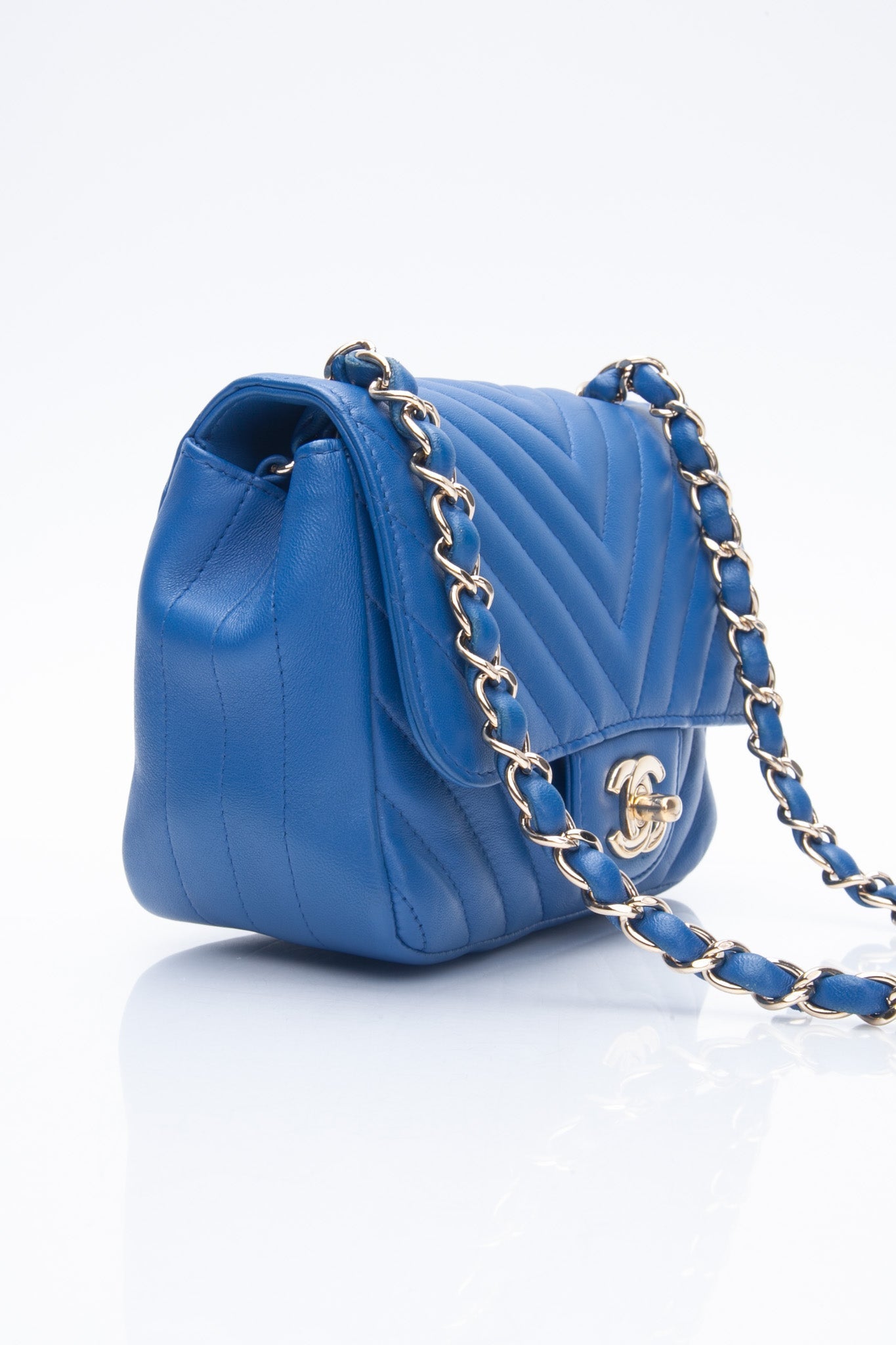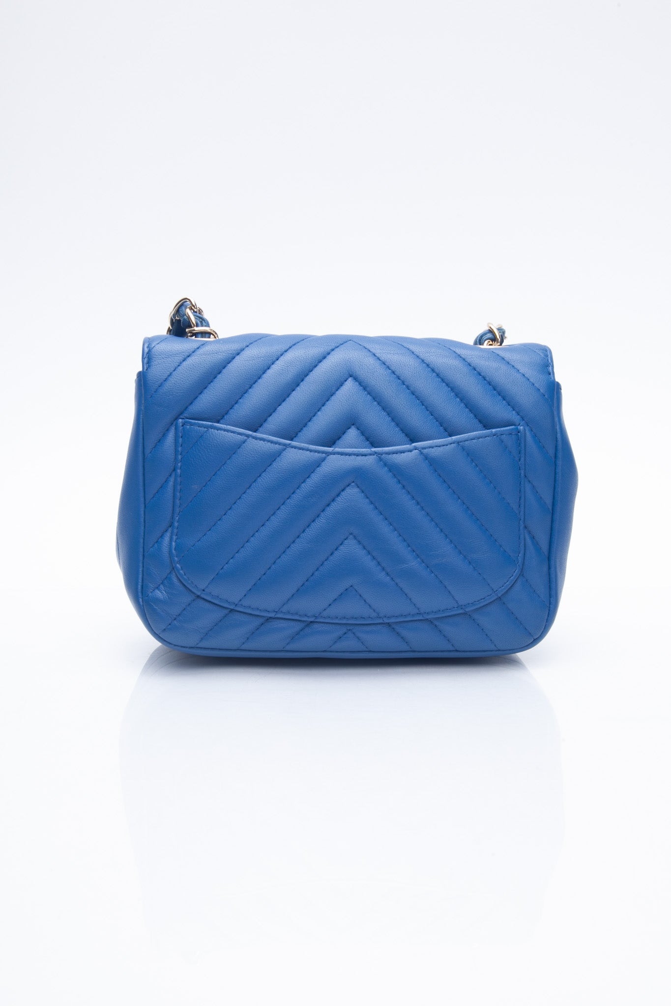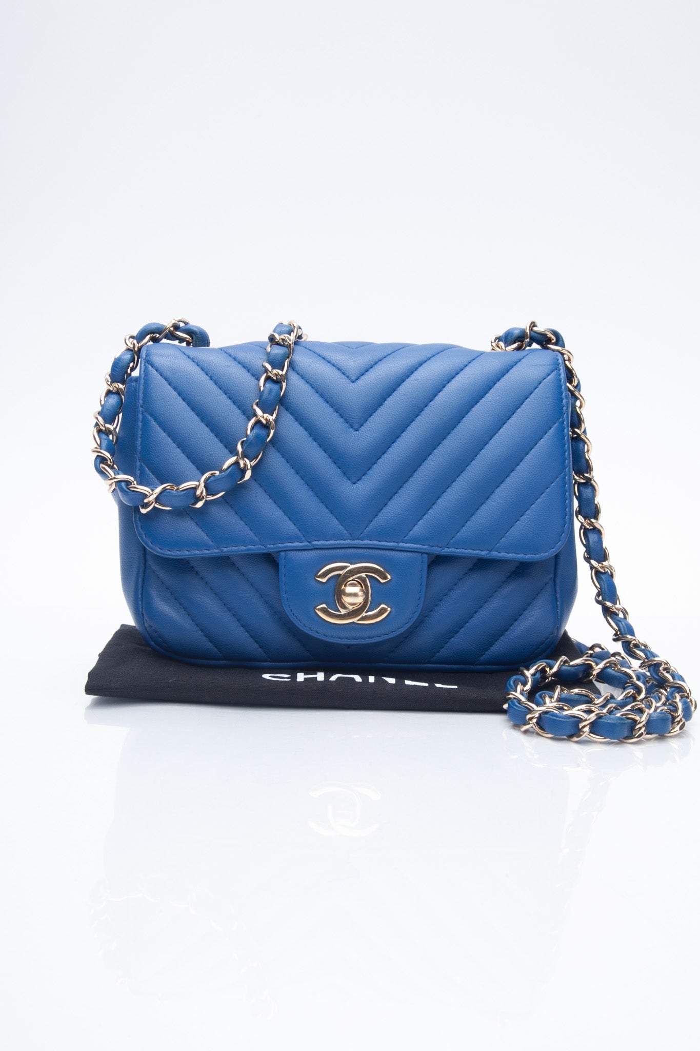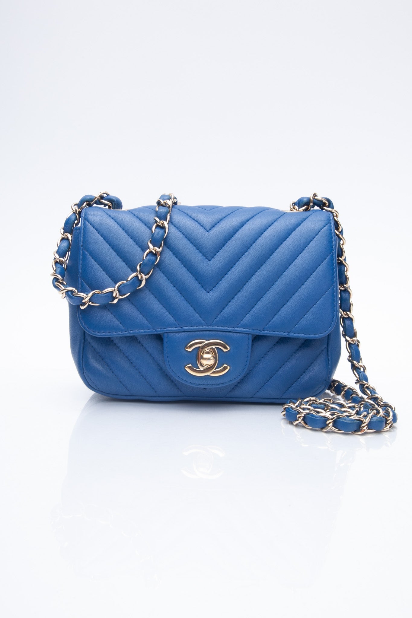 The chic cross-body is finely crafted of luxurious royal blue chevron-quilted lambskin leather. The bag features a leather-threaded gold chain-link shoulder strap and a matching gold classic CC turn-lock on the crossover flap. This opens the bag to a smooth blue leather interior with zipper and patch pocket.