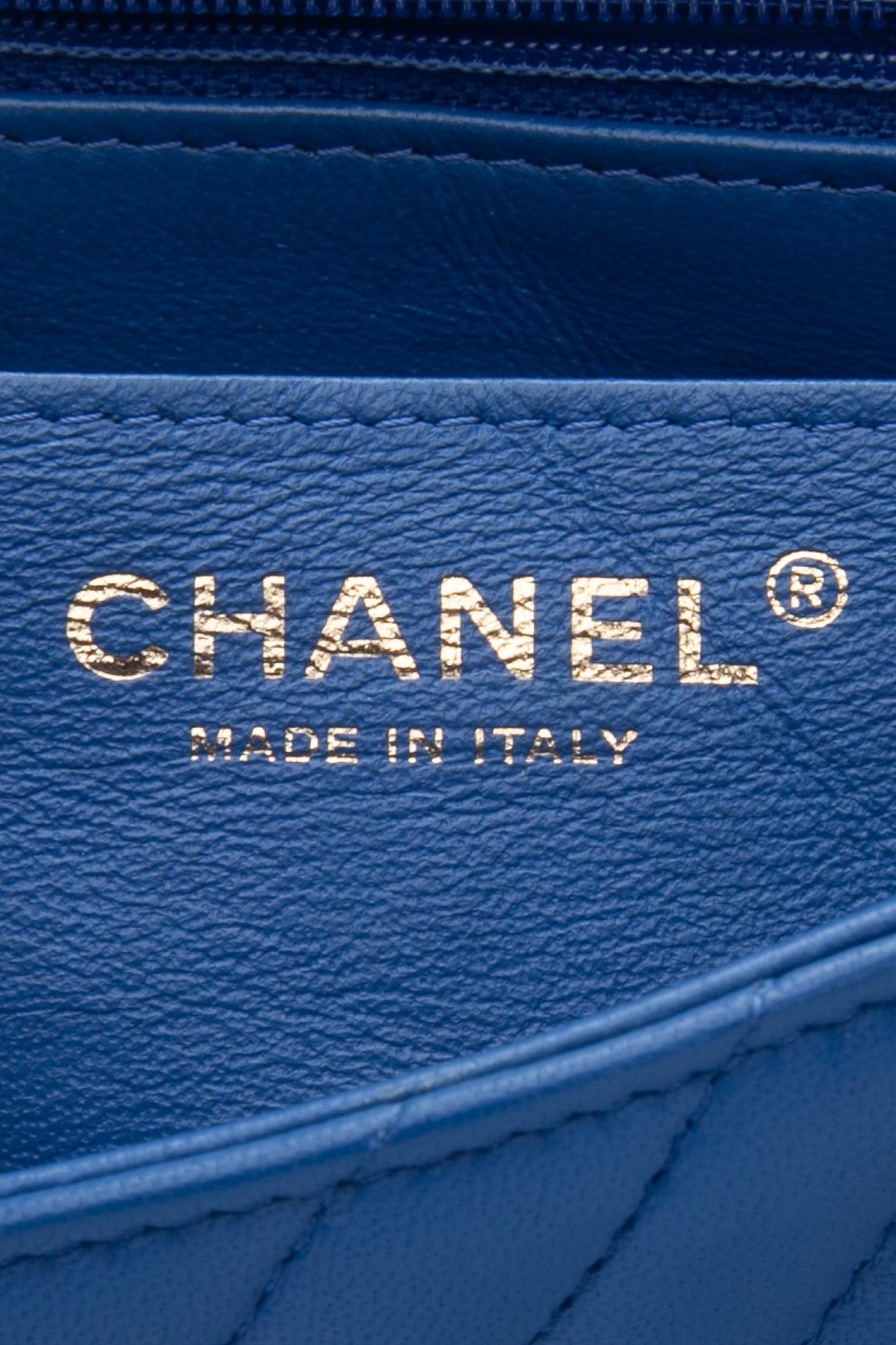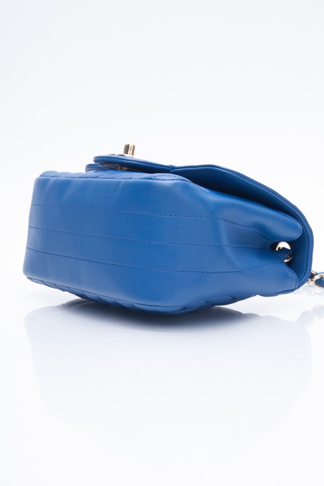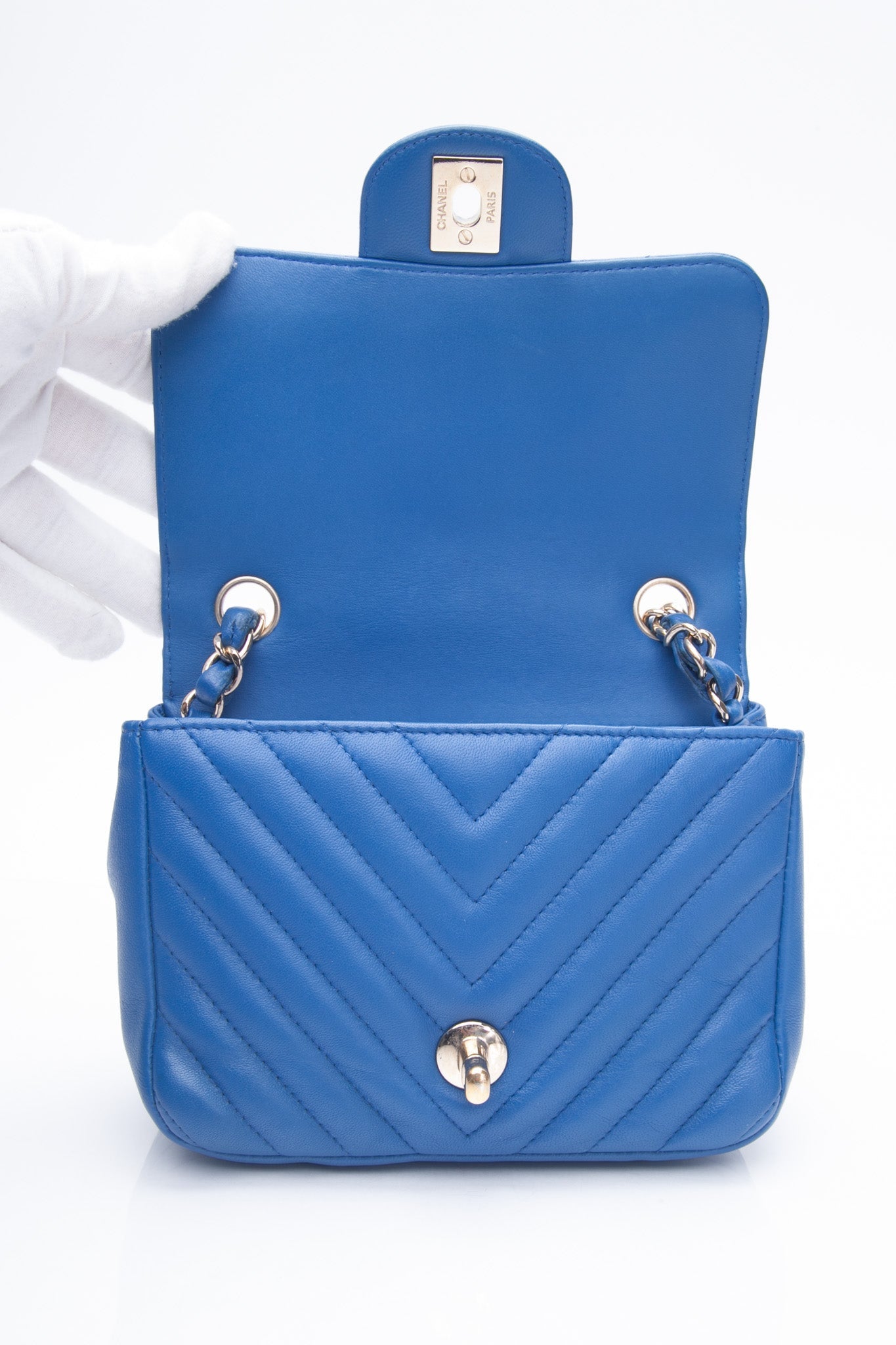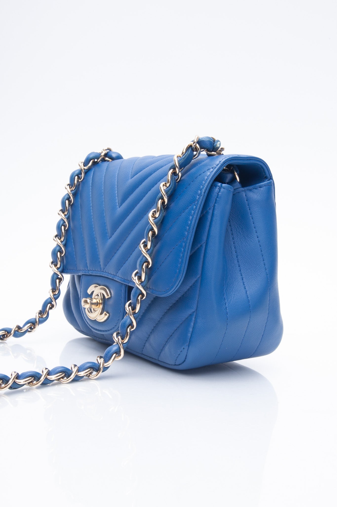 The chic cross-body is finely crafted of luxurious royal blue chevron-quilted lambskin leather. The bag features a leather-threaded gold chain-link shoulder strap and a matching gold classic CC turn-lock on the crossover flap. This opens the bag to a smooth blue leather interior with zipper and patch pocket.