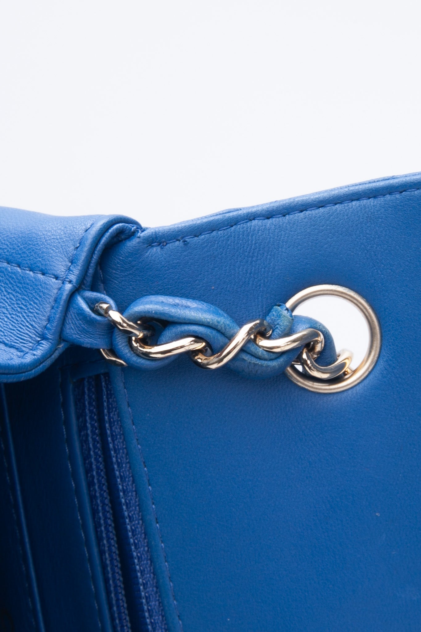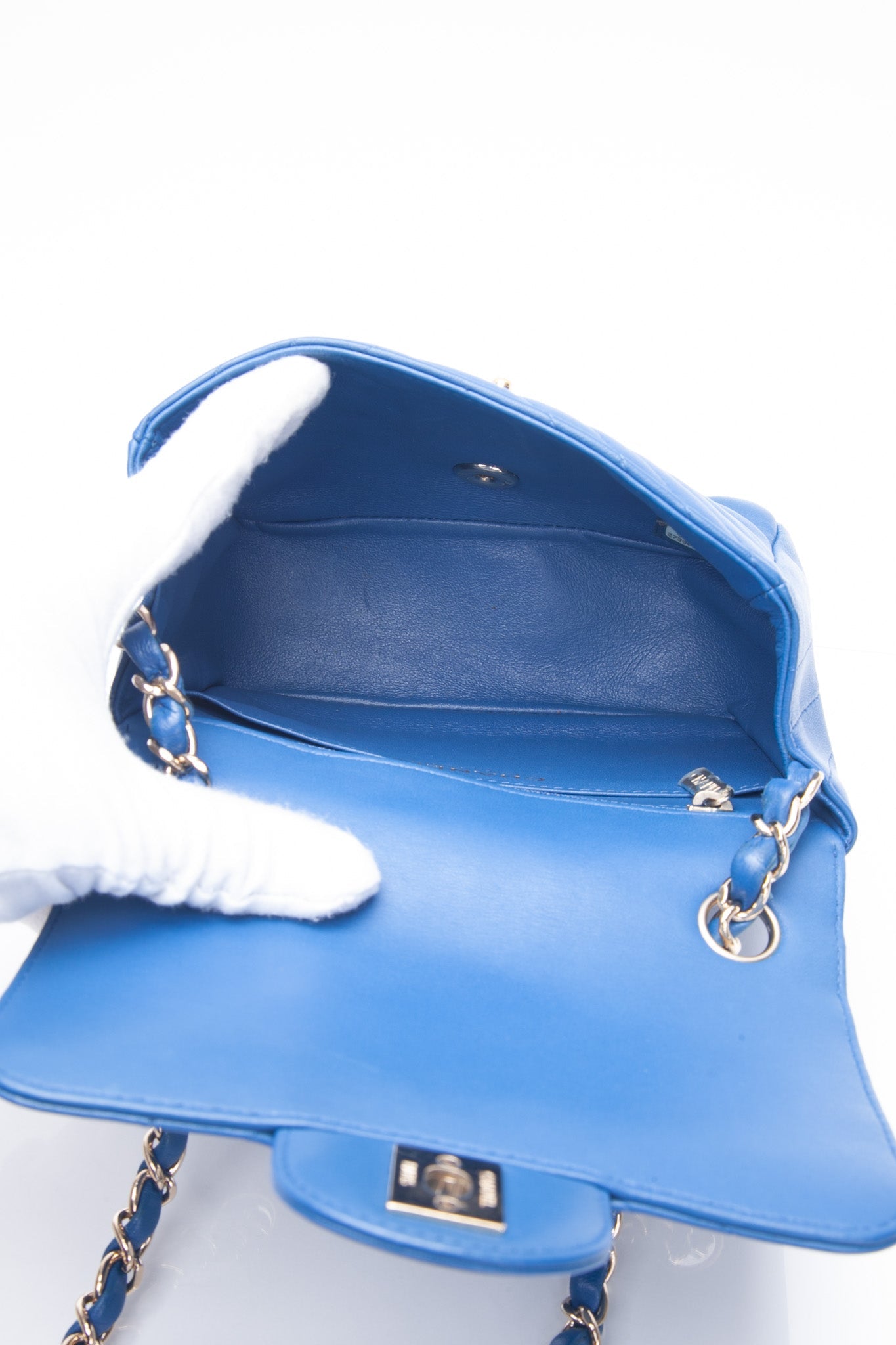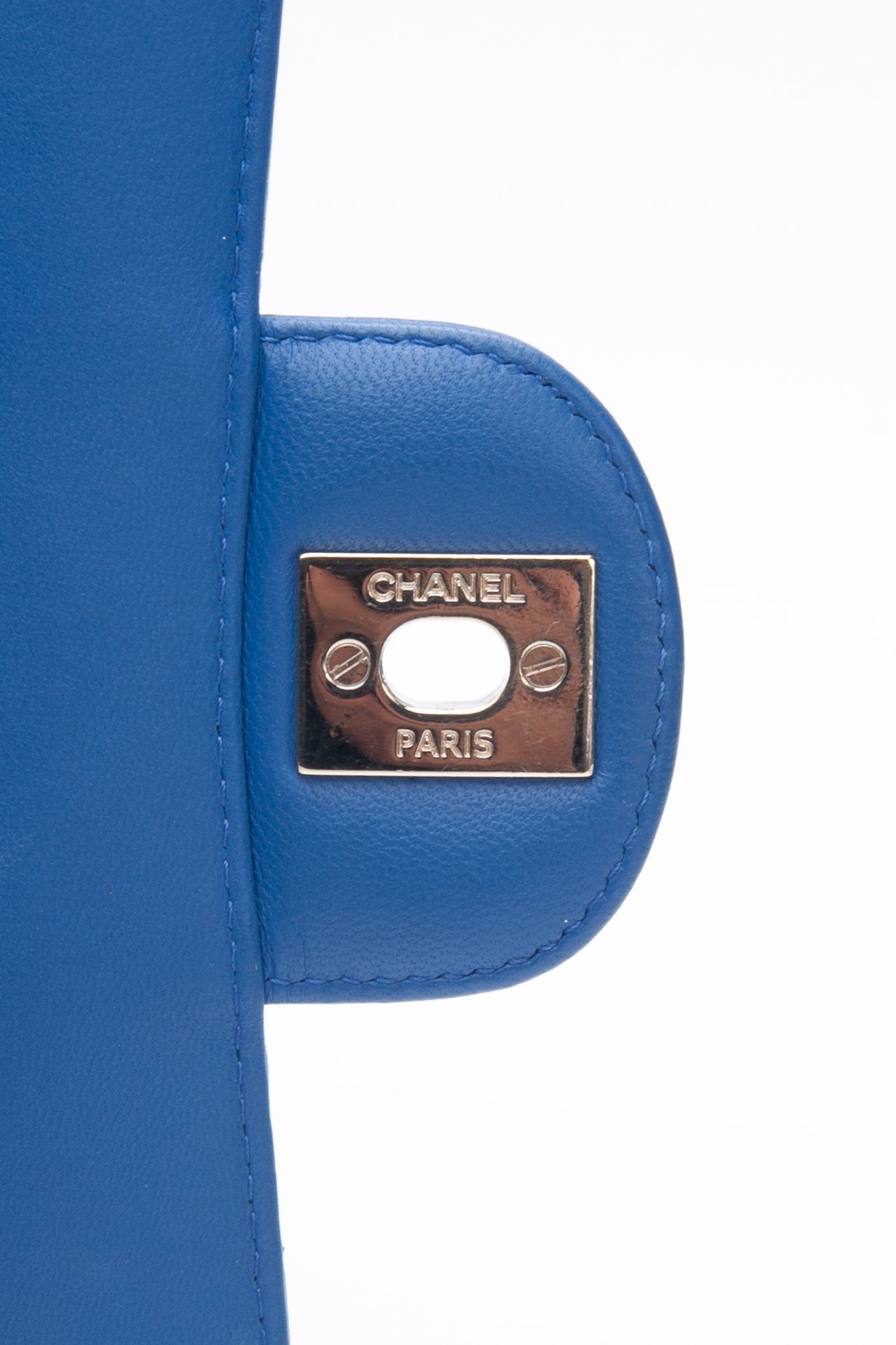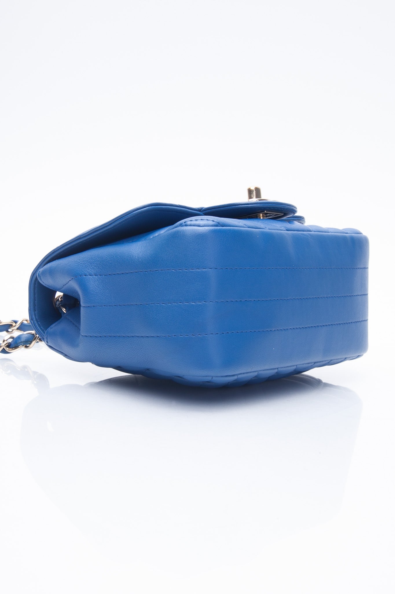 The chic cross-body is finely crafted of luxurious royal blue chevron-quilted lambskin leather. The bag features a leather-threaded gold chain-link shoulder strap and a matching gold classic CC turn-lock on the crossover flap. This opens the bag to a smooth blue leather interior with zipper and patch pocket.