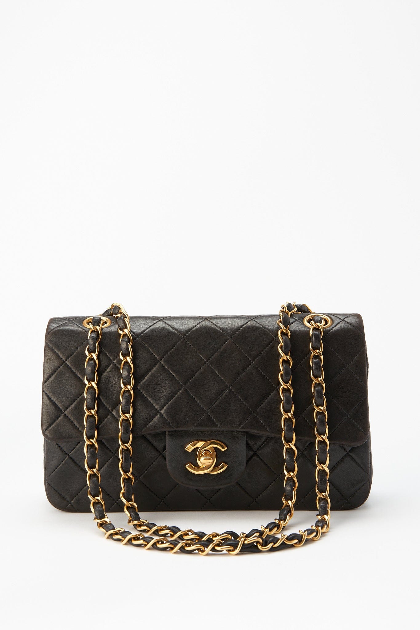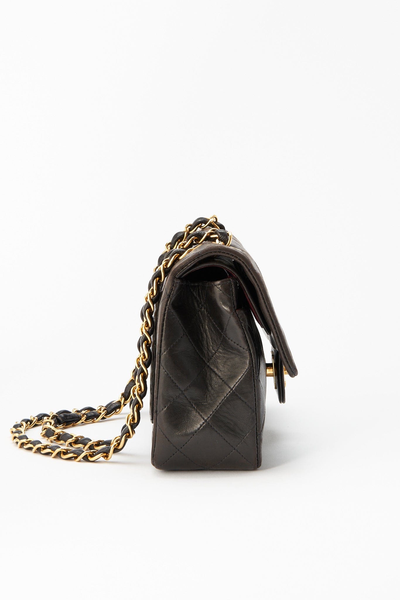 This vintage Classic Chanel Small Flap bag is crafted from black diamond quilted lambskin leather with 24k gold-plated hardware and a single convertible leather-trimmed chain-link shoulder strap. There is a single exterior patch pocket on the back, a single zip pocket under the front flap and three interior compartments. Inside the bag is lined with the classic maroon leather.
