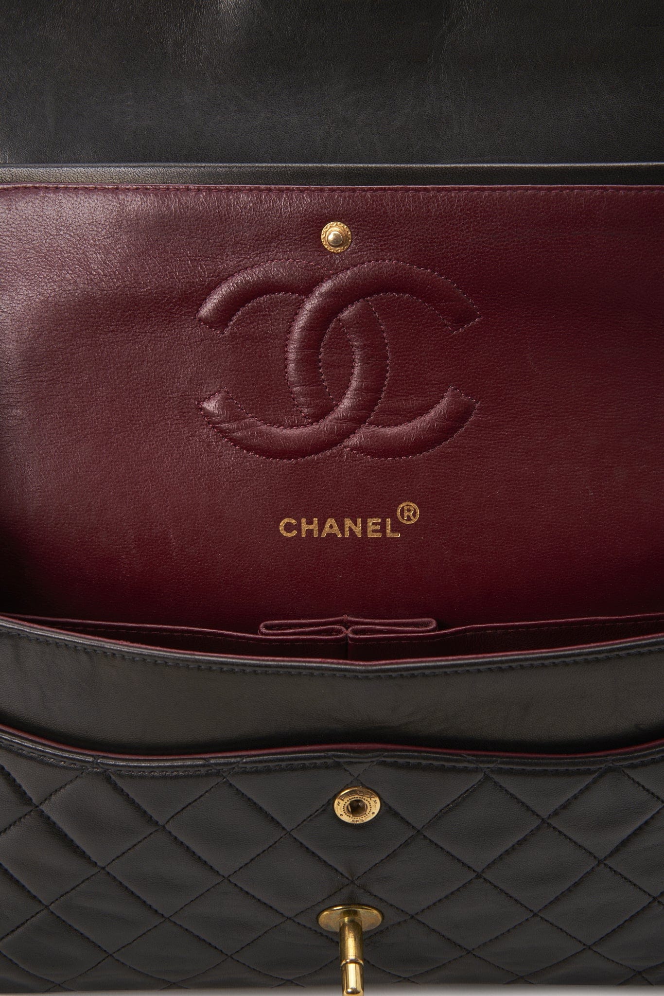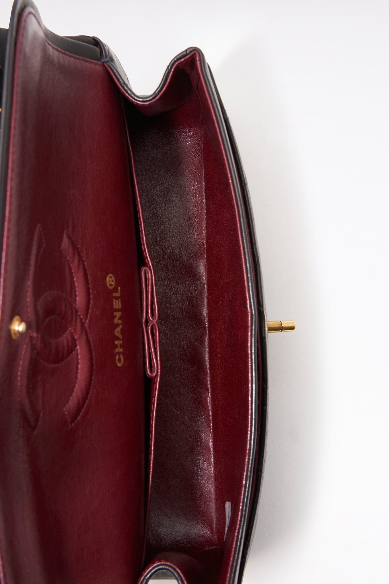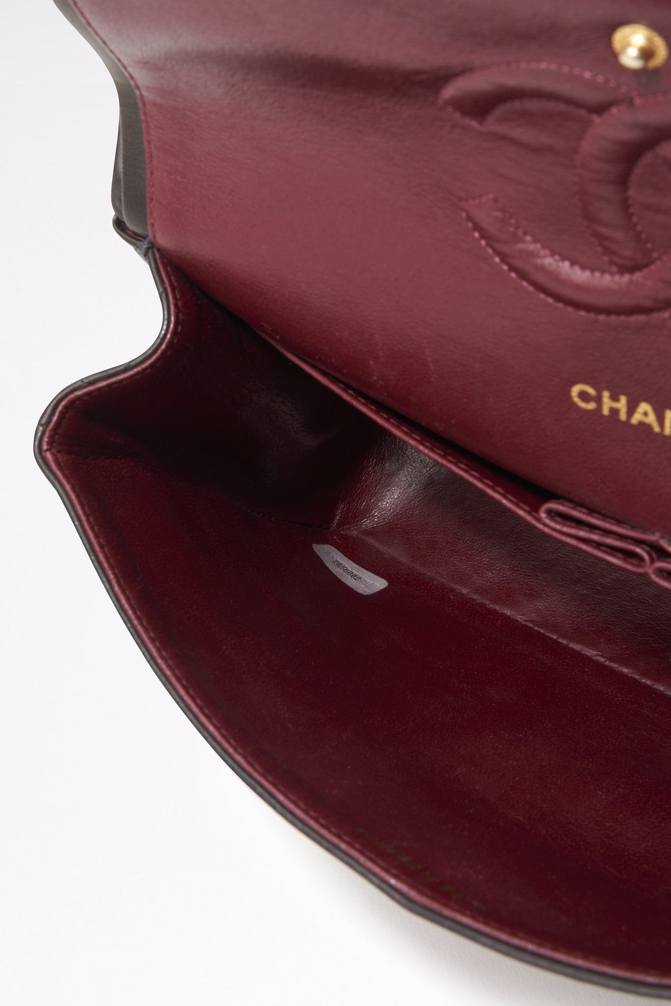 This vintage Classic Chanel Medium Flap bag is crafted with diamond quilted lambskin leather with 24k gold-plated hardware and a single convertible leather-trimmed chain-link shoulder strap. There is a single exterior patch pocket on the back, a single zip pocket under the front flap and three interior compartments. Inside the bag is lined with maroon leather.