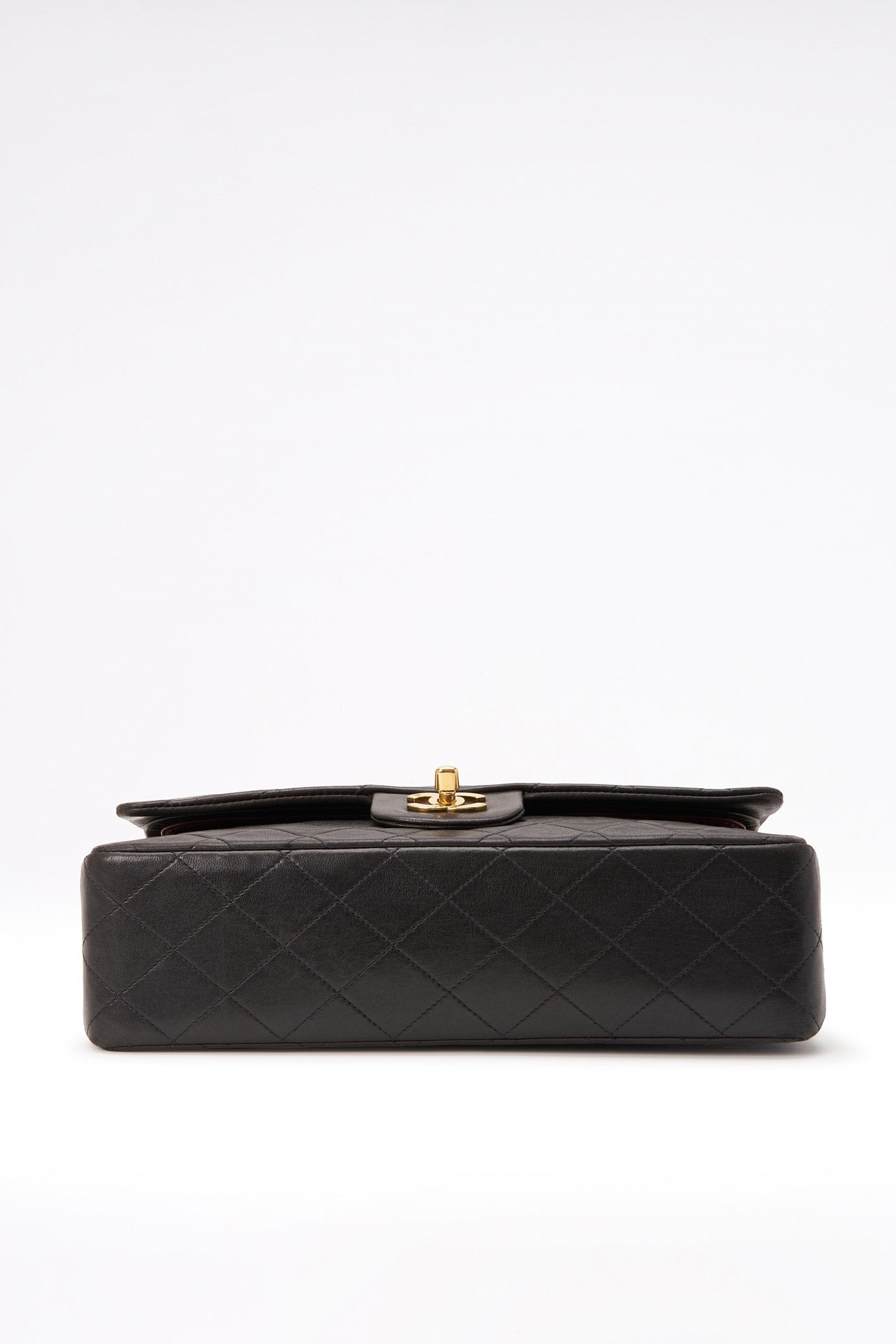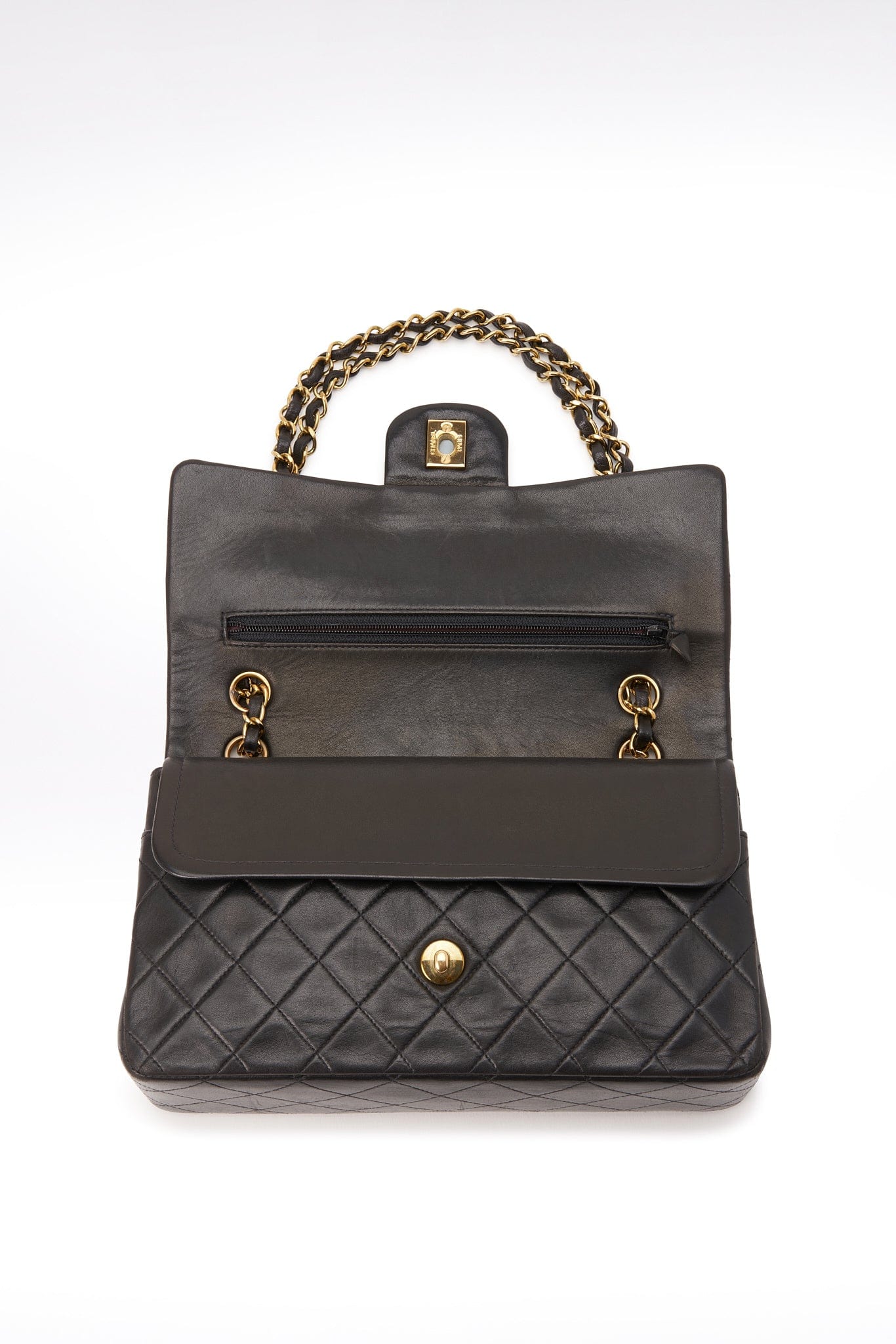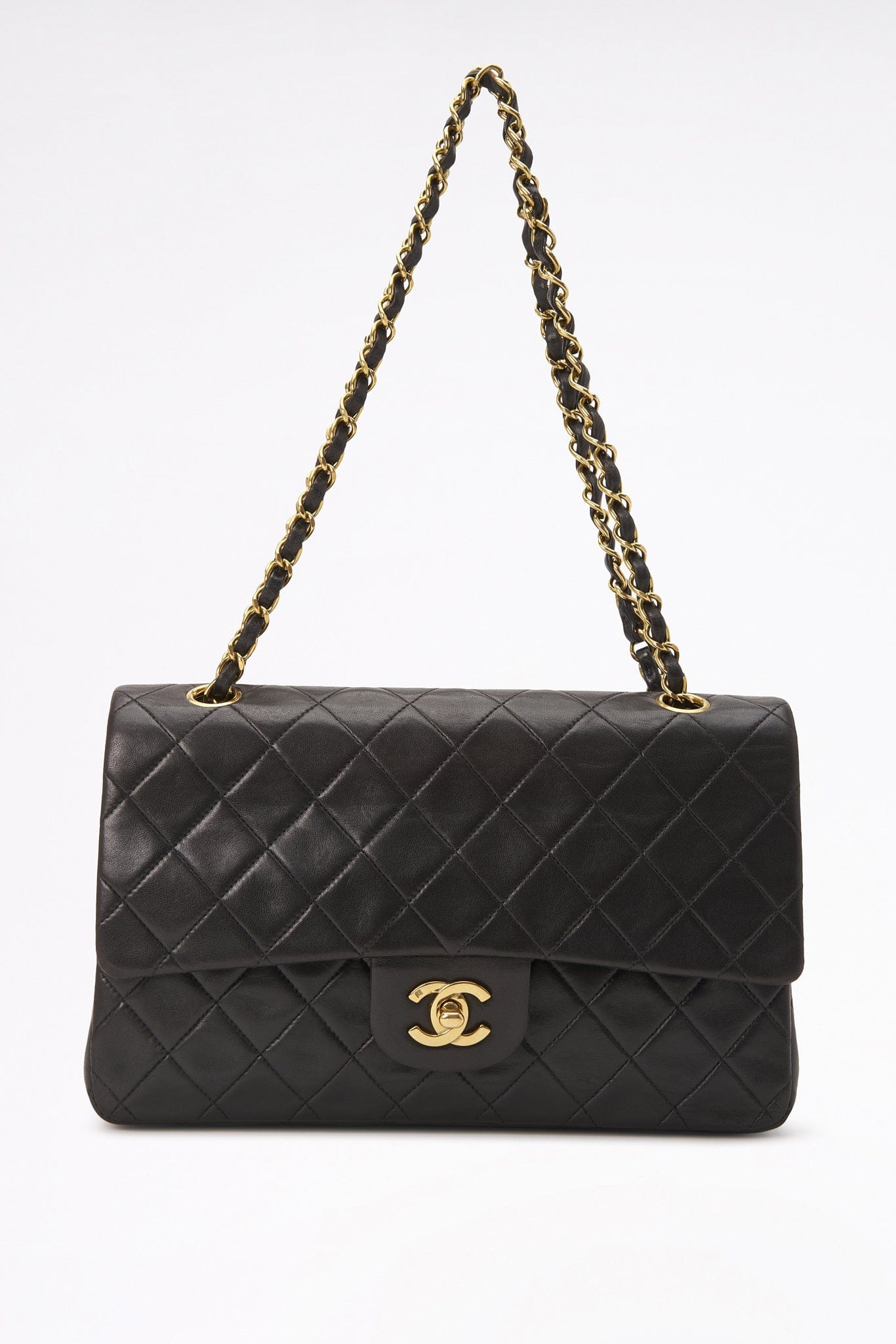 This vintage Classic Chanel Medium Flap bag is crafted with diamond quilted lambskin leather with 24k gold-plated hardware and a single convertible leather-trimmed chain-link shoulder strap. There is a single exterior patch pocket on the back, a single zip pocket under the front flap and three interior compartments. Inside the bag is lined with maroon leather.