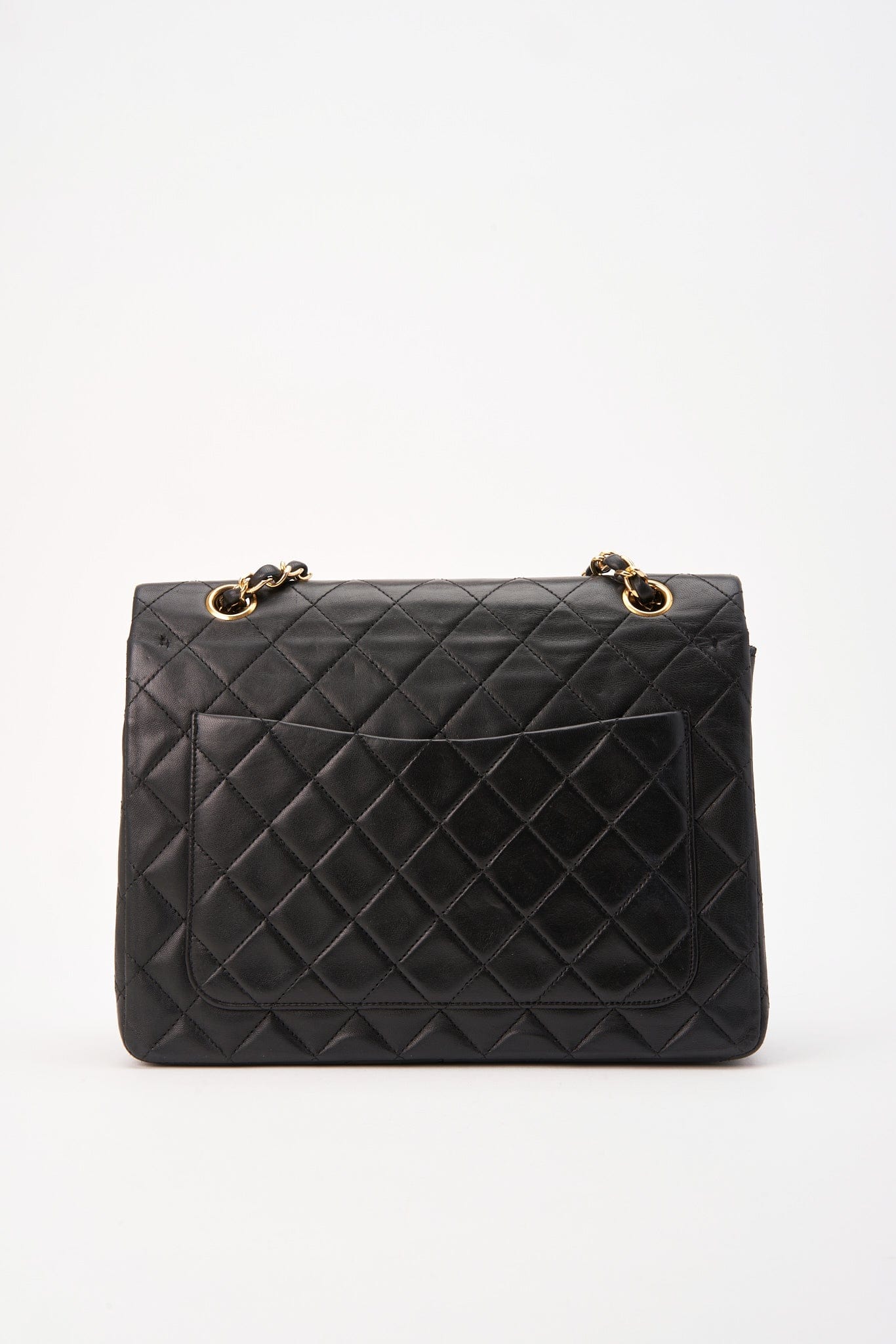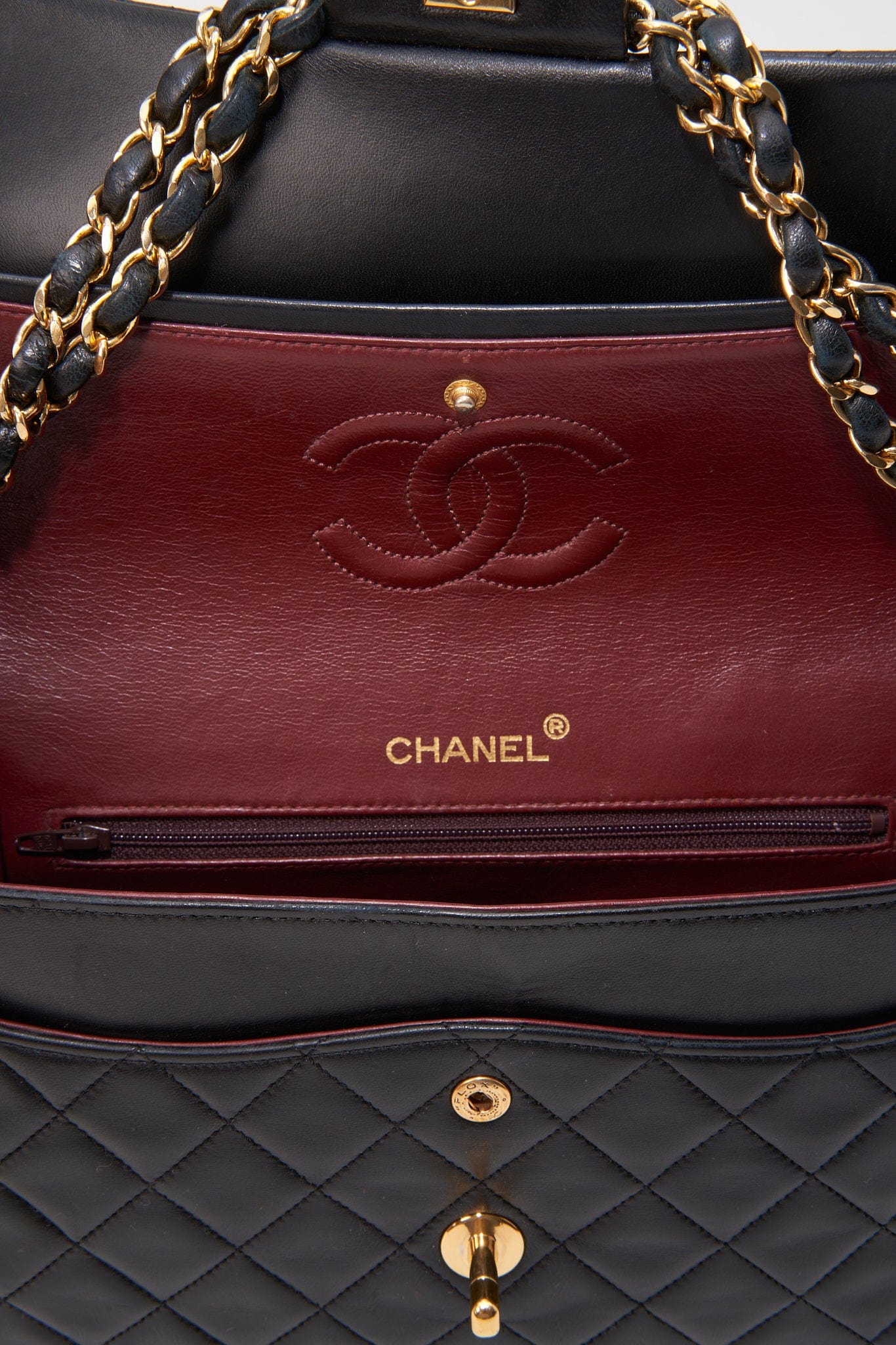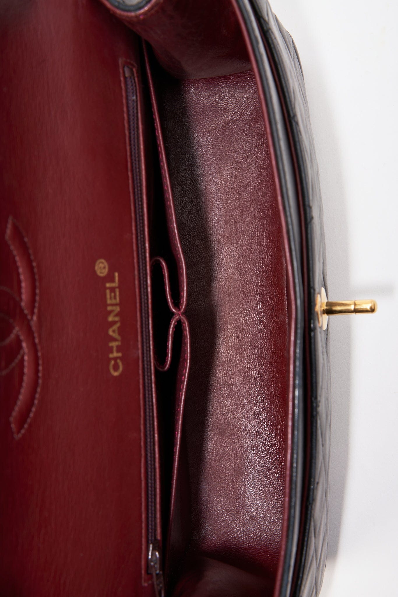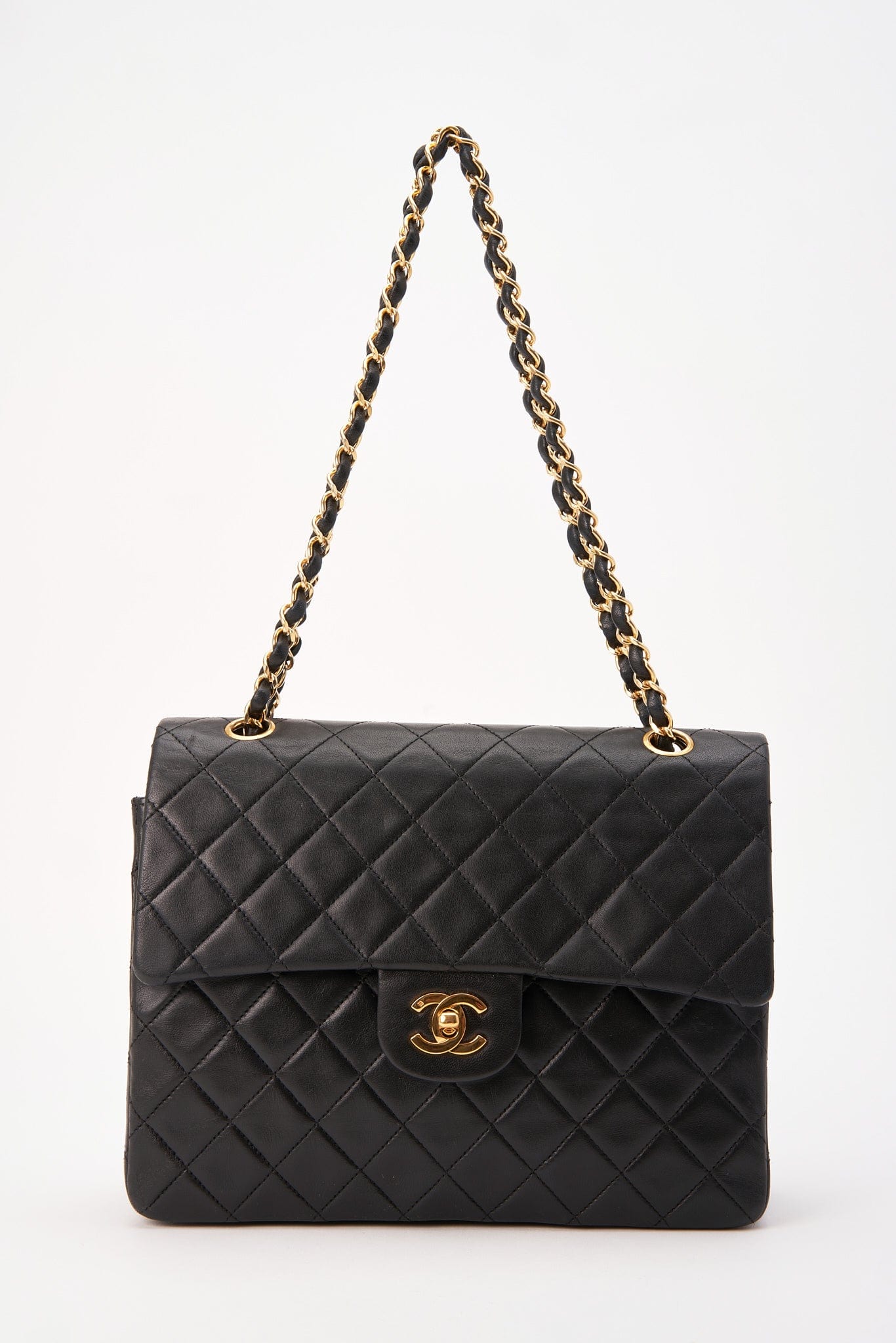 This vintage Classic Chanel Medium Square Flap bag is crafted with diamond quilted lambskin leather with 24k gold-plated hardware and a single convertible leather-trimmed chain-link shoulder strap. There is a single exterior patch pocket on the back, a single zip pocket under the front flap and three interior compartments. Inside the bag is lined with maroon leather.
