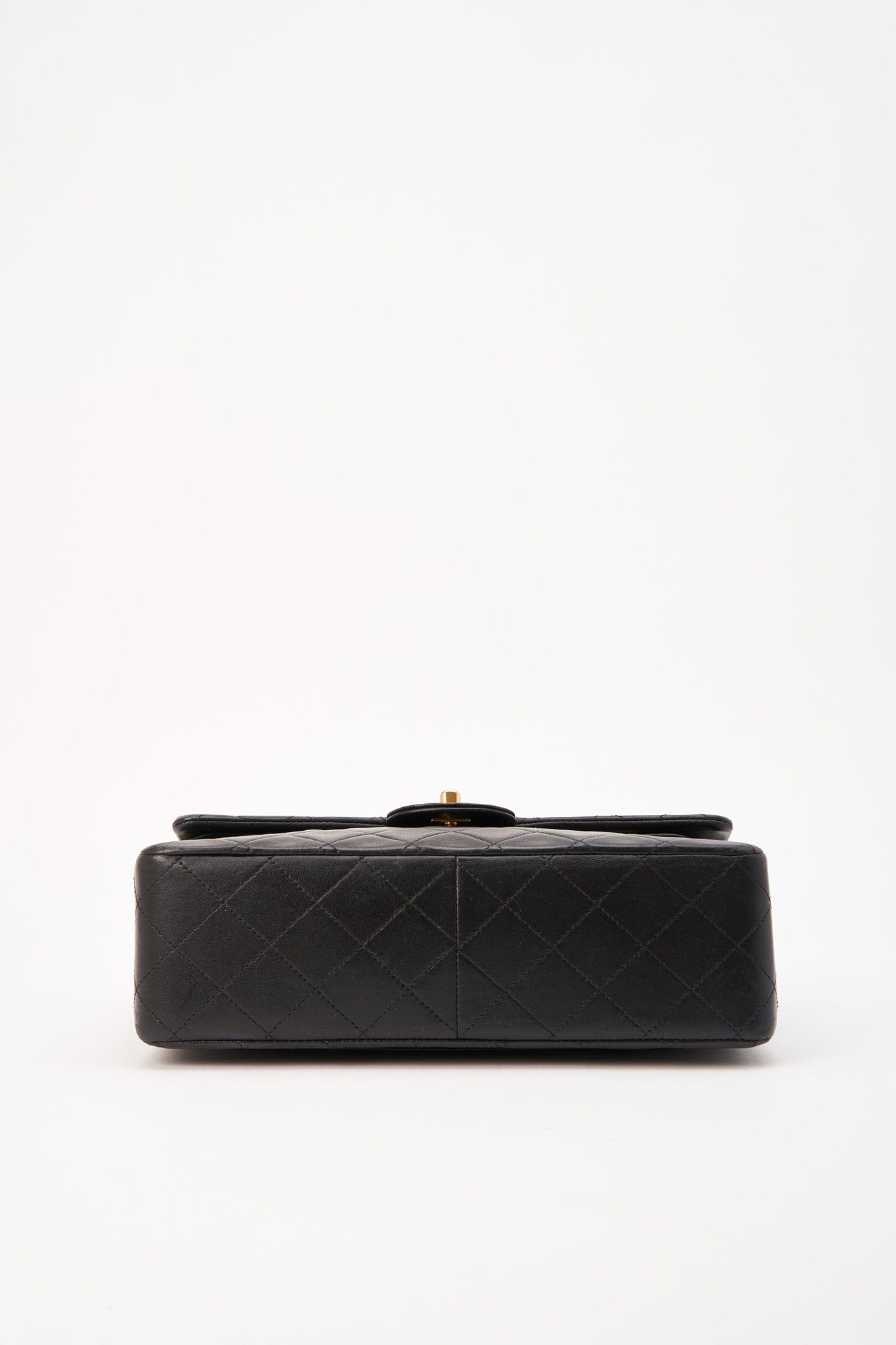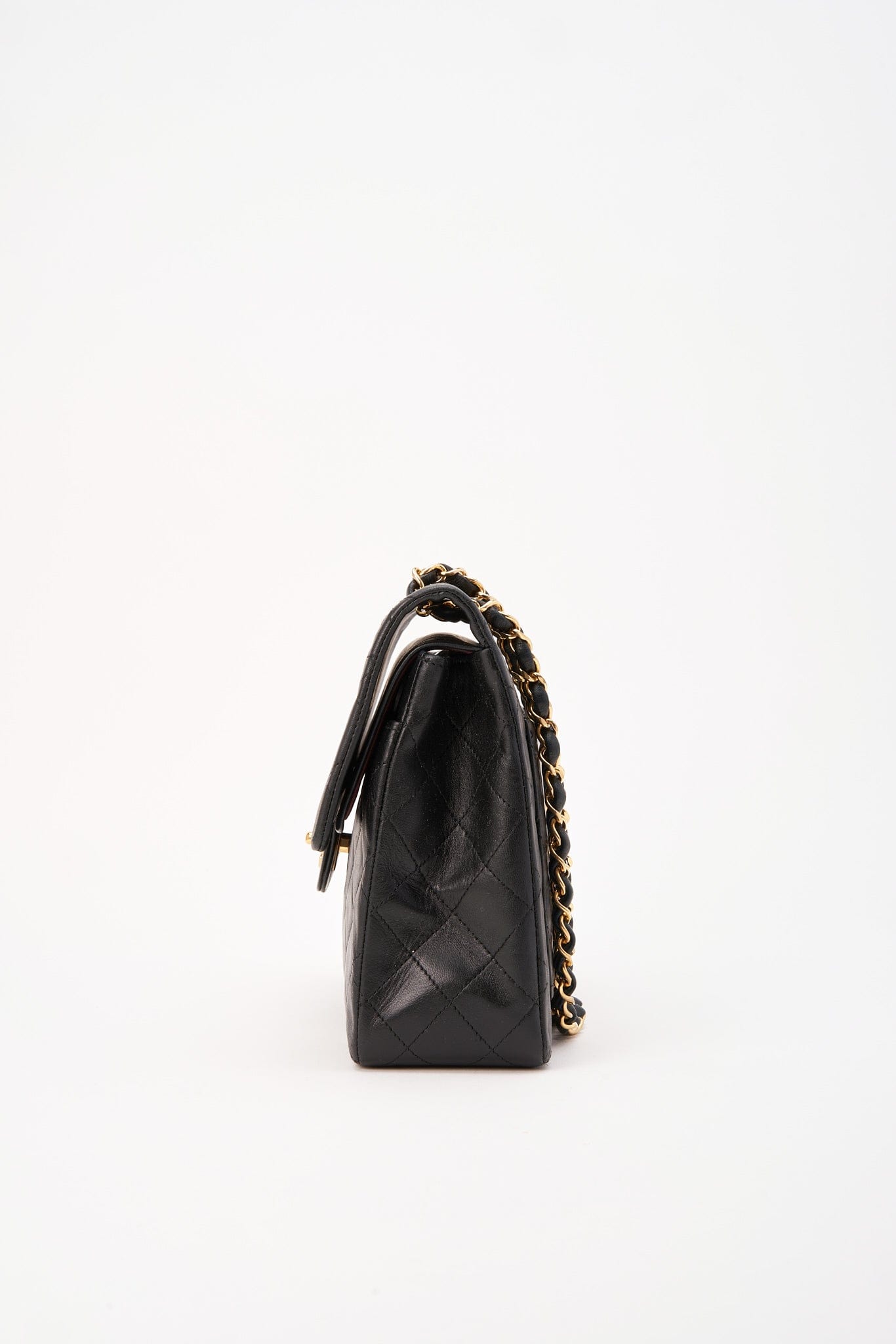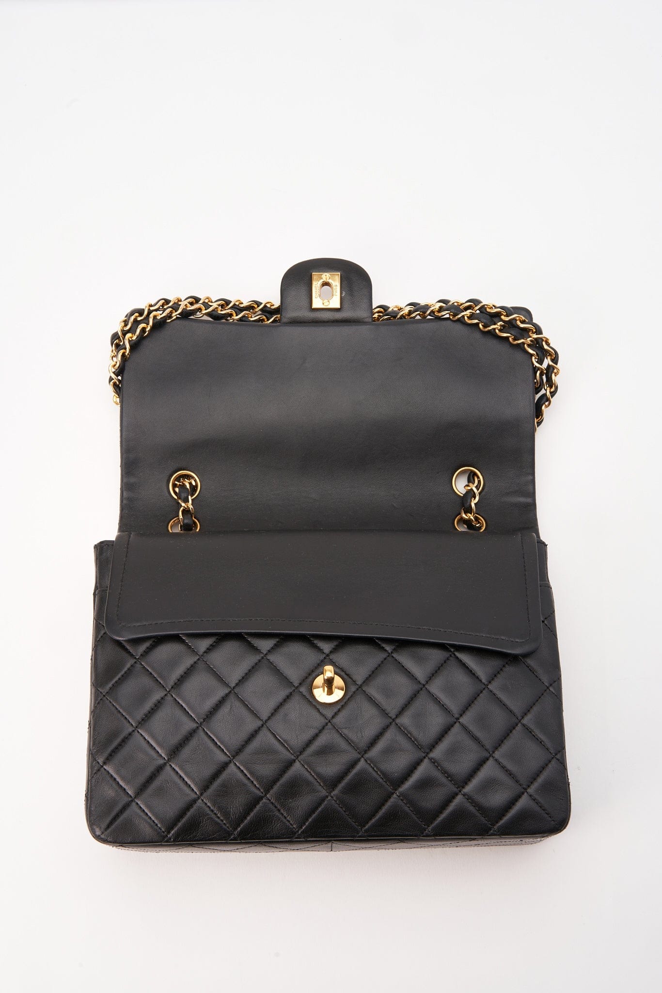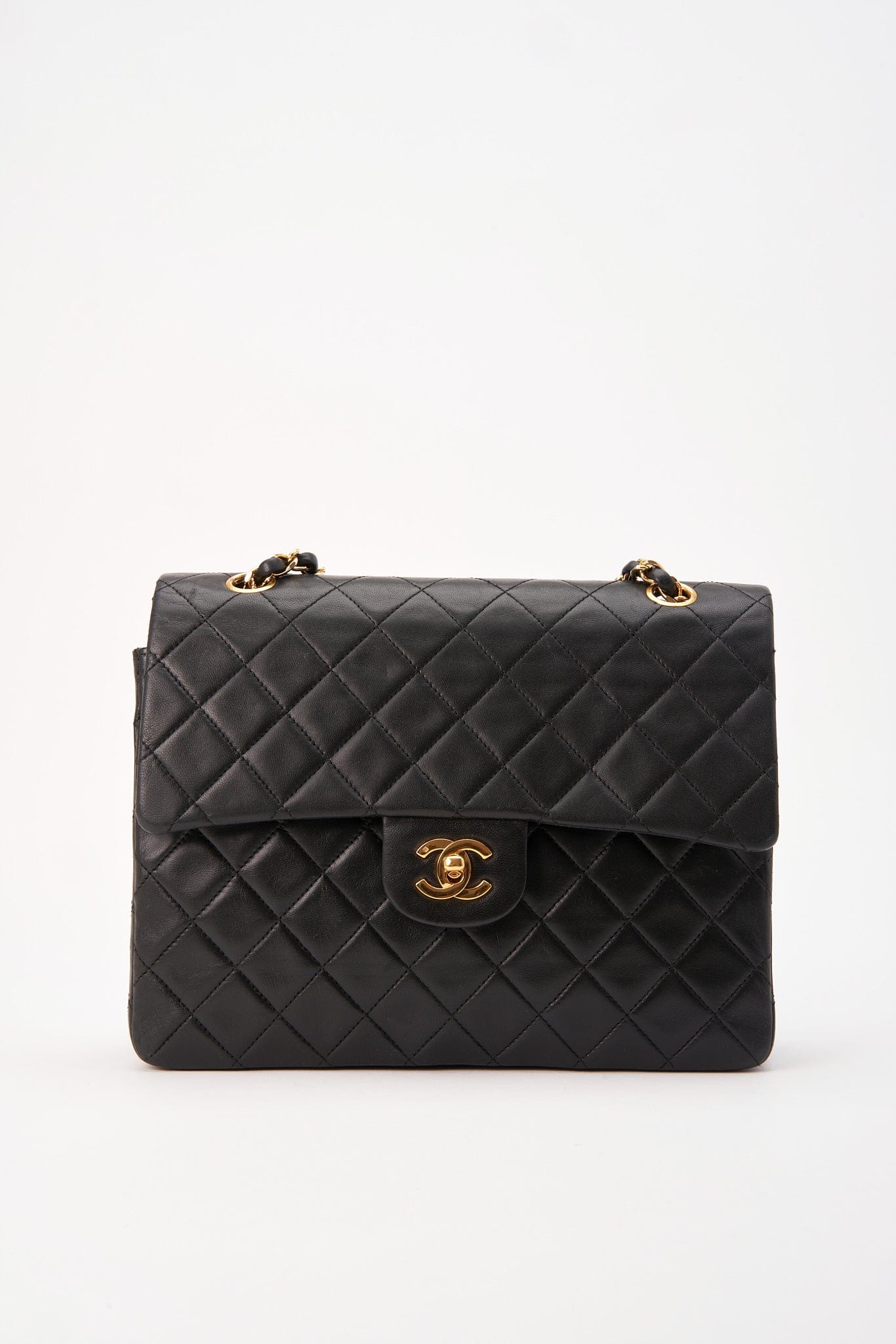 This vintage Classic Chanel Medium Square Flap bag is crafted with diamond quilted lambskin leather with 24k gold-plated hardware and a single convertible leather-trimmed chain-link shoulder strap. There is a single exterior patch pocket on the back, a single zip pocket under the front flap and three interior compartments. Inside the bag is lined with maroon leather.