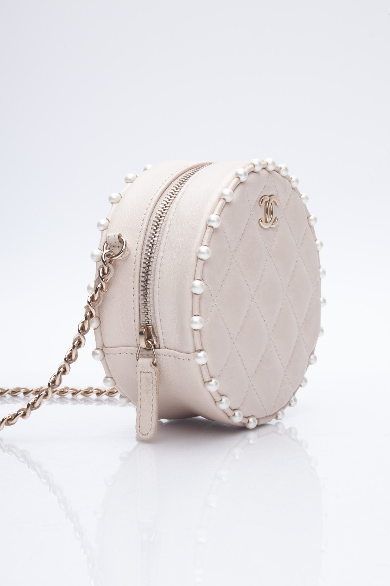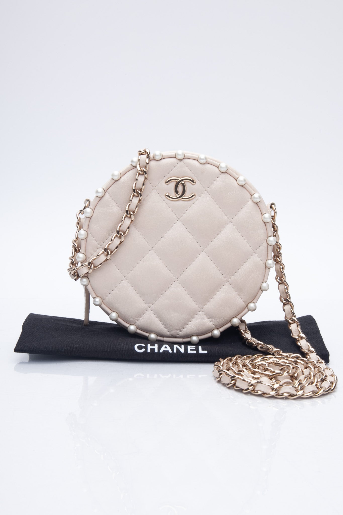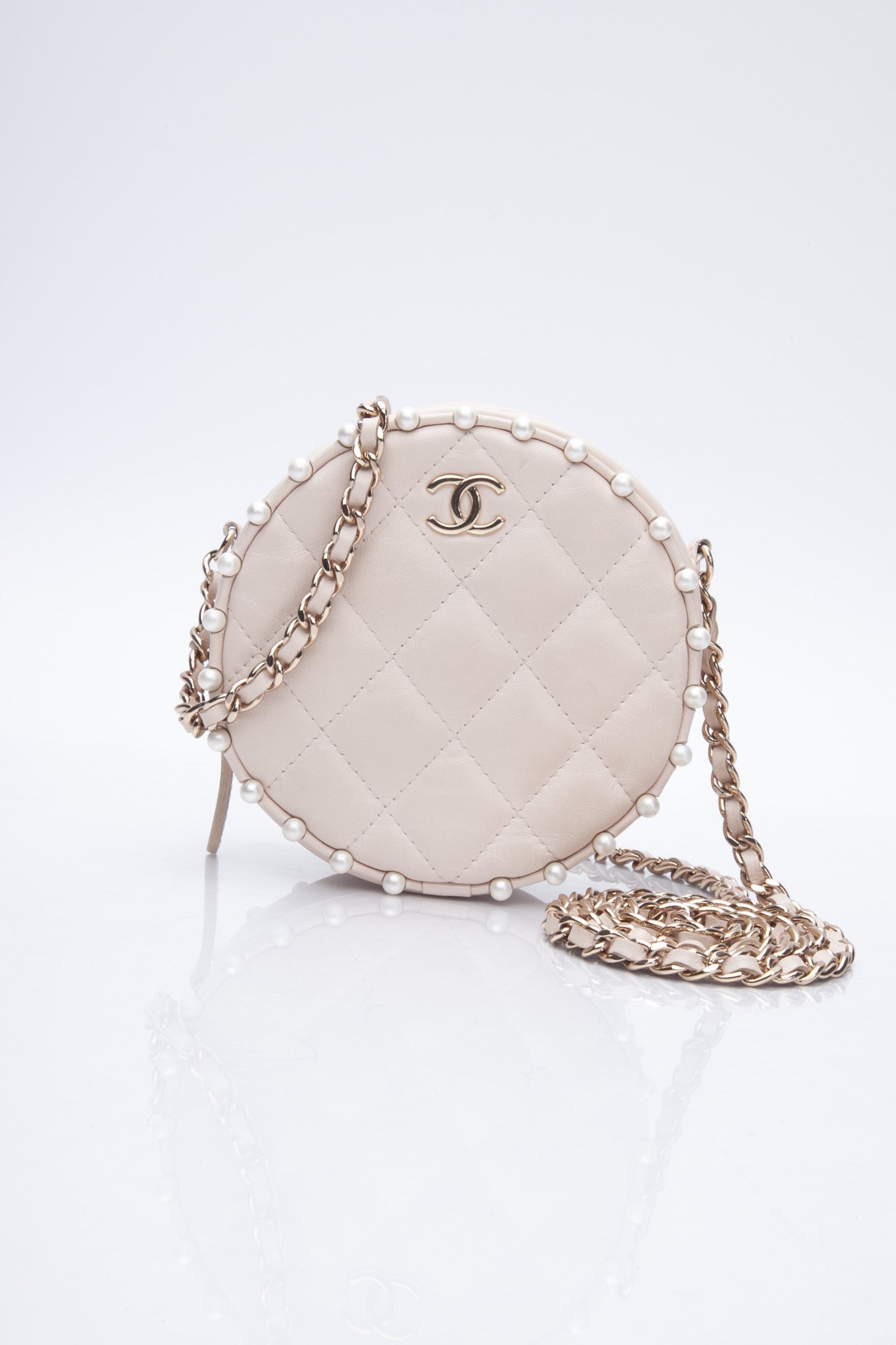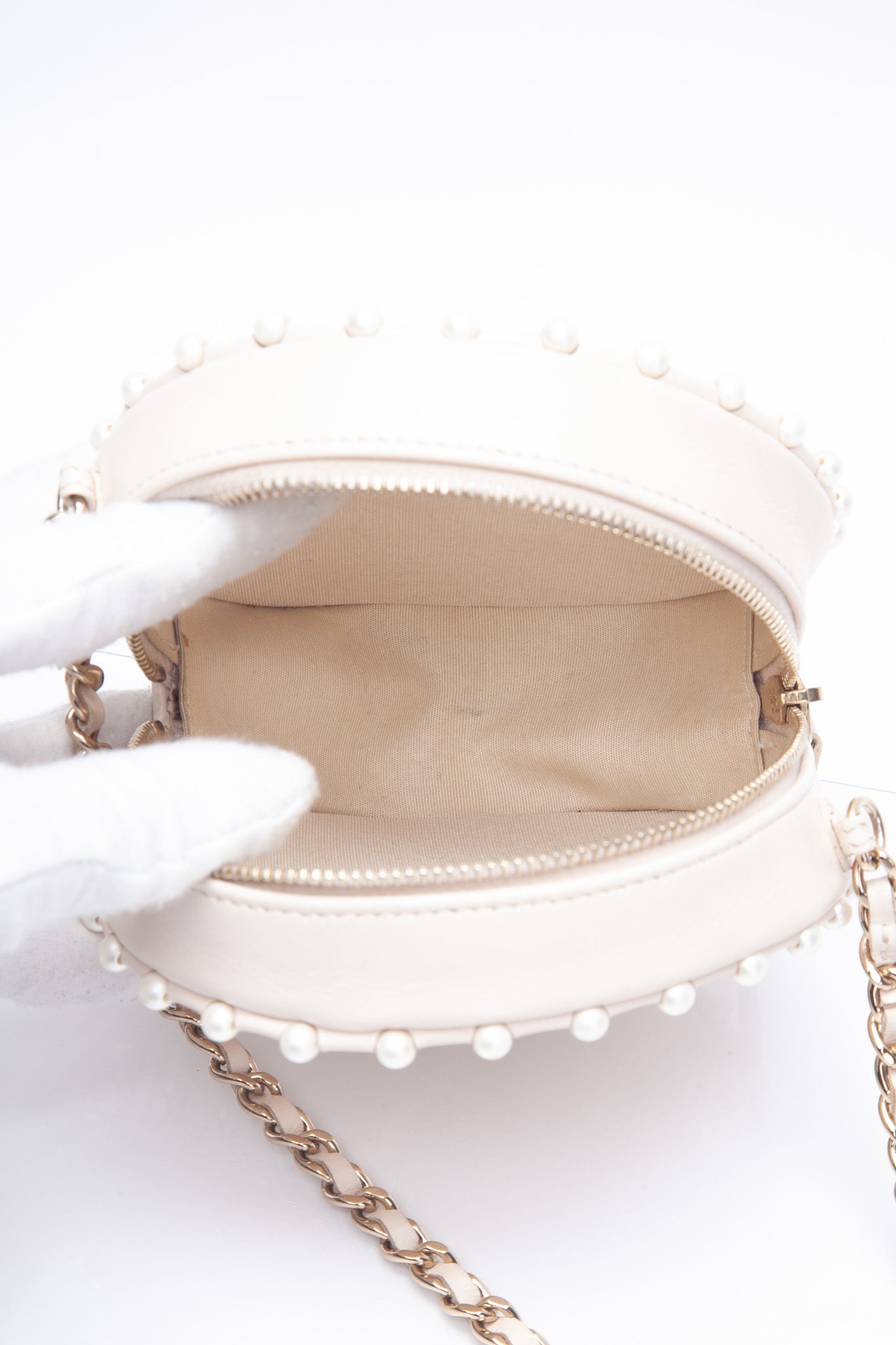 This stylish cross body bag is crafted of luxurious calfskin leather in cream. The bag features a polished gold link leather threaded crossbody strap, faux pearl trim on the edges, and a polished gold Chanel CC logo on the front. This shoulder bag opens with a top zipper to a cream fabric interior with two patch pockets on either side.