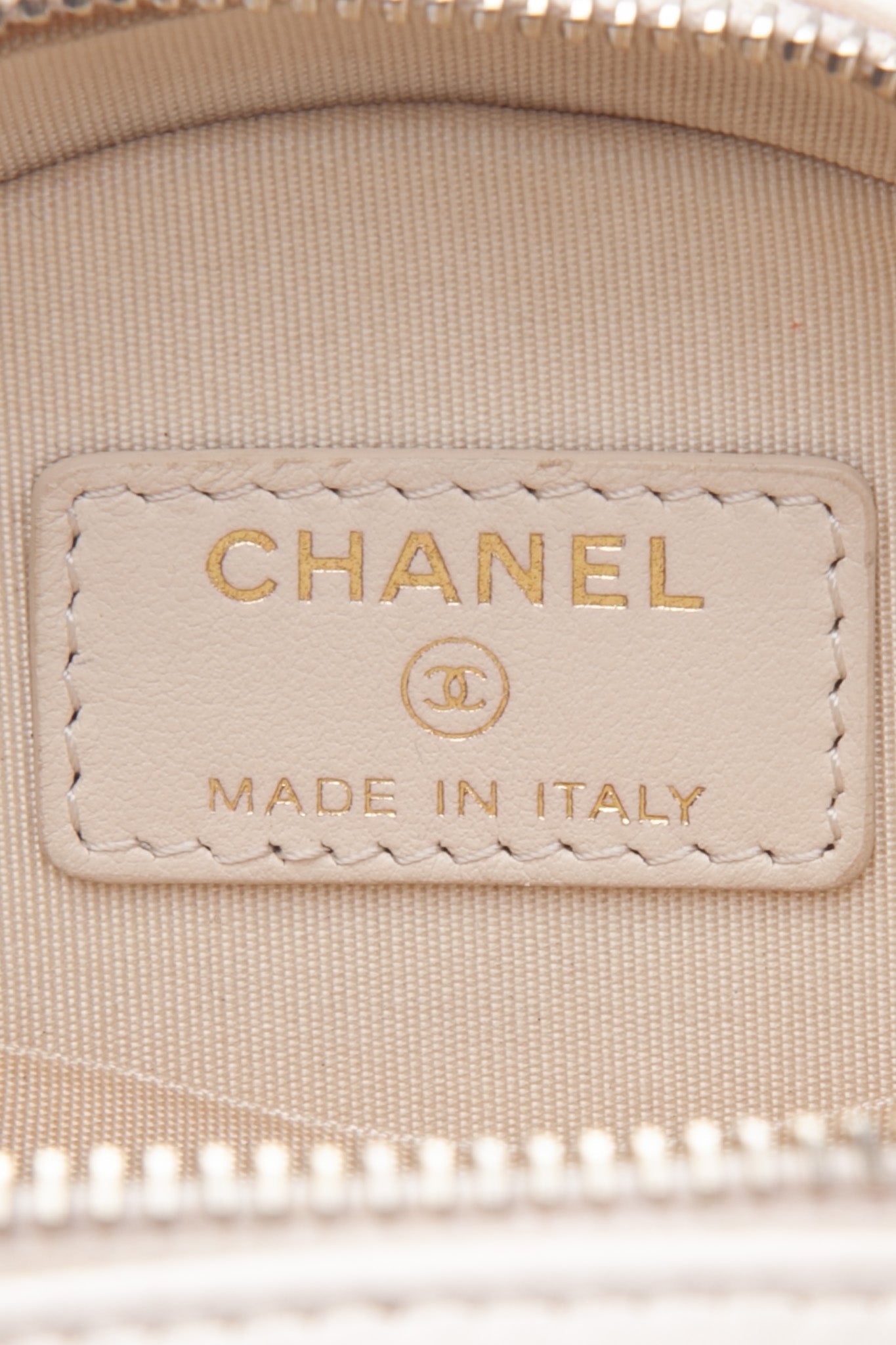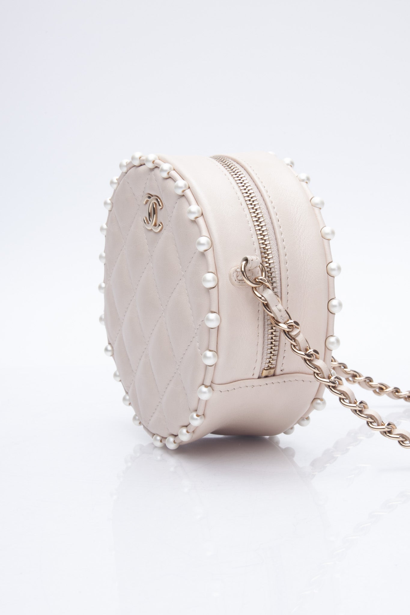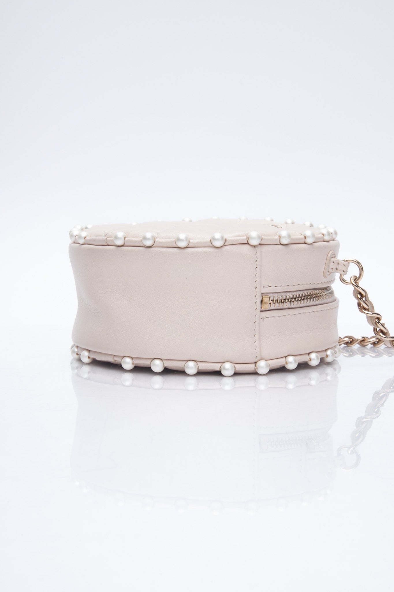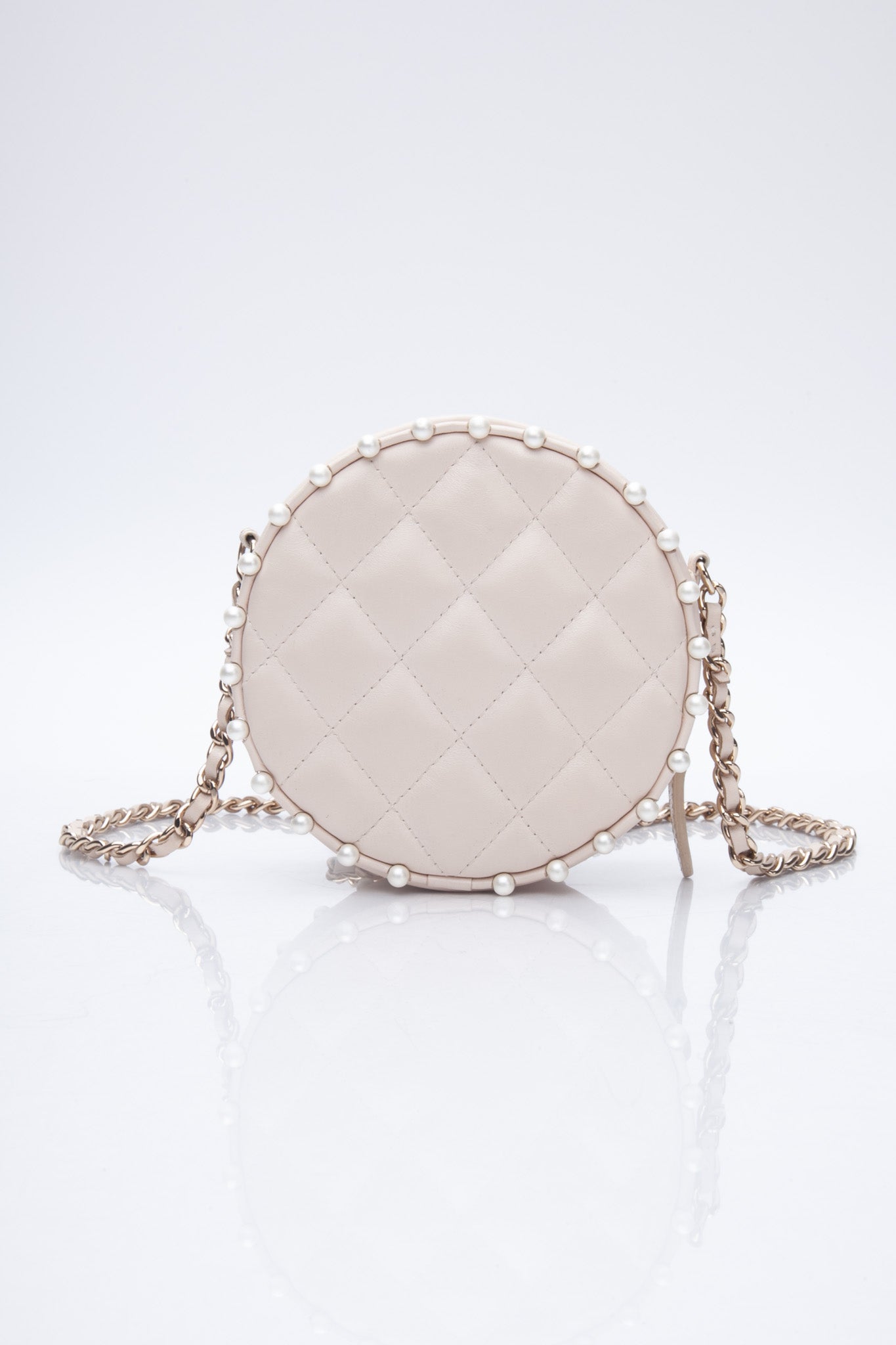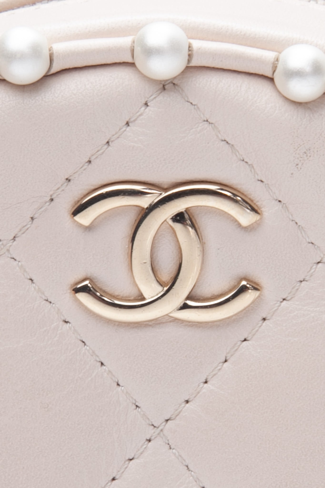This stylish cross body bag is crafted of luxurious calfskin leather in cream. The bag features a polished gold link leather threaded crossbody strap, faux pearl trim on the edges, and a polished gold Chanel CC logo on the front. This shoulder bag opens with a top zipper to a cream fabric interior with two patch pockets on either side.