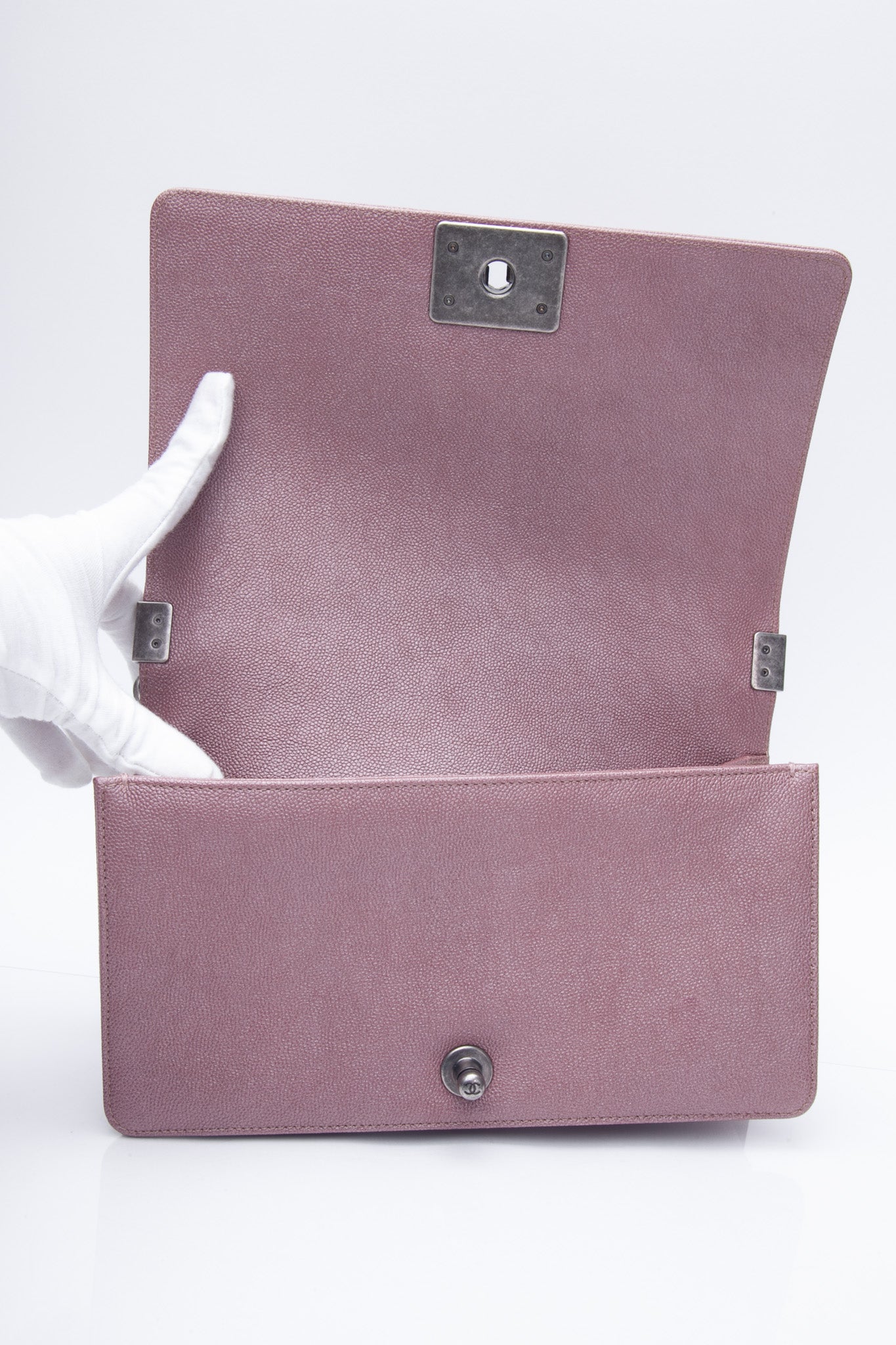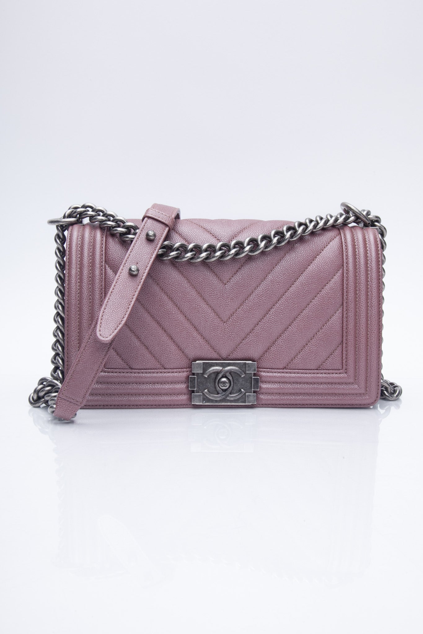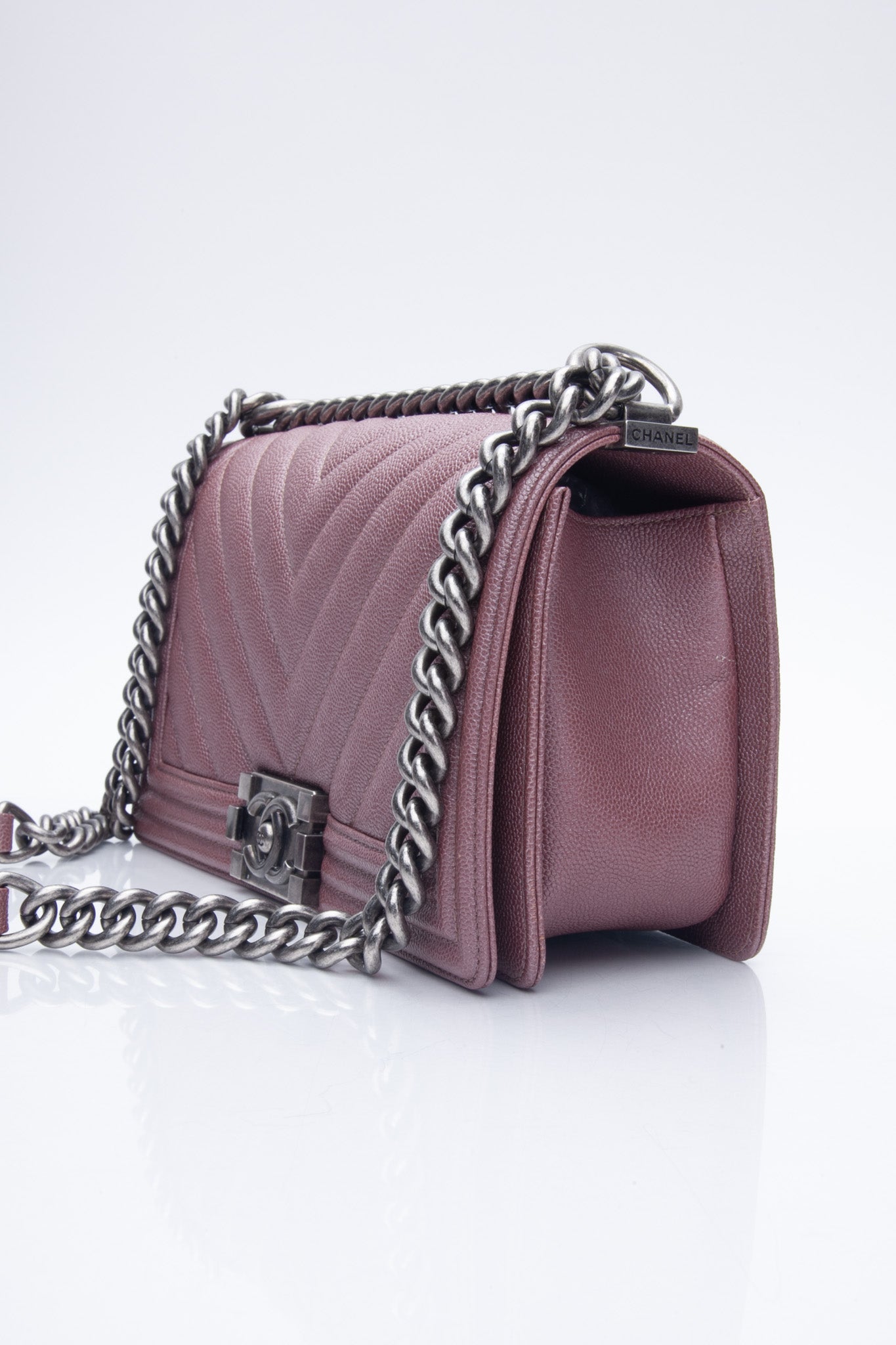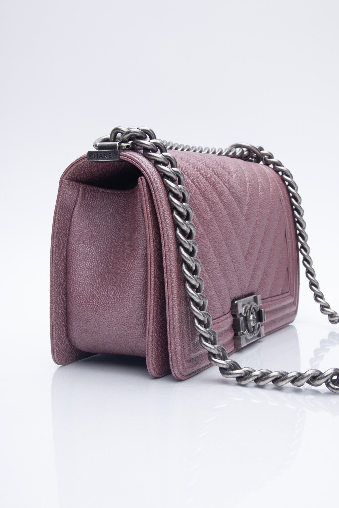 This chic shoulder bag is crafted of finely grained caviar calfskin leather in shimmering pink with purple undertones. It features a ruthenium chain-link shoulder strap with a leather shoulder pad, a chevron-quilted flap with a linear quilted border, and a ruthenium boy CC push lock. The flap opens to a matching fabric interior with a patch pocket.