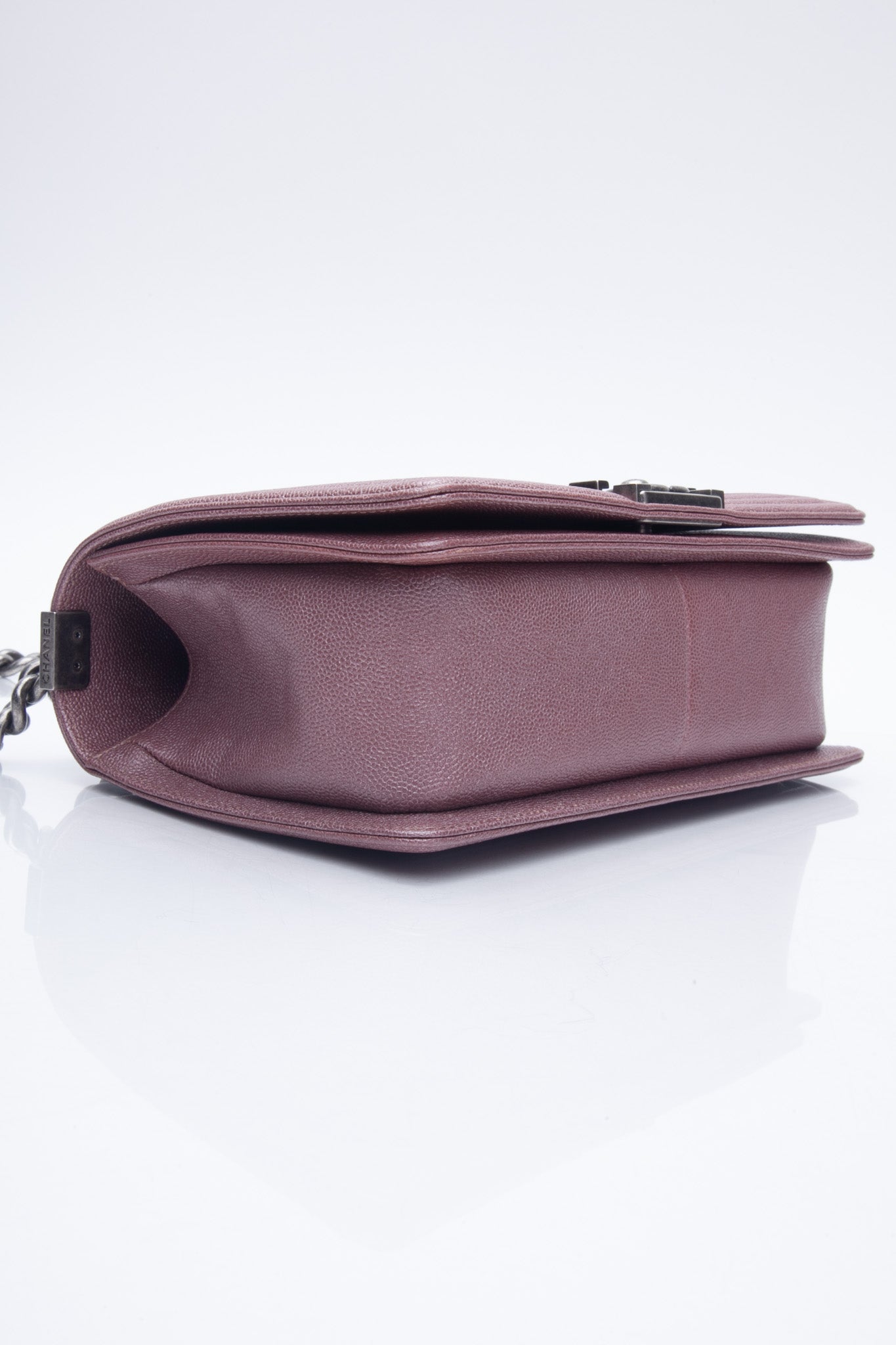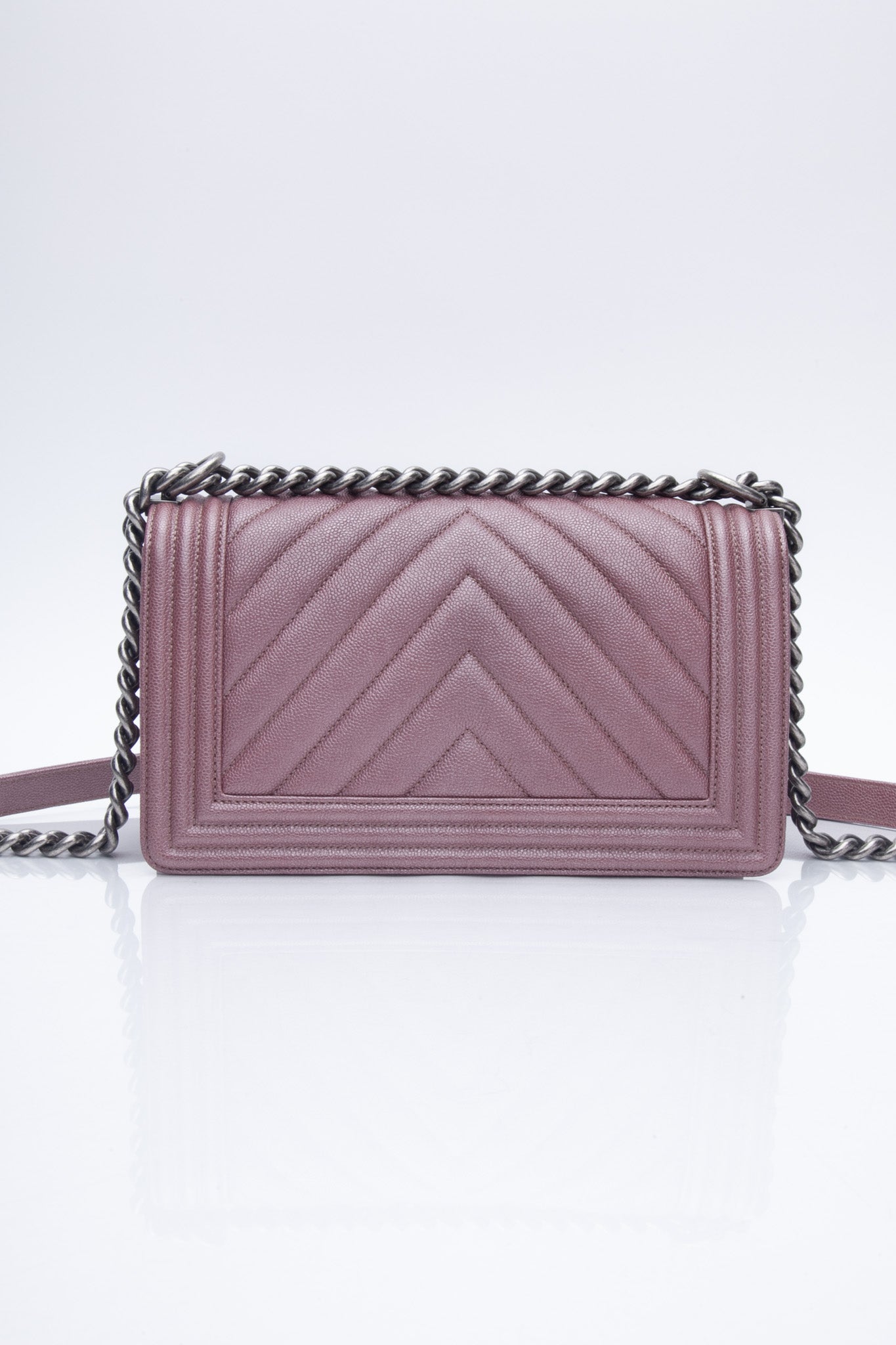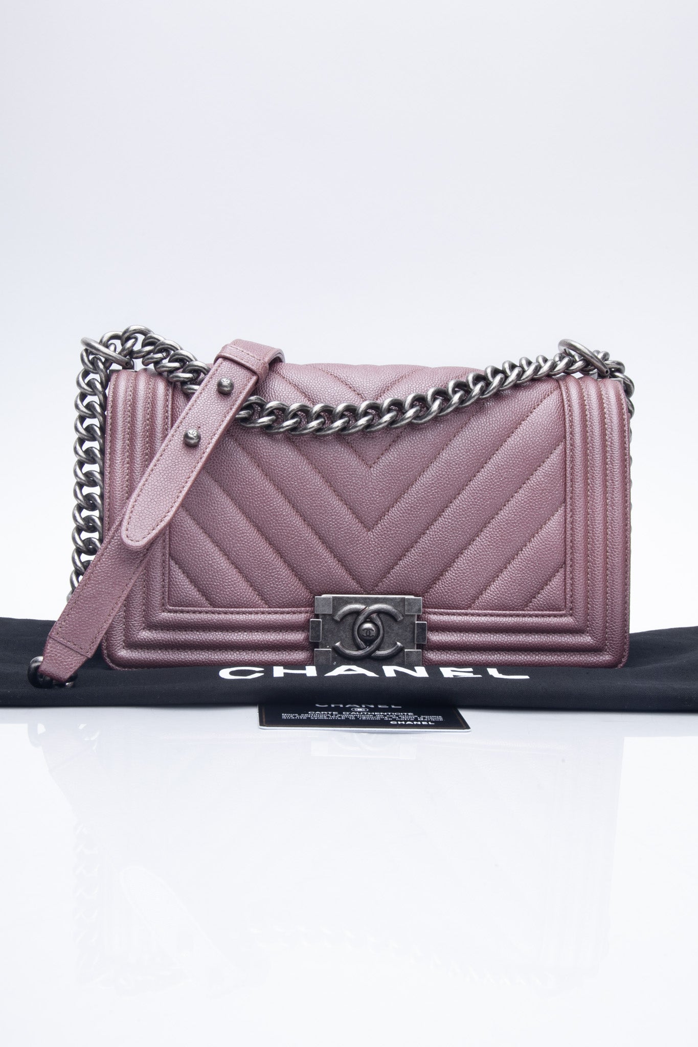 This chic shoulder bag is crafted of finely grained caviar calfskin leather in shimmering pink with purple undertones. It features a ruthenium chain-link shoulder strap with a leather shoulder pad, a chevron-quilted flap with a linear quilted border, and a ruthenium boy CC push lock. The flap opens to a matching fabric interior with a patch pocket.