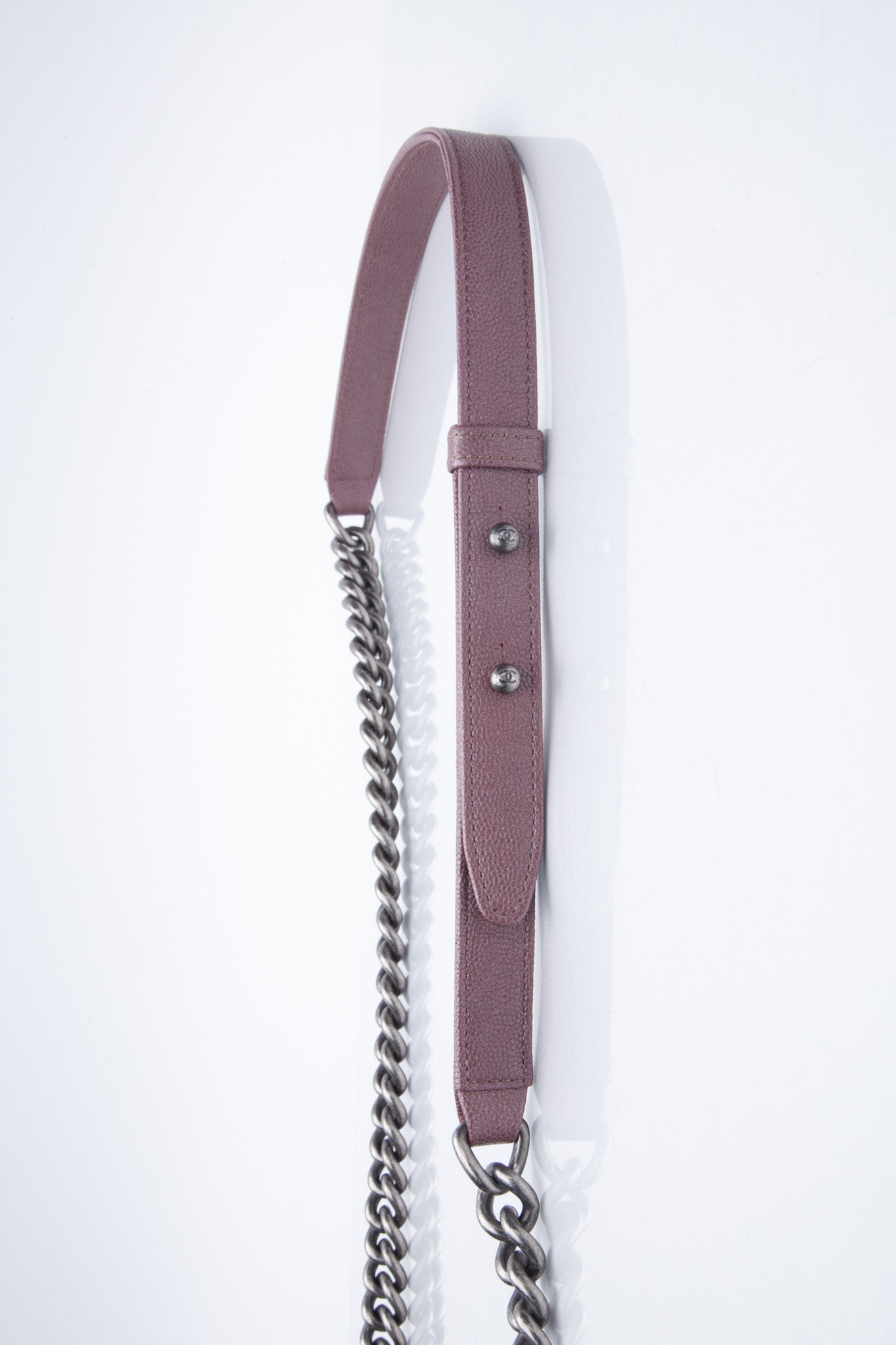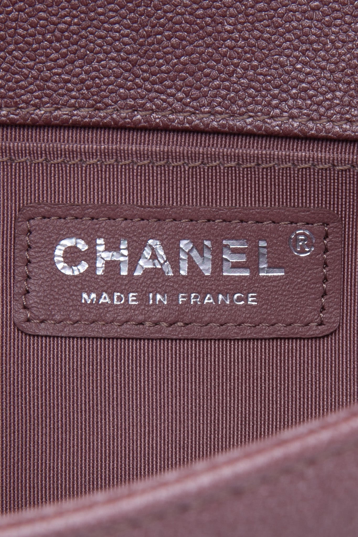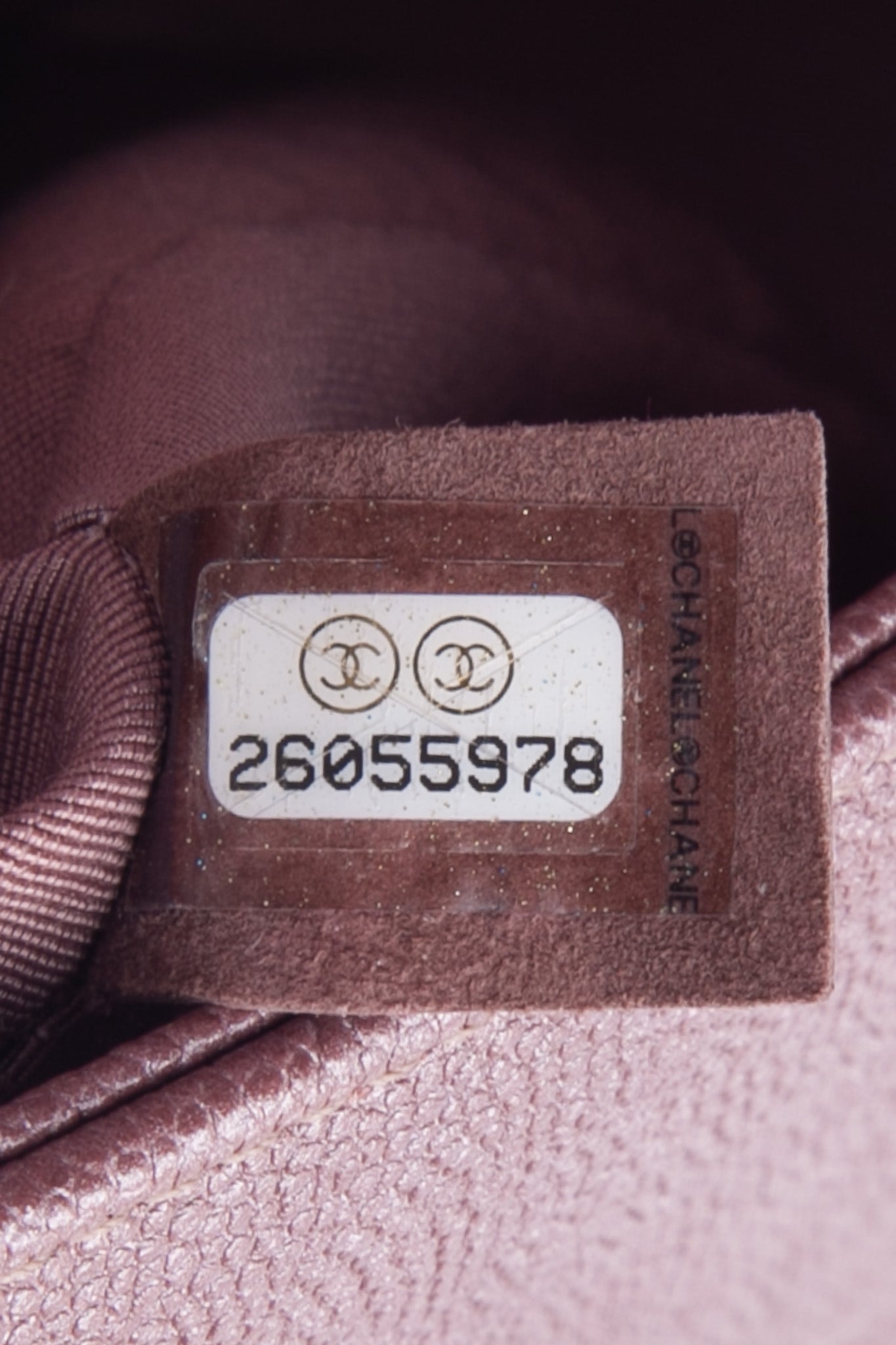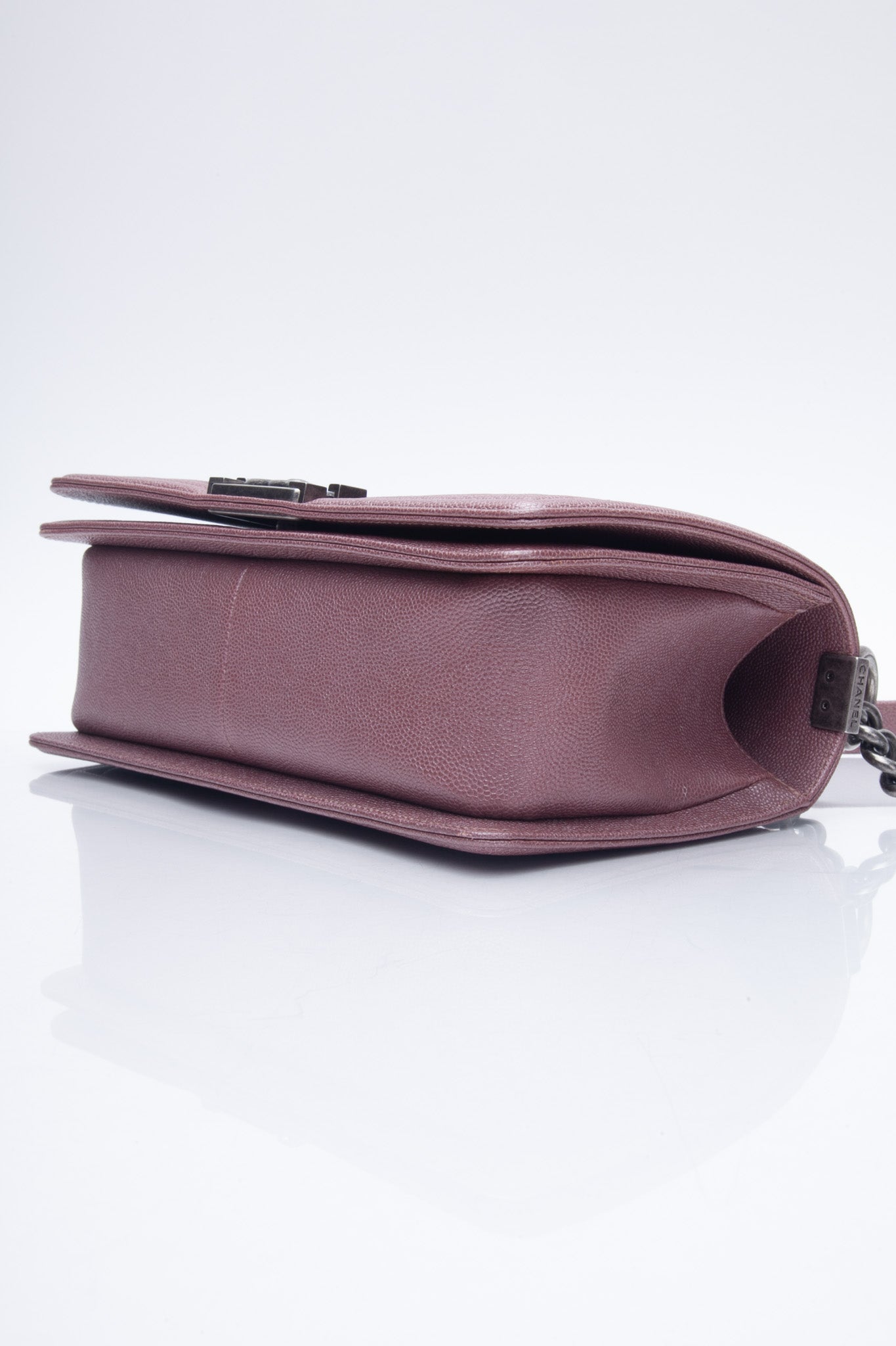 This chic shoulder bag is crafted of finely grained caviar calfskin leather in shimmering pink with purple undertones. It features a ruthenium chain-link shoulder strap with a leather shoulder pad, a chevron-quilted flap with a linear quilted border, and a ruthenium boy CC push lock. The flap opens to a matching fabric interior with a patch pocket.
