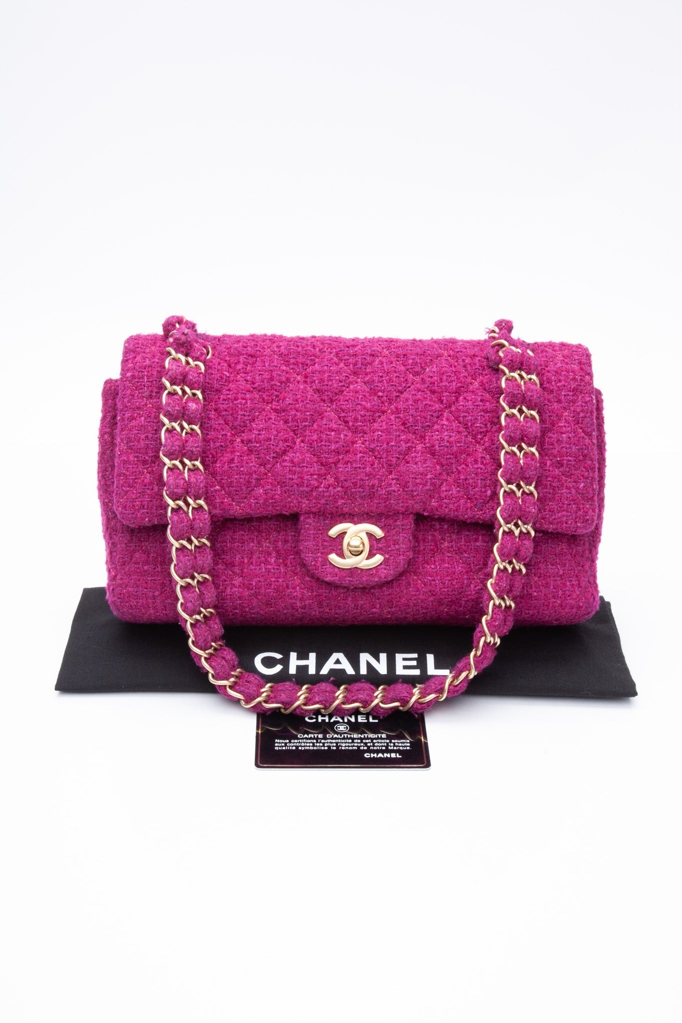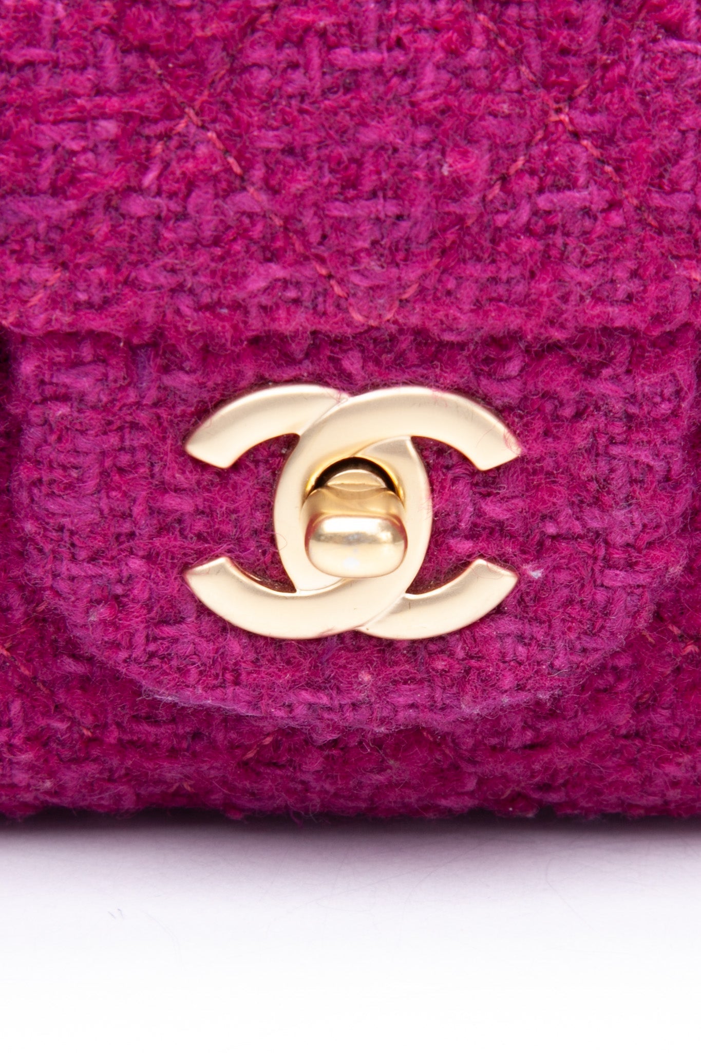 This stylish shoulder bag is crafted of diamond quilted tweed. The bag features polished gold chain link leather threaded shoulder straps and a Chanel CC turn tock. This opens the facing flap to an inner flap and pink leather interior.