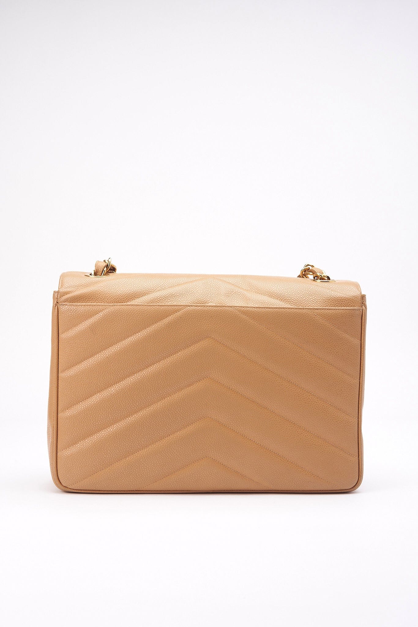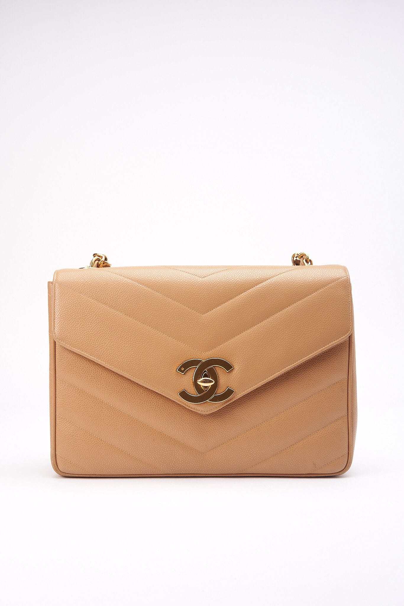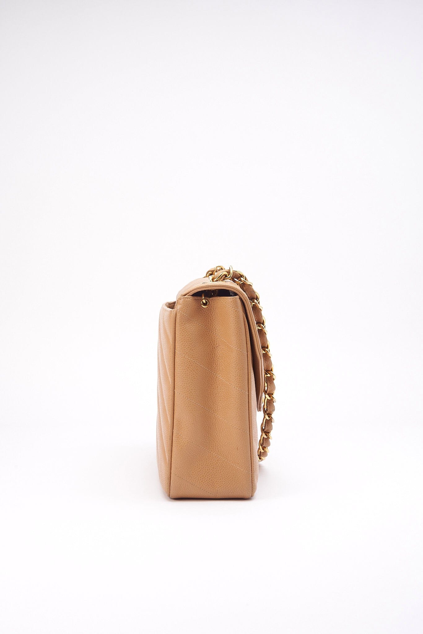 This vintage Classic Chanel Jumbo Flap bag is crafted from beige Caviar leather with 24k gold-plated hardware and a single leather-trimmed chain-link shoulder strap.