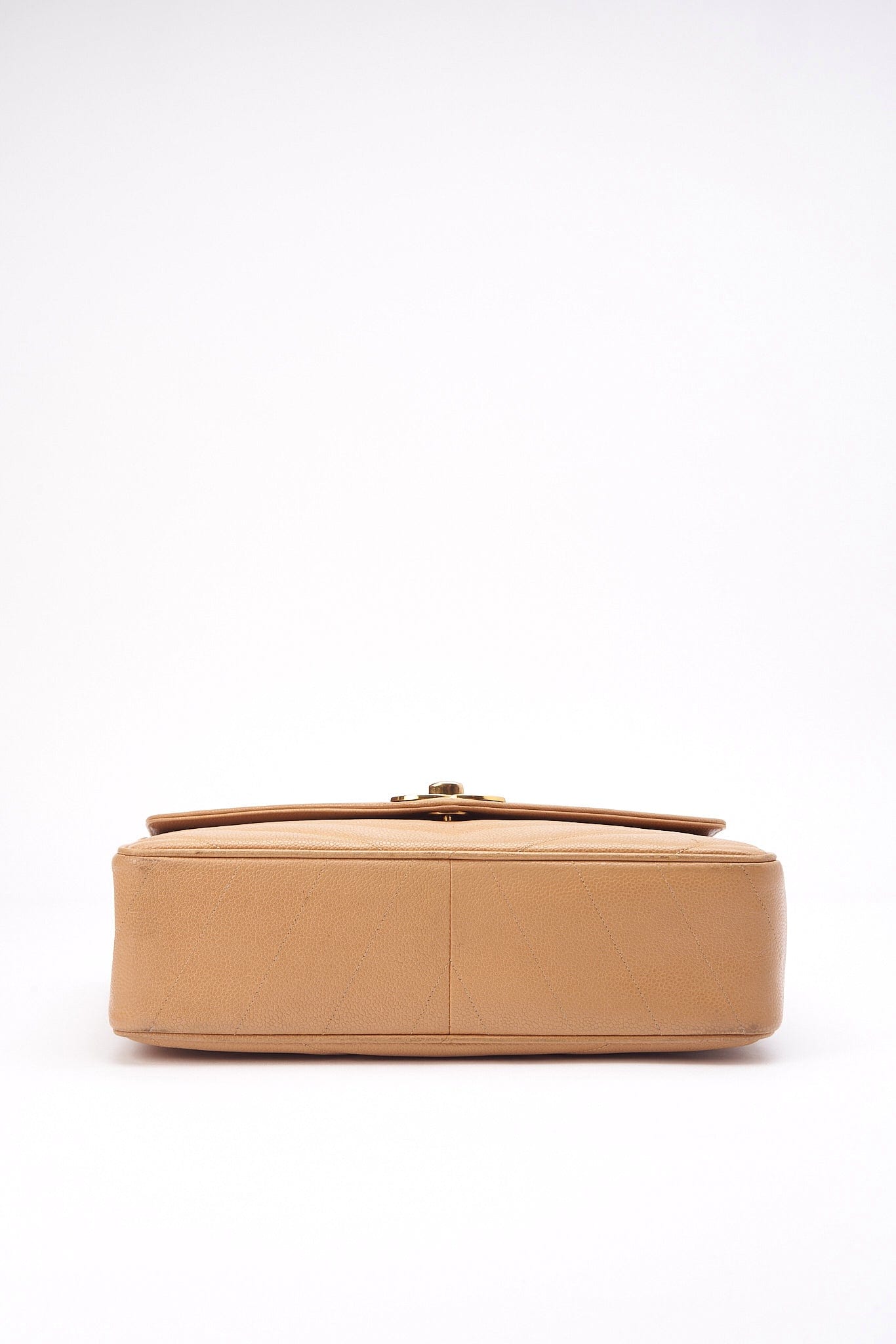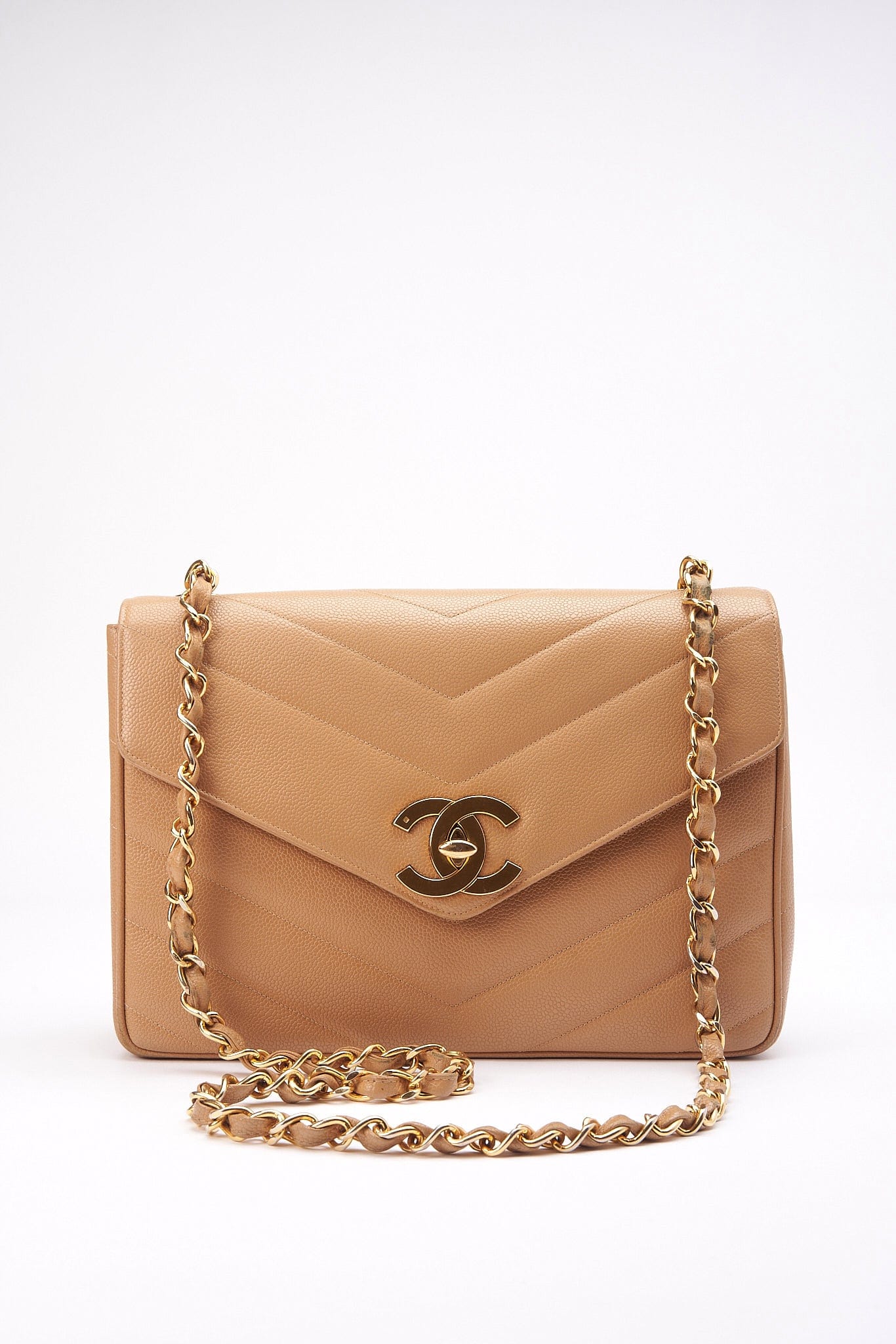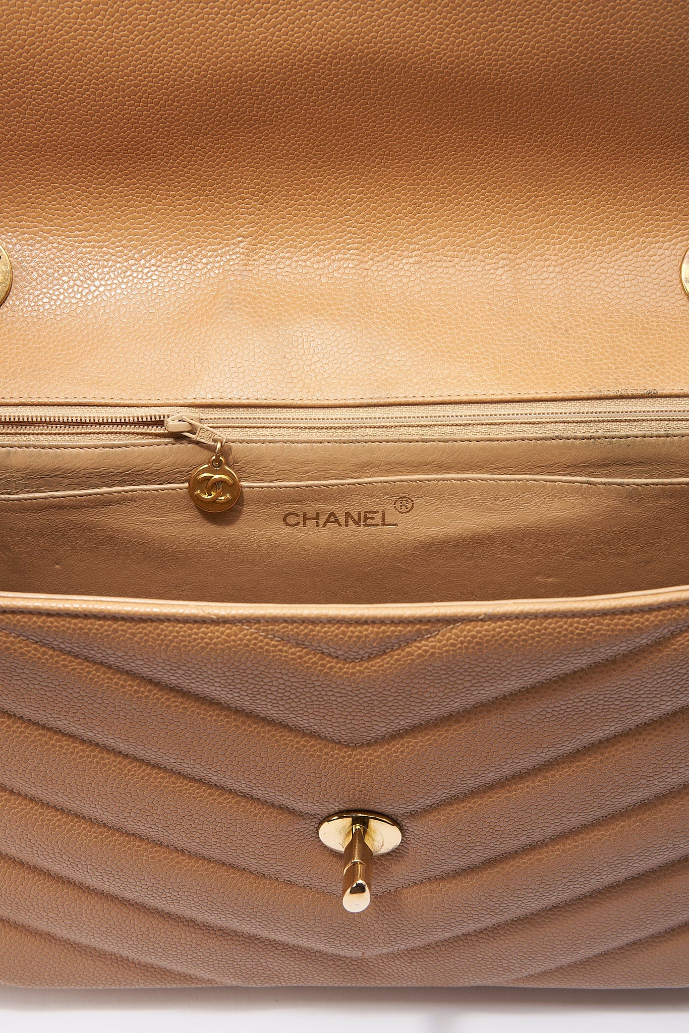 This vintage Classic Chanel Jumbo Flap bag is crafted from beige Caviar leather with 24k gold-plated hardware and a single leather-trimmed chain-link shoulder strap.