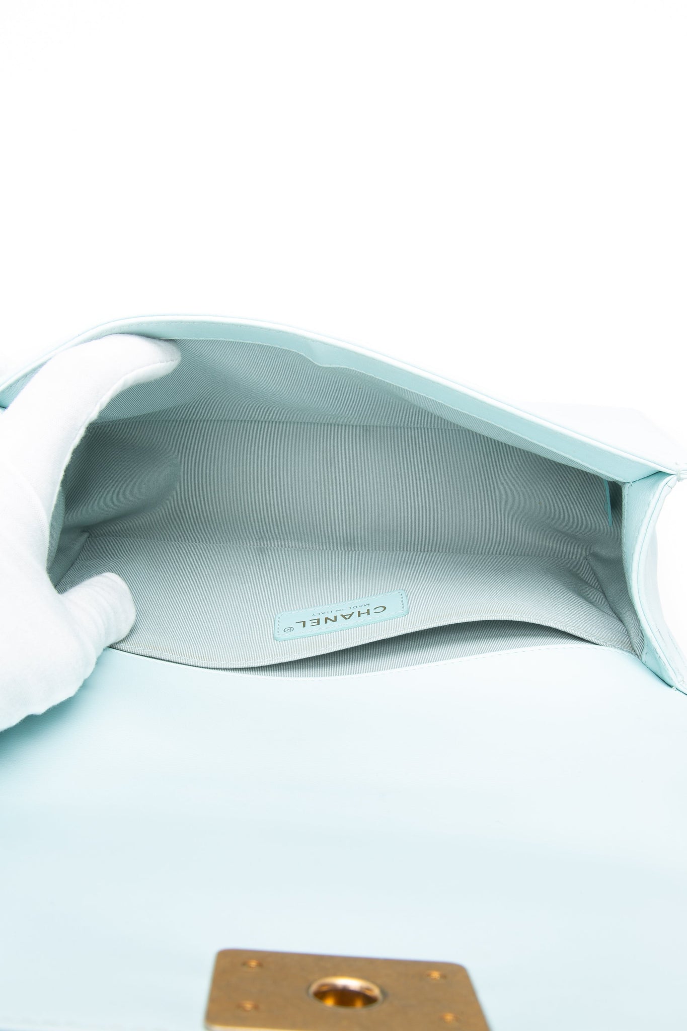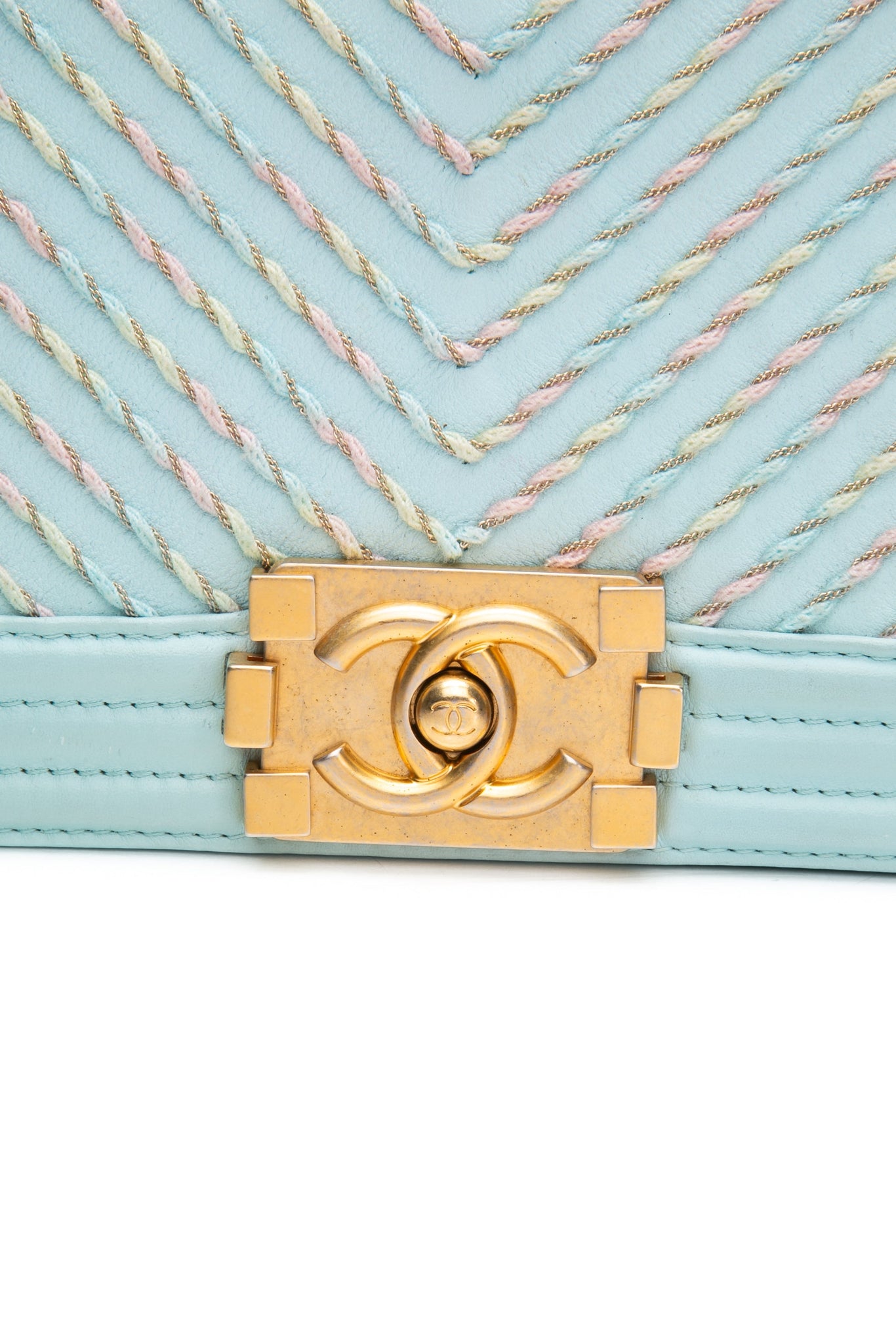 This chic bag is crafted of calfskin leather in light blue. It features an embroidered chevron print with gold tone chain accents. This bag also contains an aged gold chain link belt with leather and an aged gold CC boy push lock. This opens to a light blue fabric interior with a patch pocket.