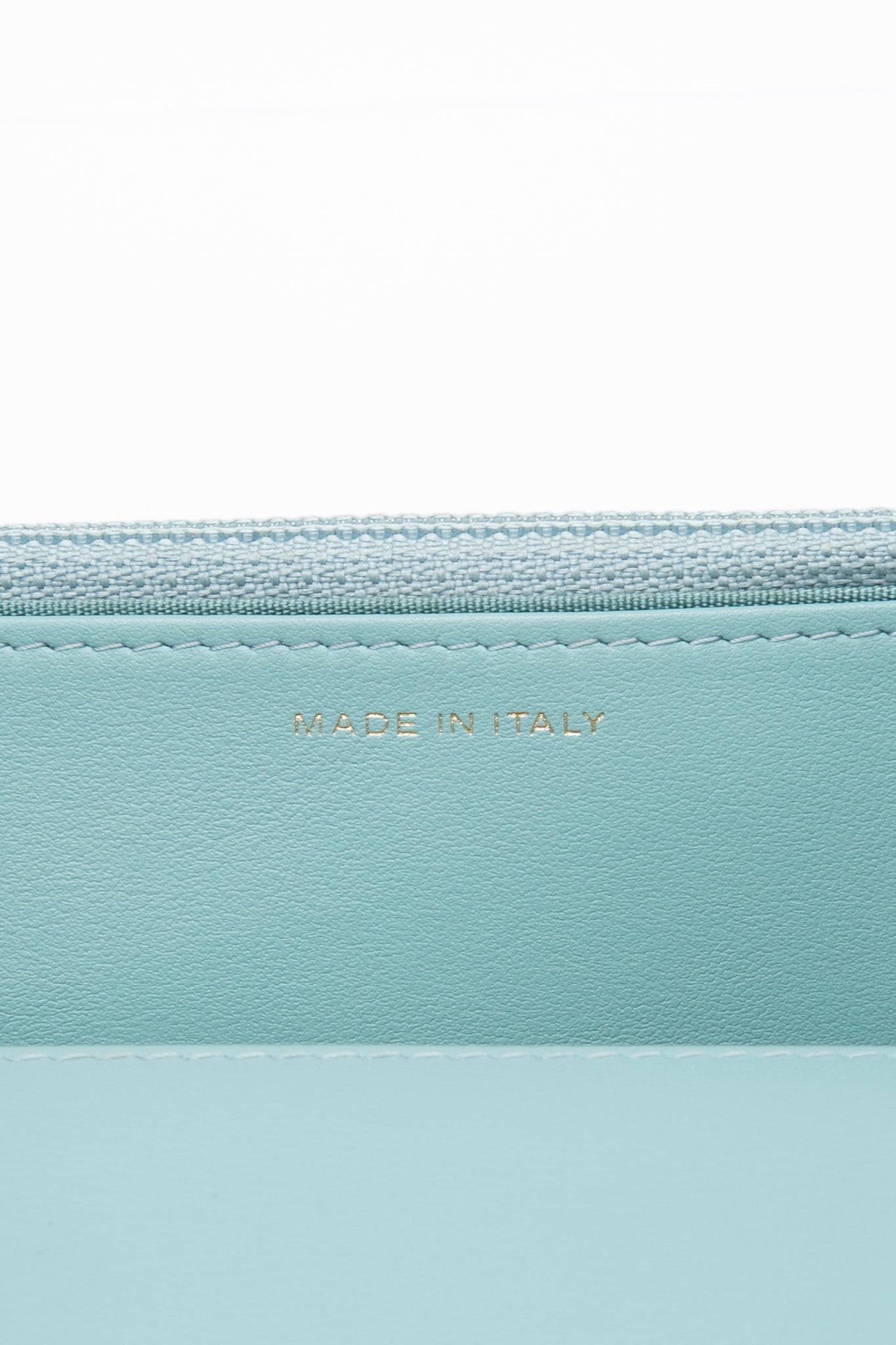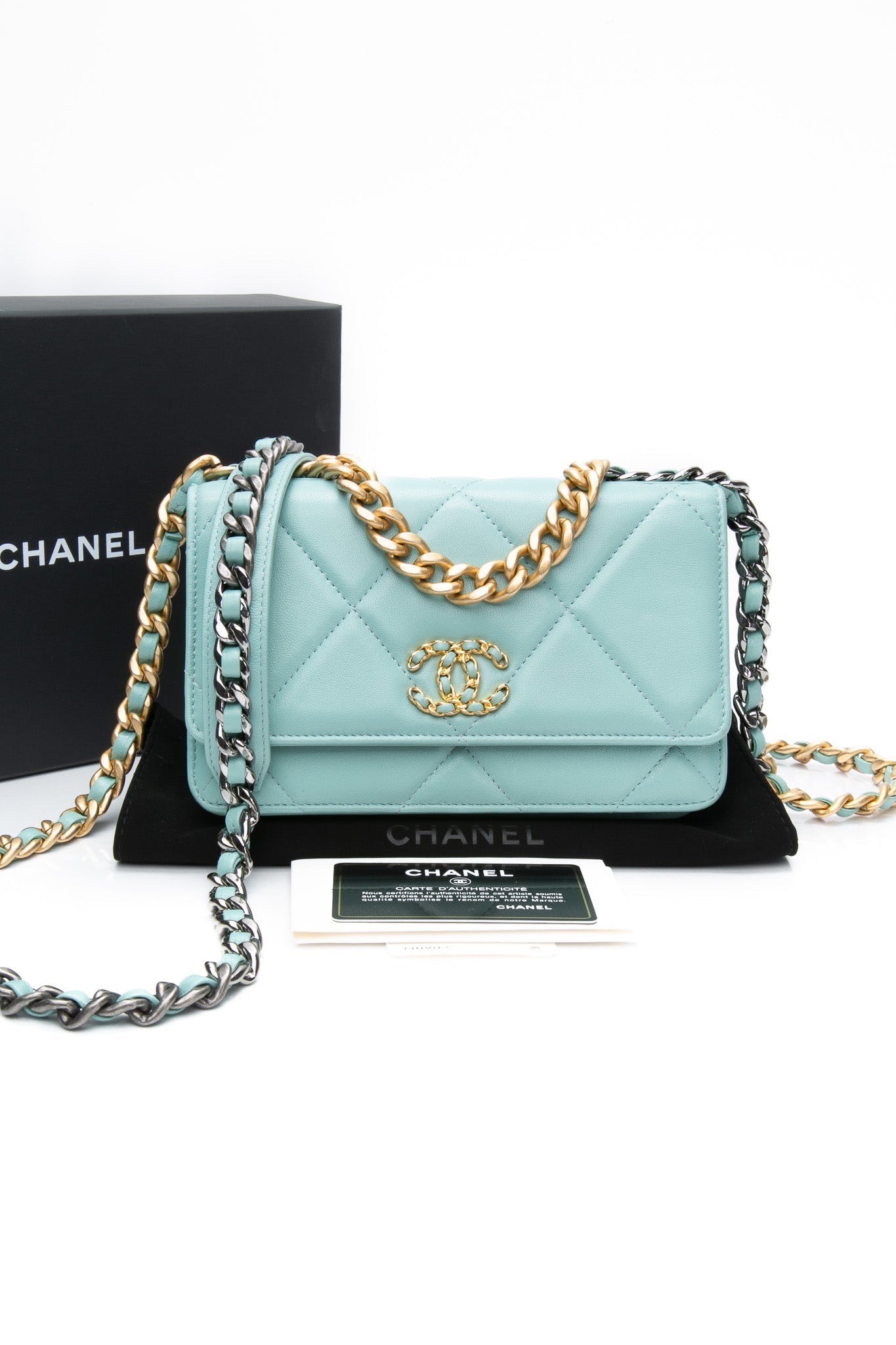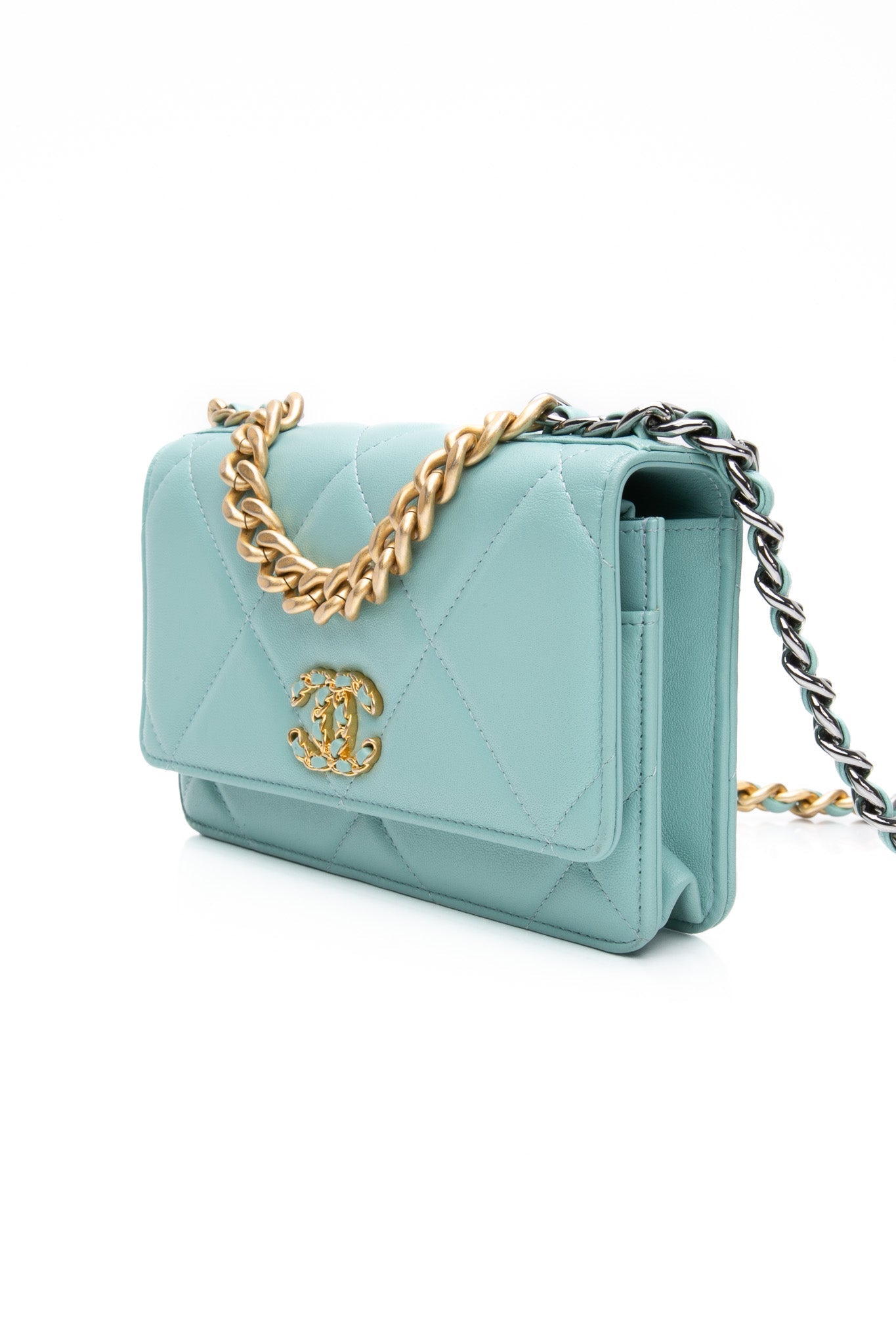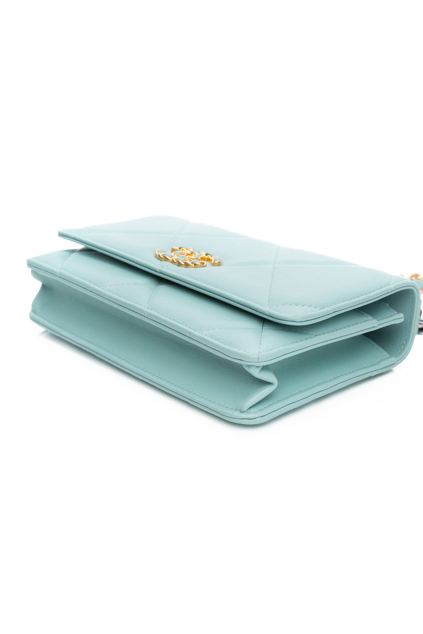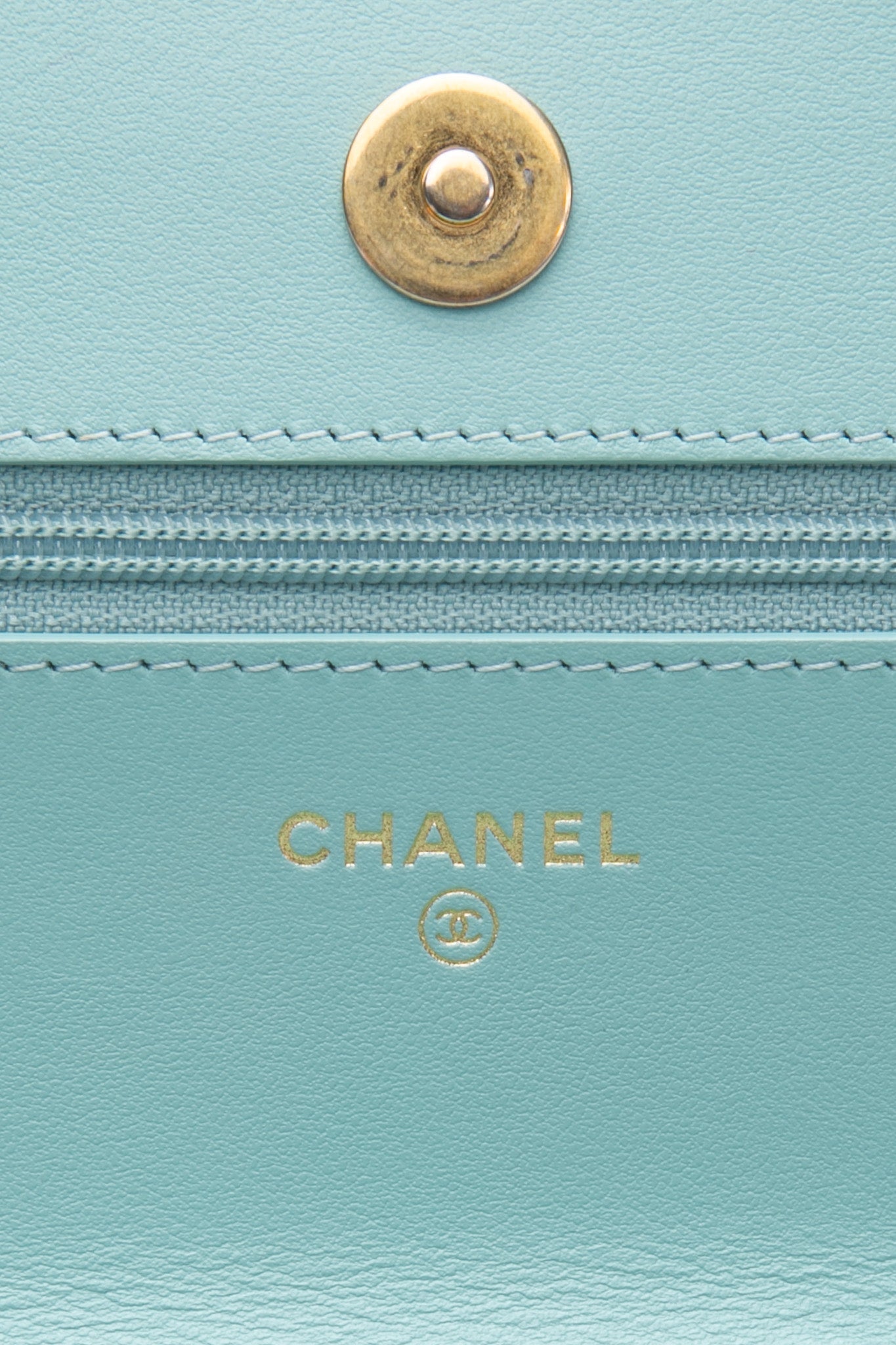 This stylish shoulder bag is crafted of diamond quilted lambskin leather in Tiffany blue. The refined bag features a Chanel CC embellishment on the flap and a leather threaded aged gold and ruthenium chain link shoulder strap with a shoulder pad. The front flap opens to a blue leather interior with zipper and patch pockets and card slots.