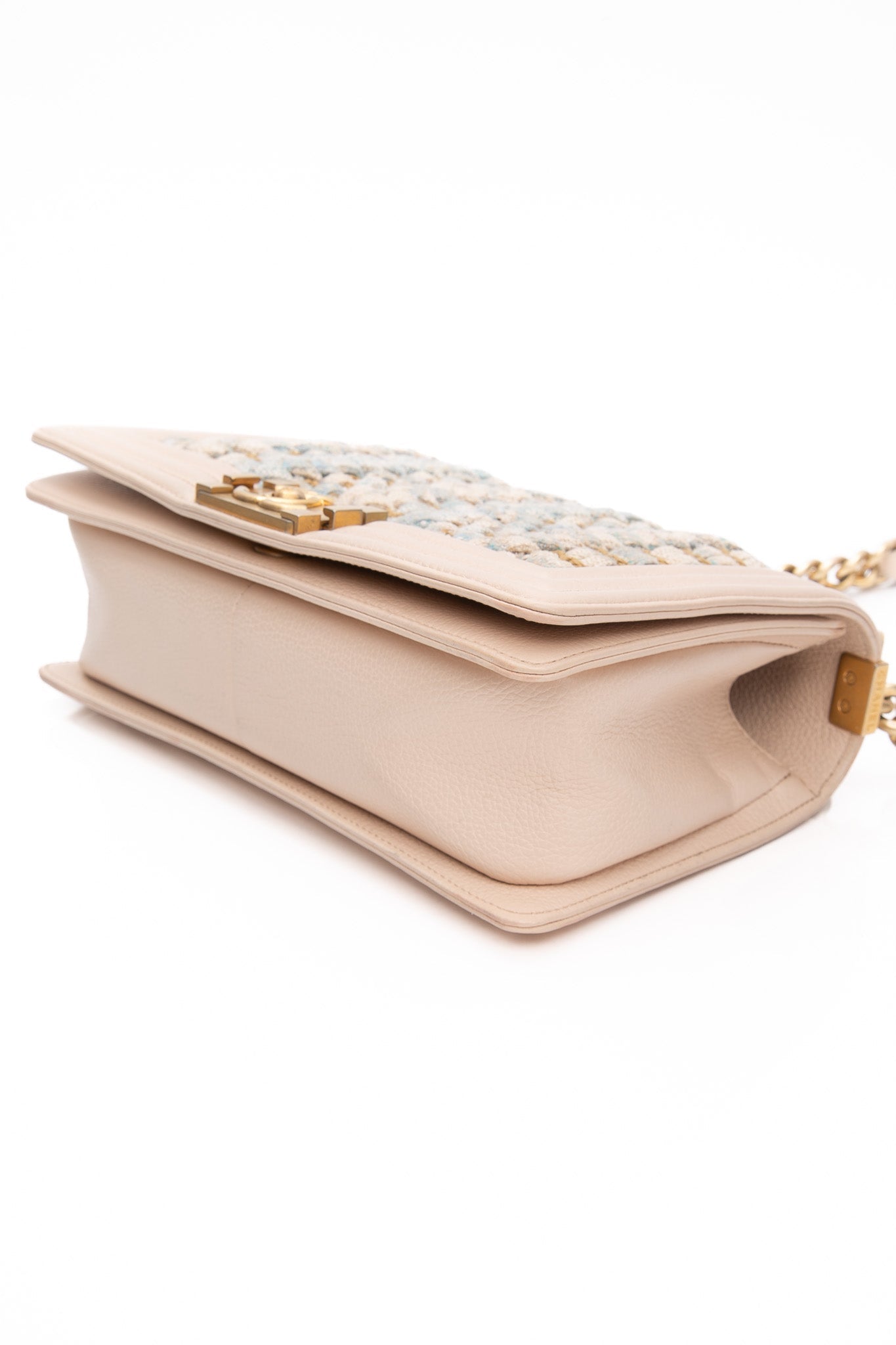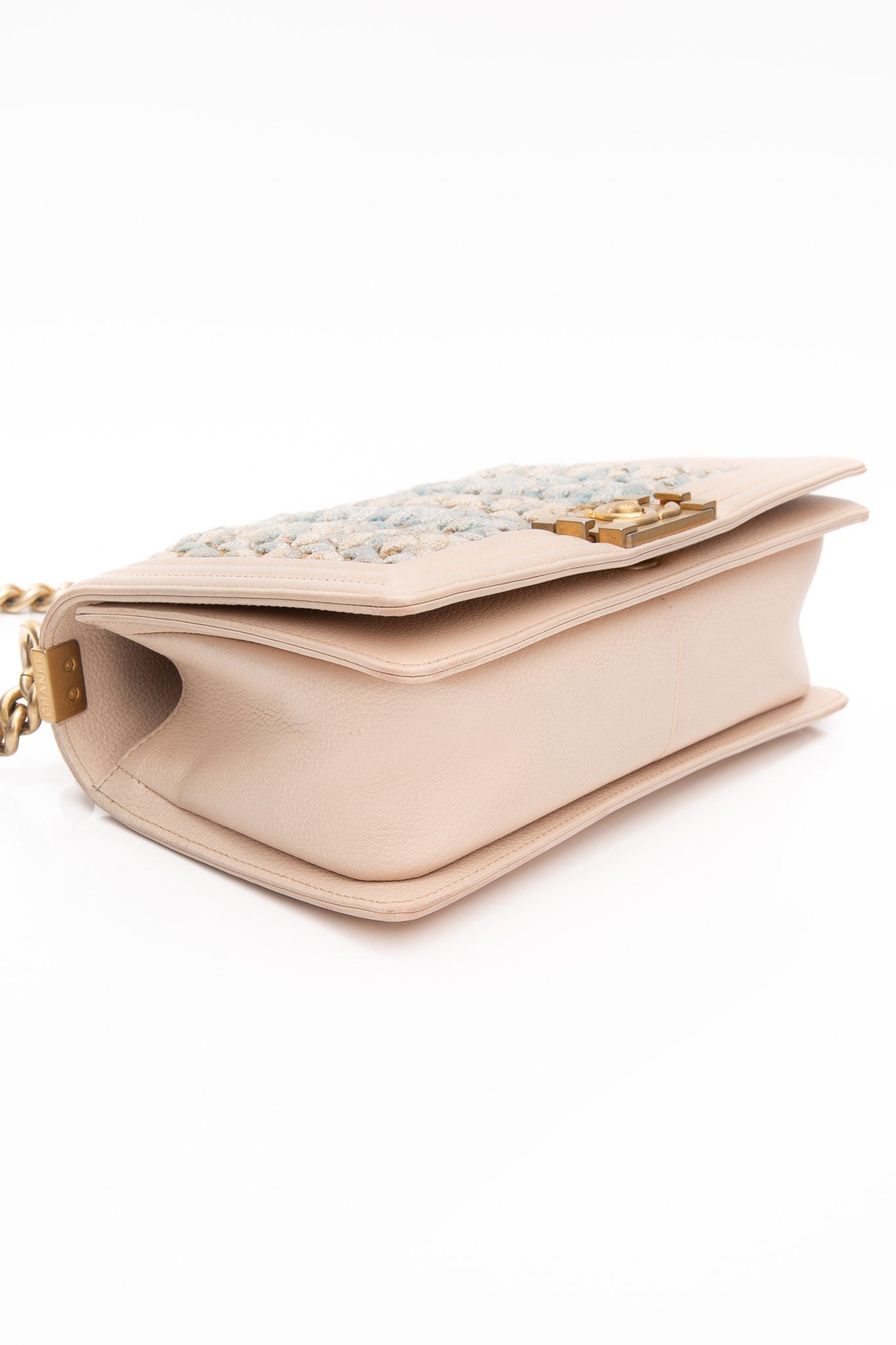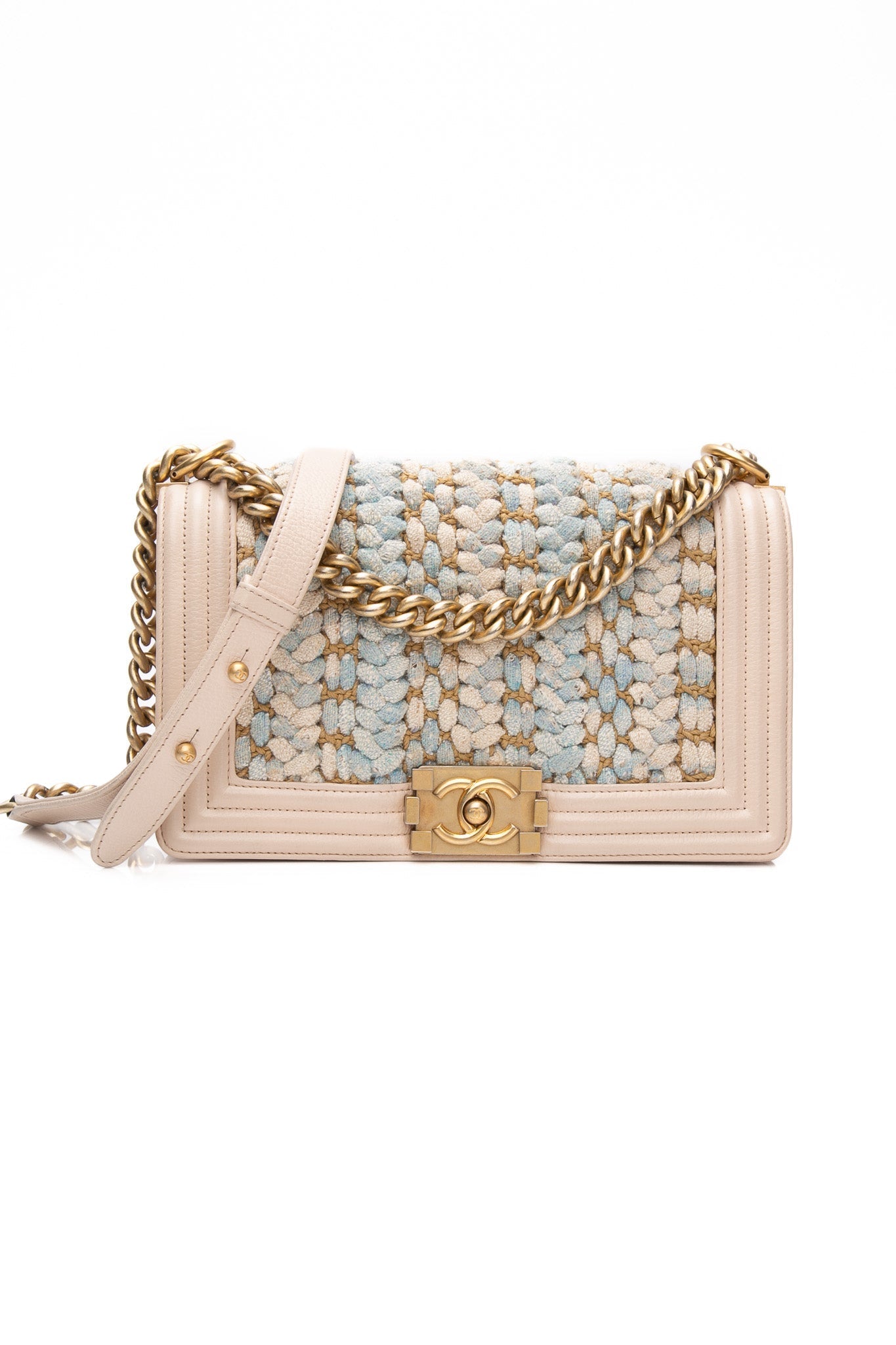 This chic shoulder bag is crafted of multi-colored tweed with a pink lambskin trim with prominent stitching that frames the flap edges. From Chanel’s Cuba-Inspired Cruise 2017 Collection, this bag features an aged gold chain shoulder strap with a leather shoulder pad, and a boy CC push lock. The flap opens to a fabric interior with a flat pocket.
