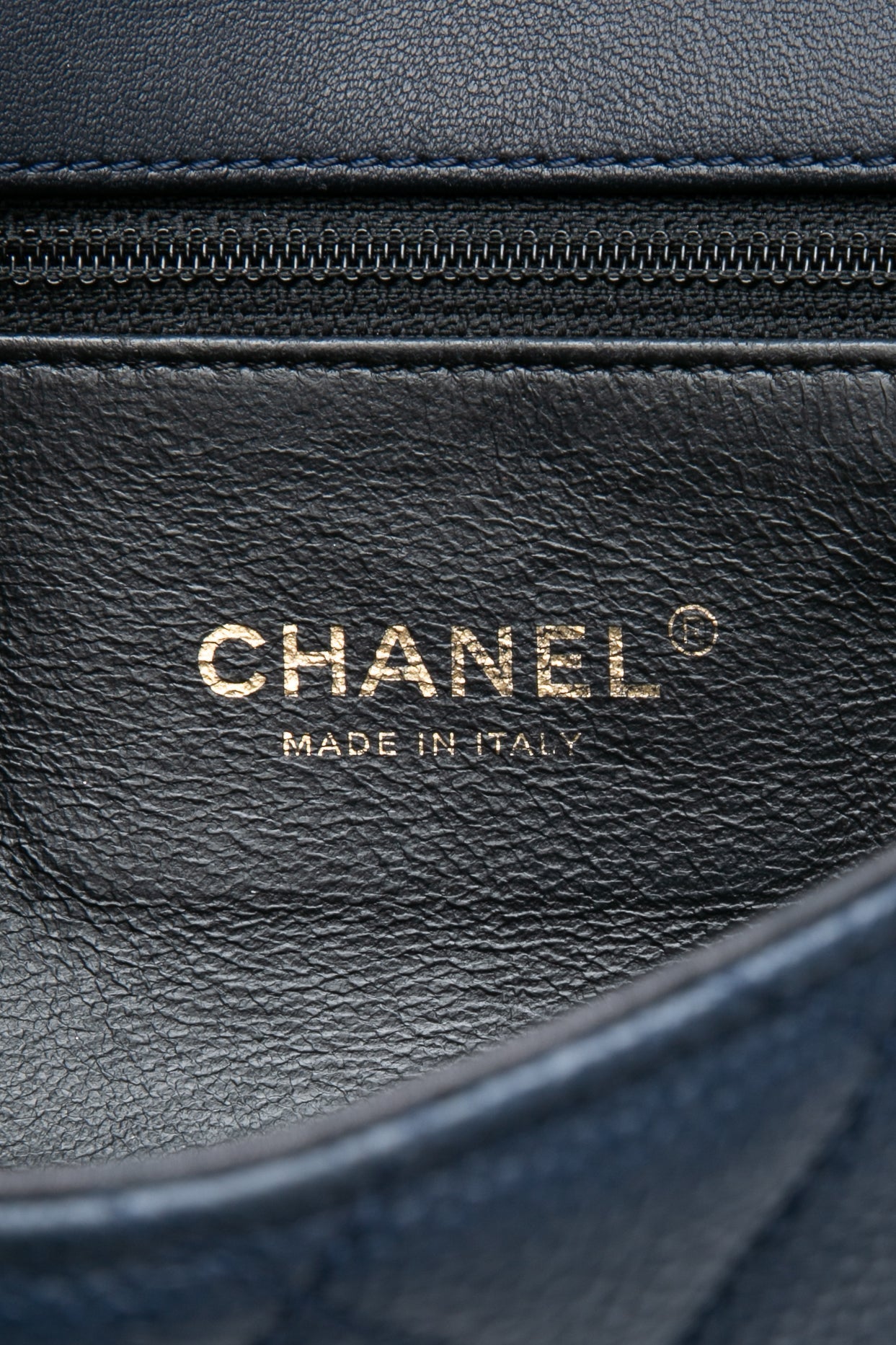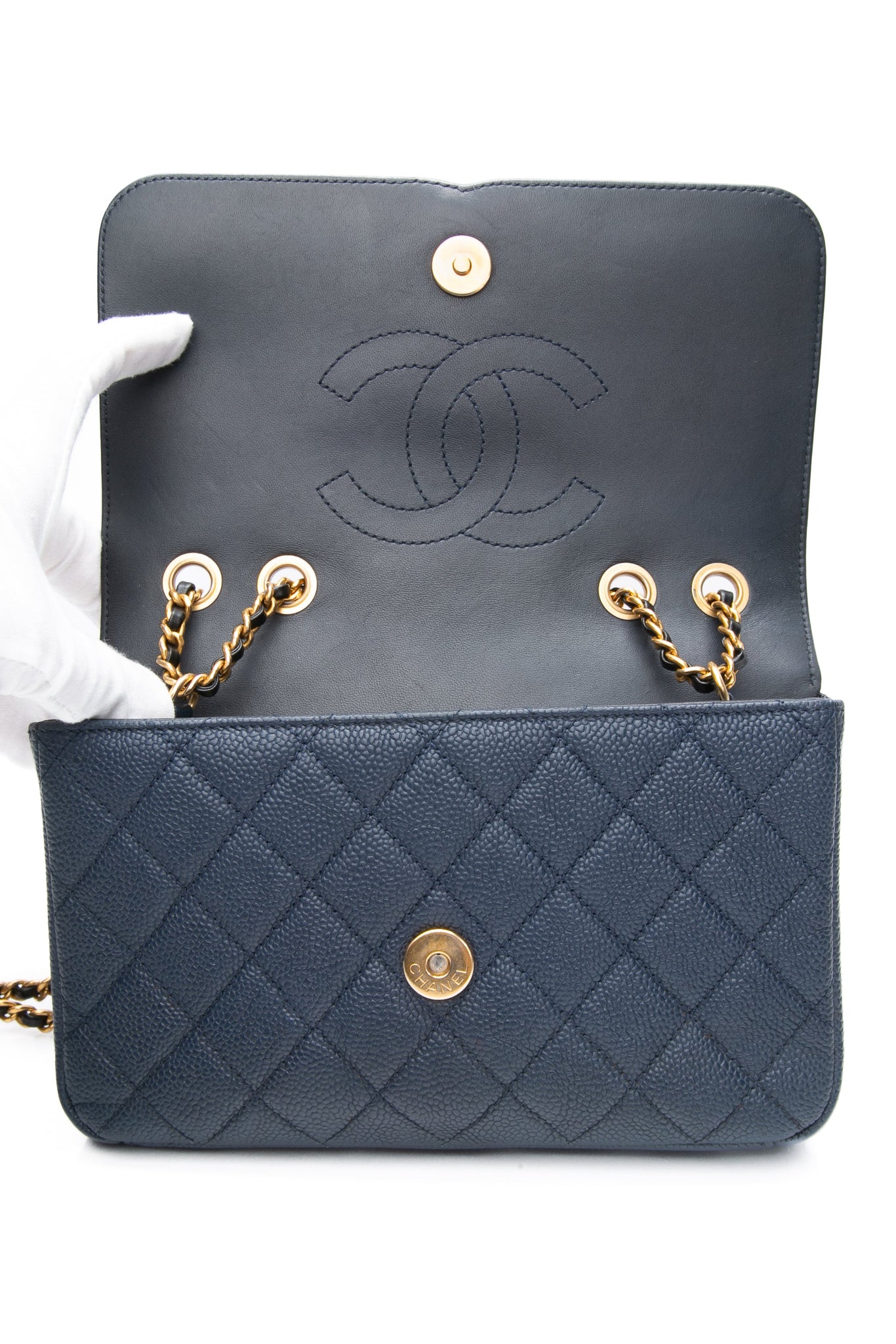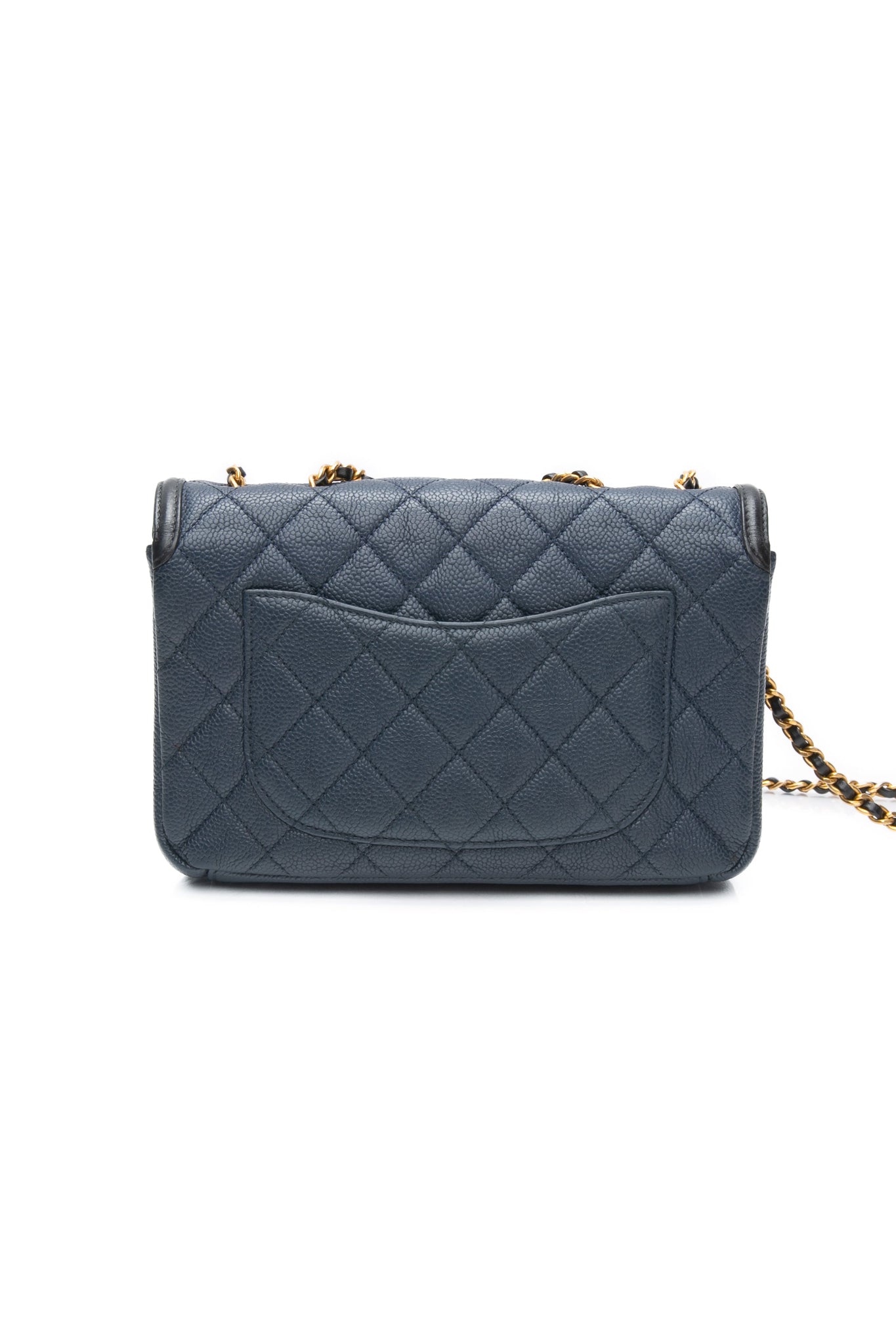 This stylish shoulder bag is crafted of luxurious caviar leather in navy blue. The bag features black leather trim, matte gold chain link leather threaded shoulder straps and a black leather Chanel CC stitched logo on the frontal flap. This opens to a black leather interior with zipper and patch pockets.