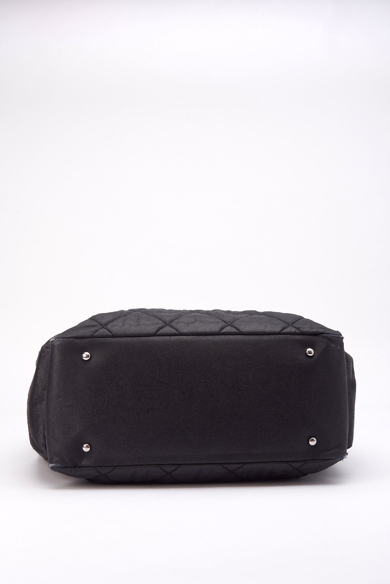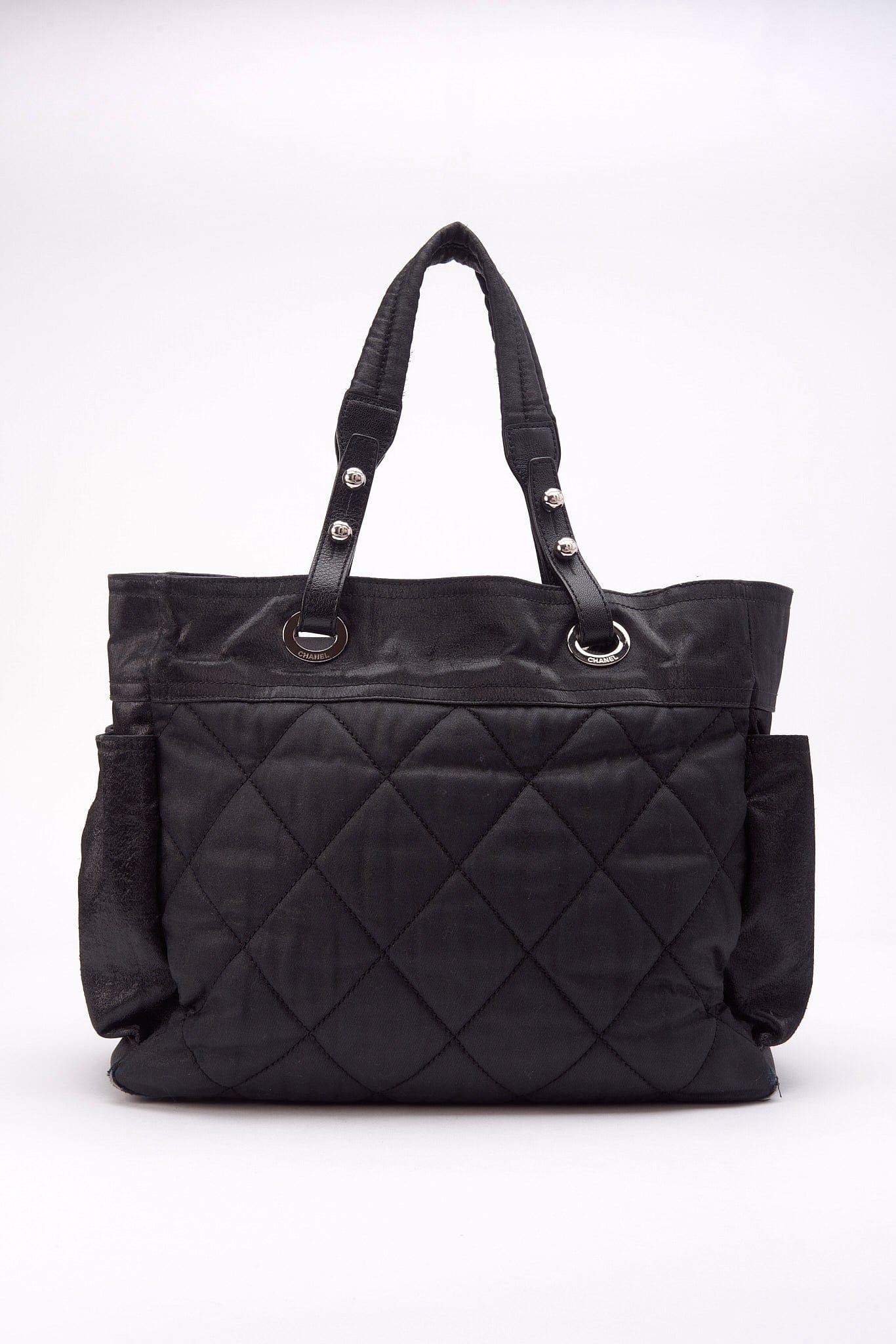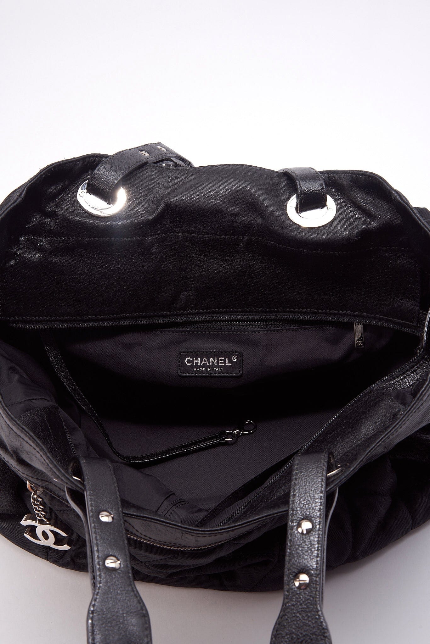 A super cool Chanel Paris Biarritz tote bag made from black nylon with black leather trim and silver hardware.