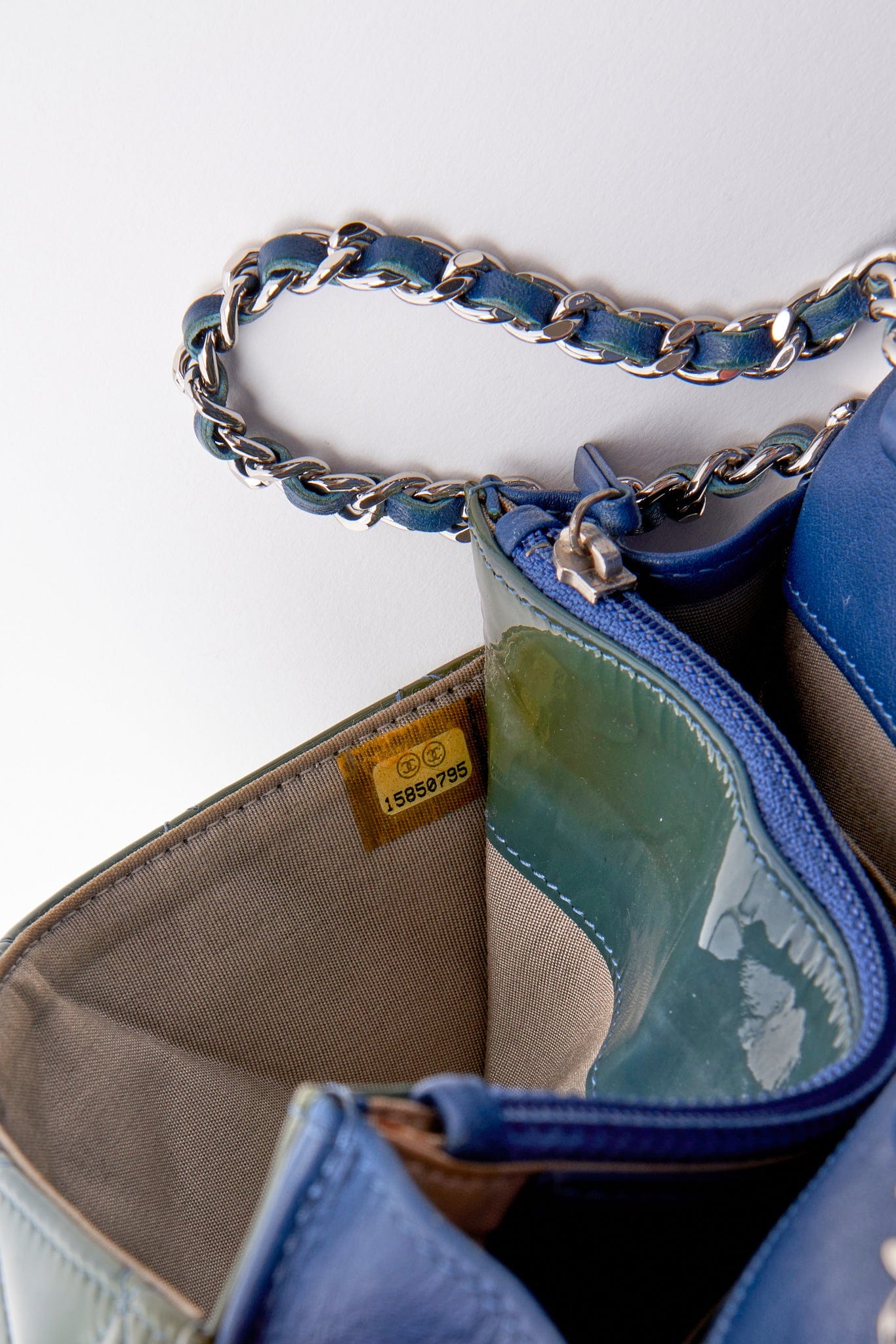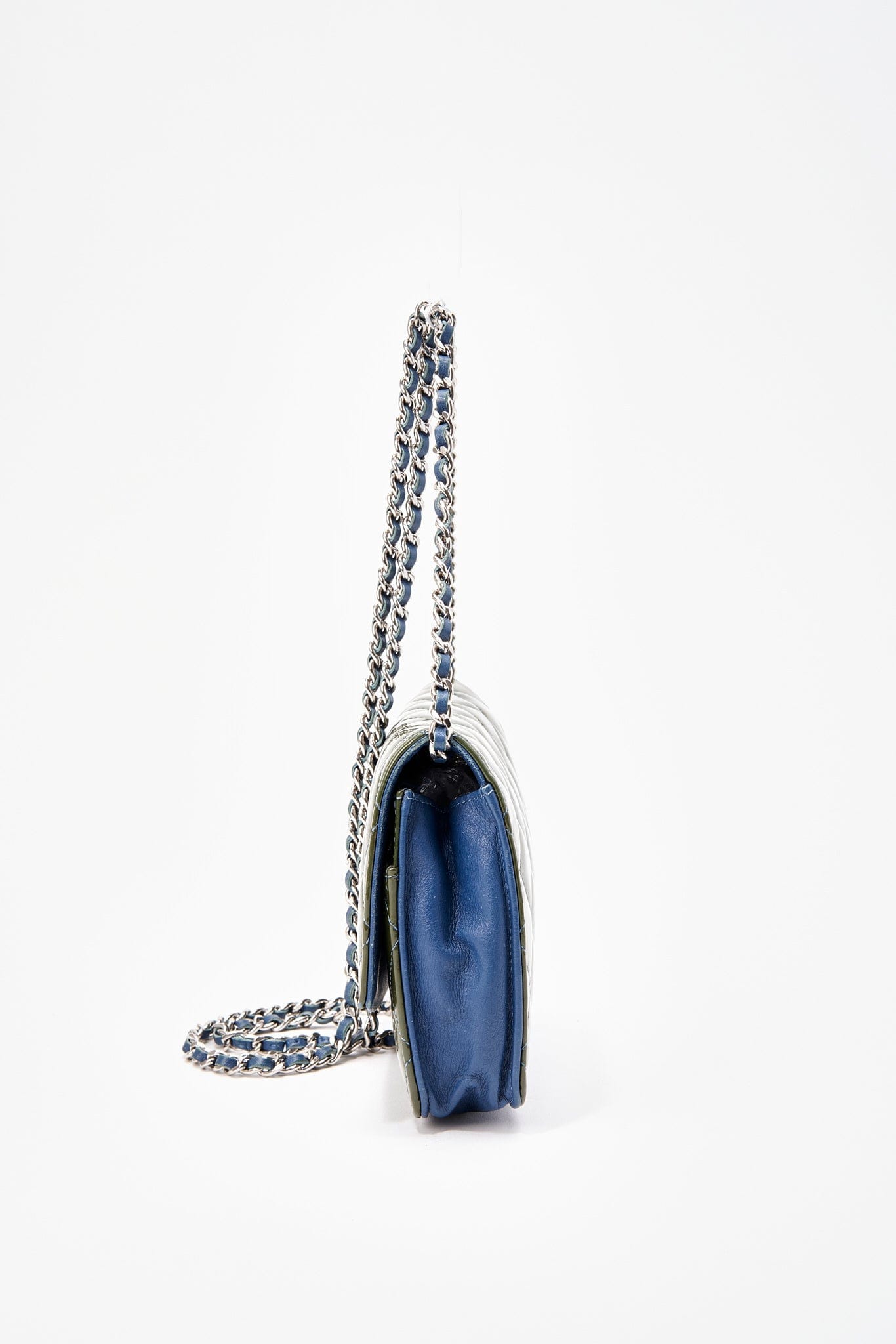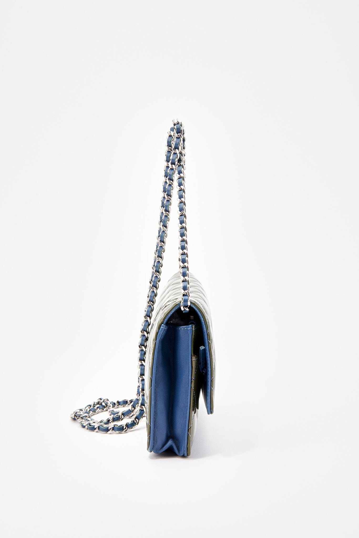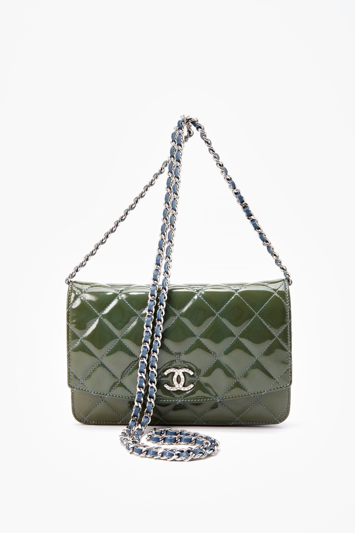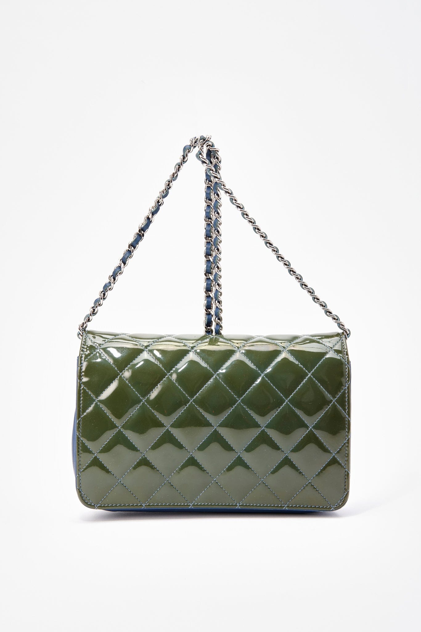 This Chanel wallet on chain, WOC, is crafted from a patent green leather mixed with a blue lambskin leather, featuring silver hardware and a single leather-trimmed chain-link shoulder strap.
