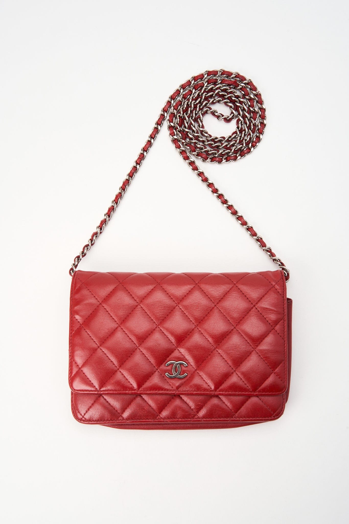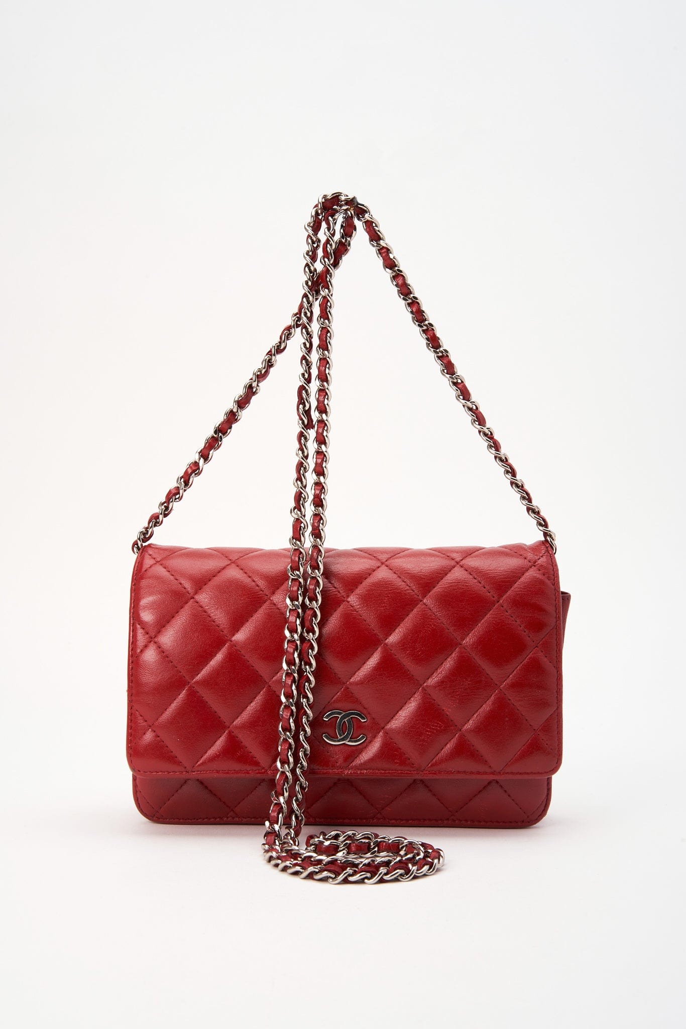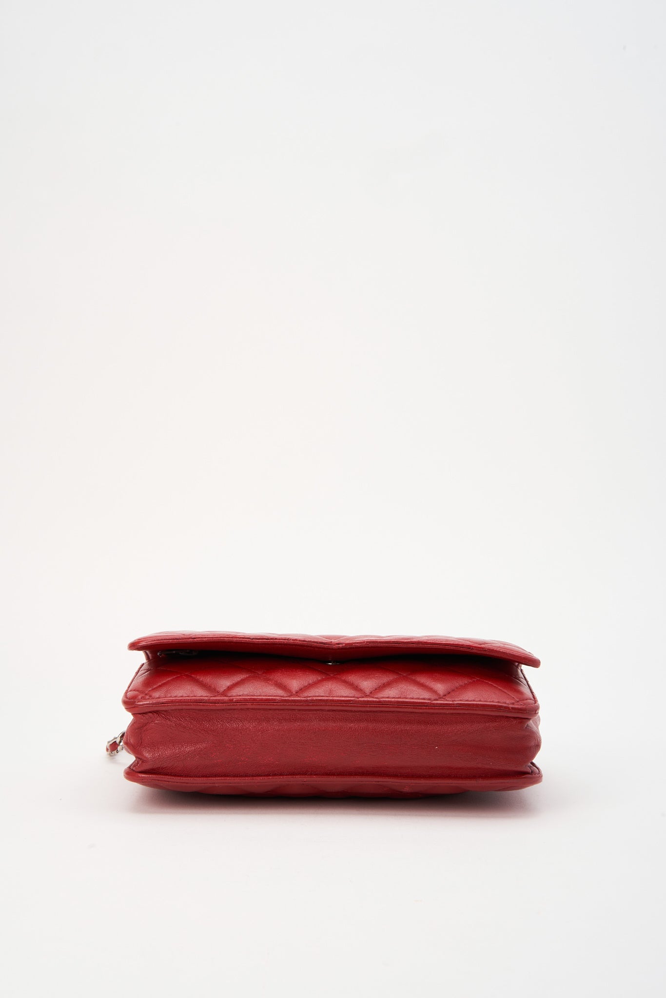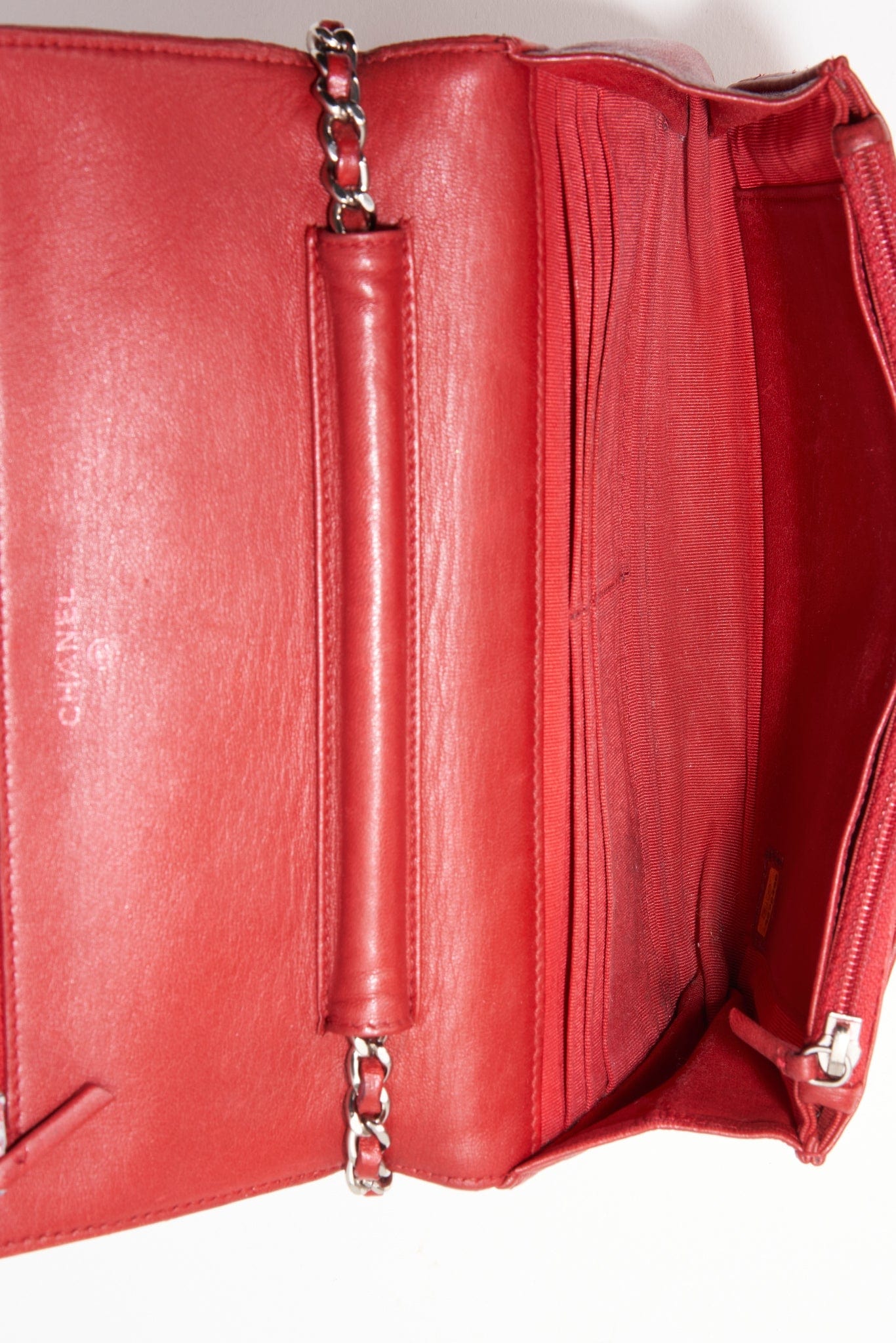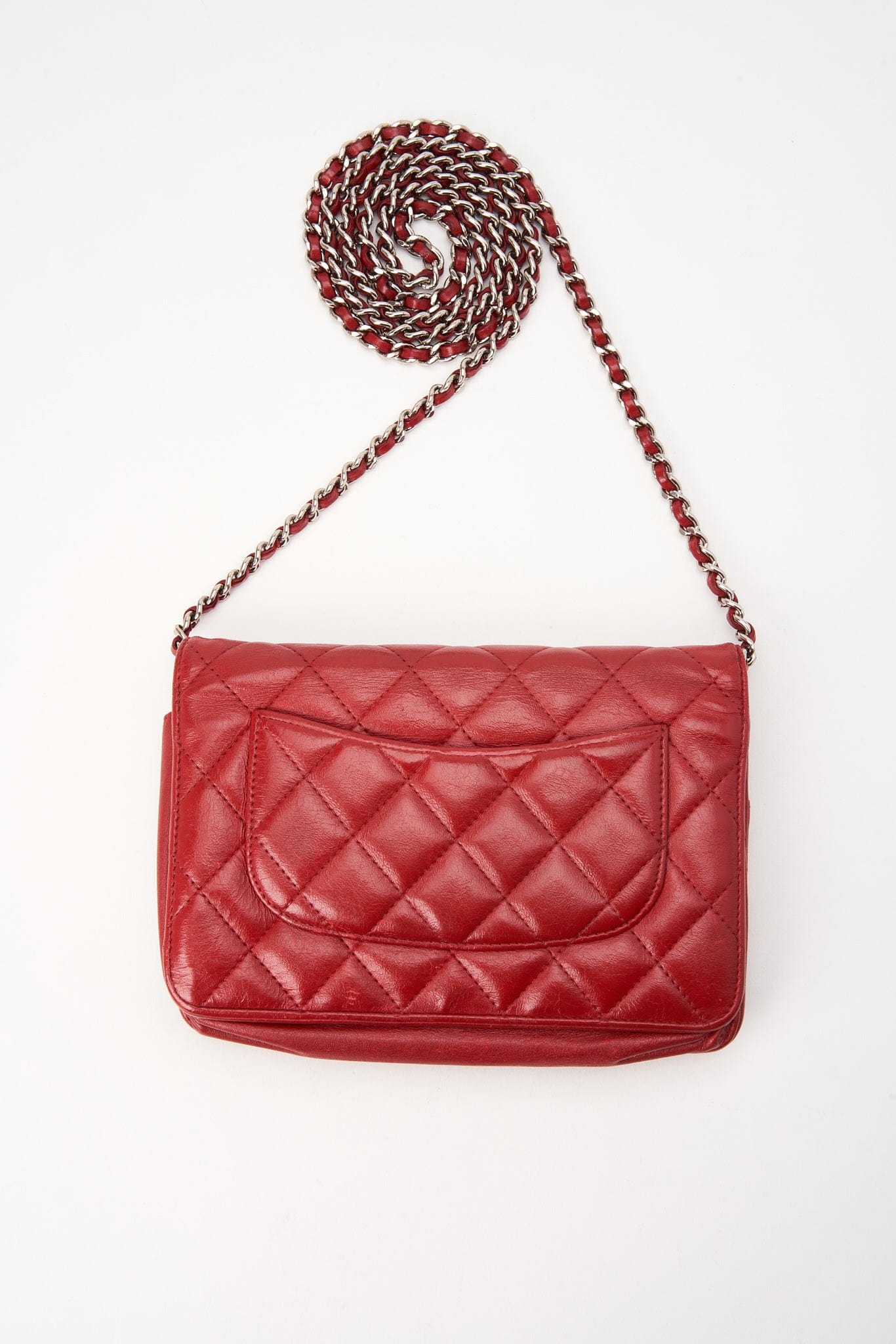 This Chanel wallet on chain, WOC, is crafted from a red smooth lambskin leather, silver hardware and a single leather-trimmed chain-link shoulder strap.