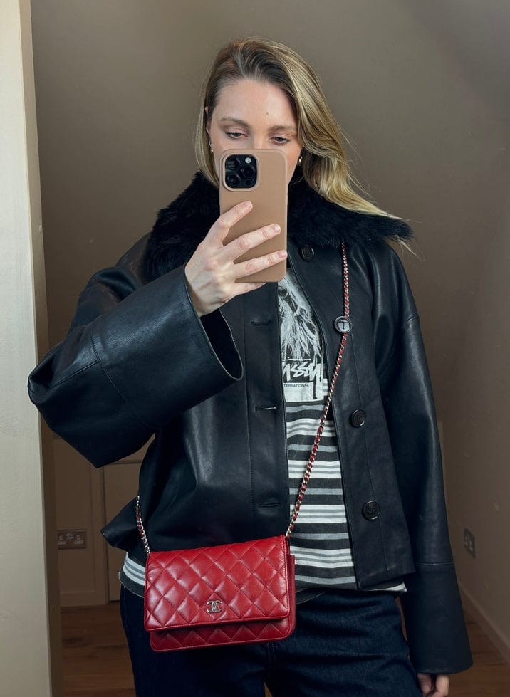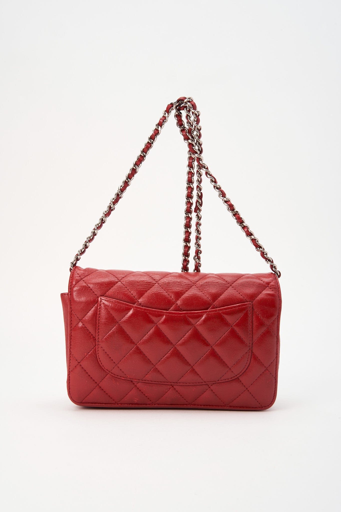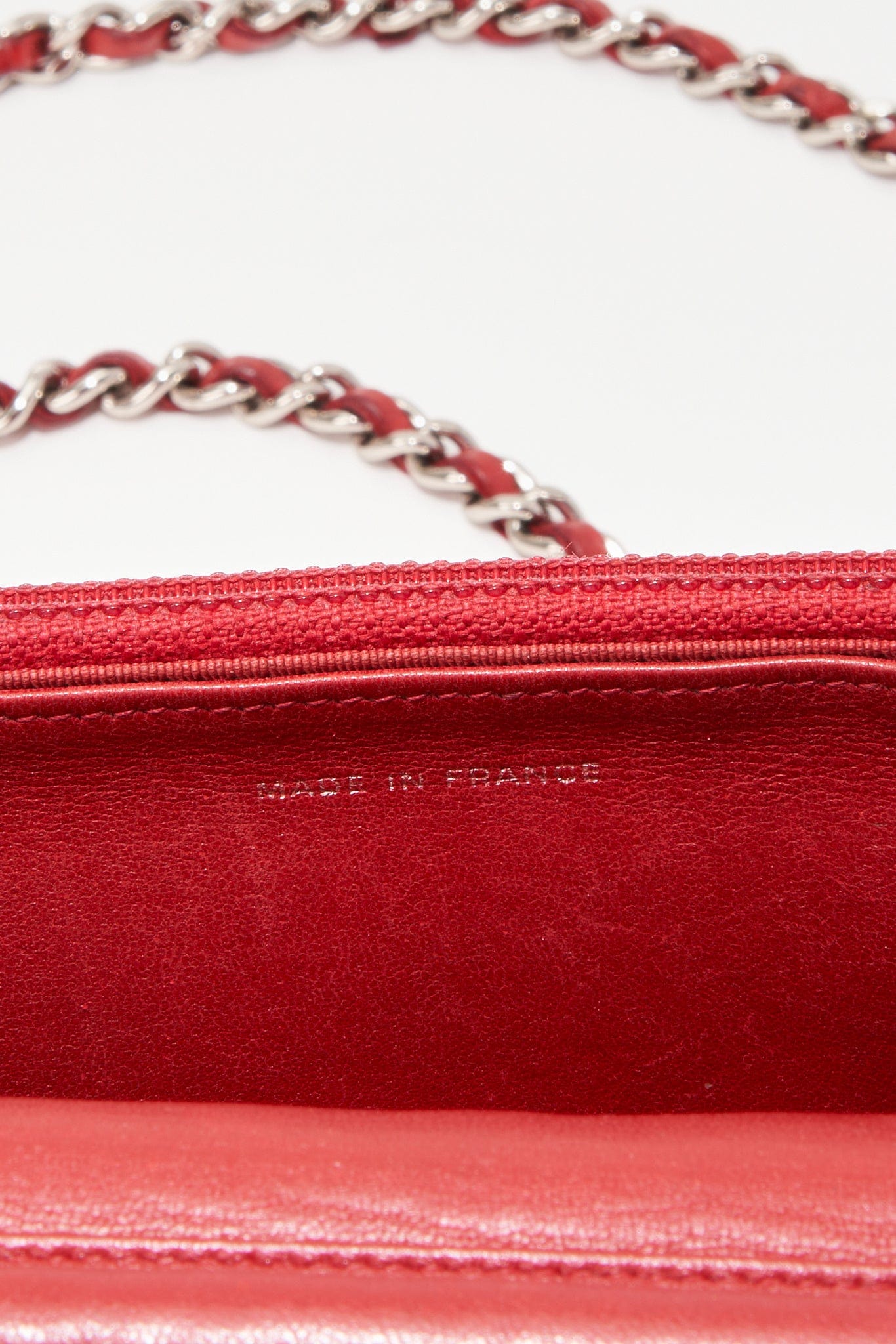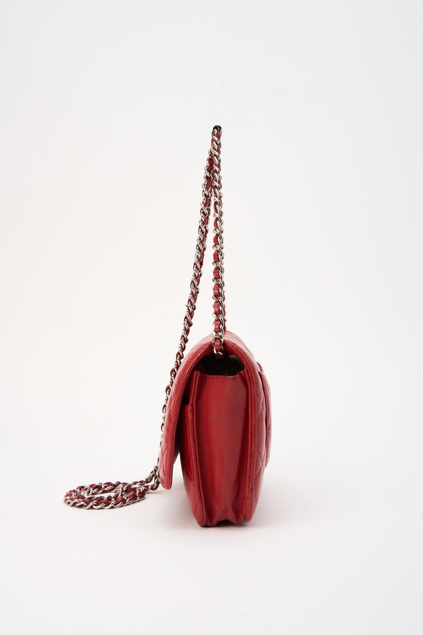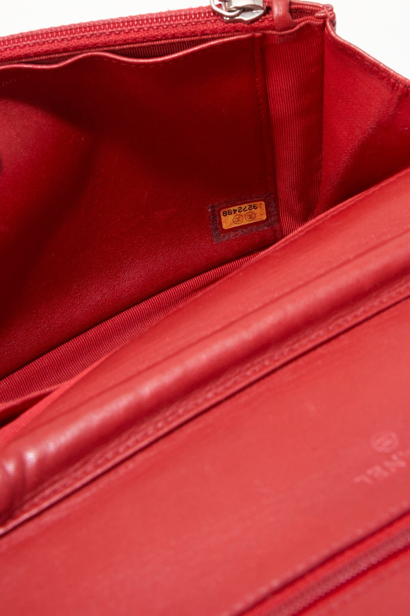 This Chanel wallet on chain, WOC, is crafted from a red smooth lambskin leather, silver hardware and a single leather-trimmed chain-link shoulder strap.