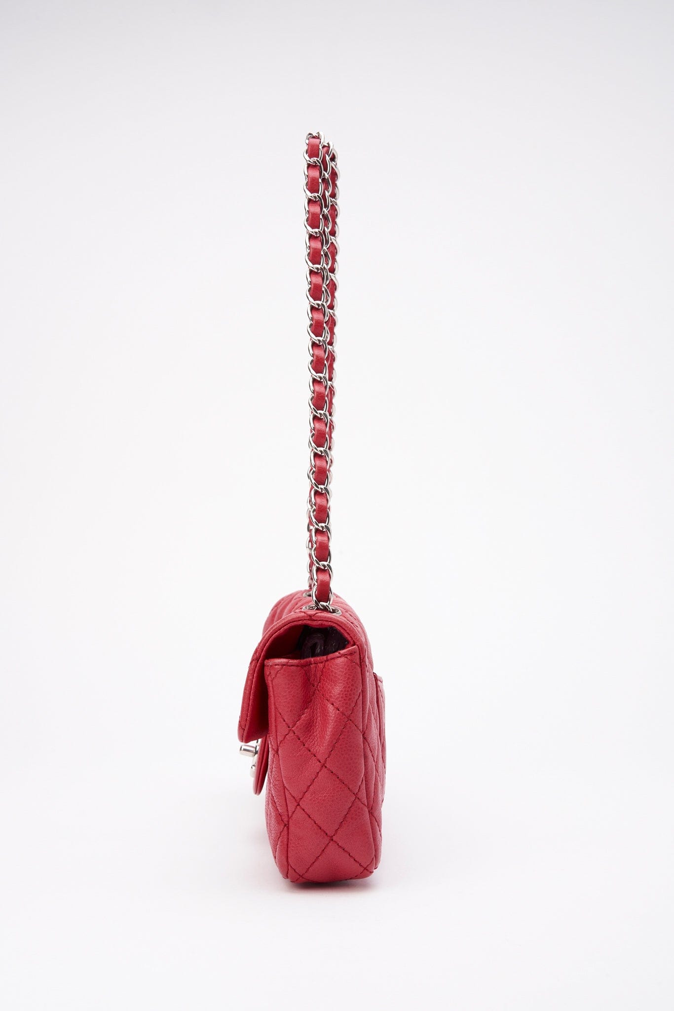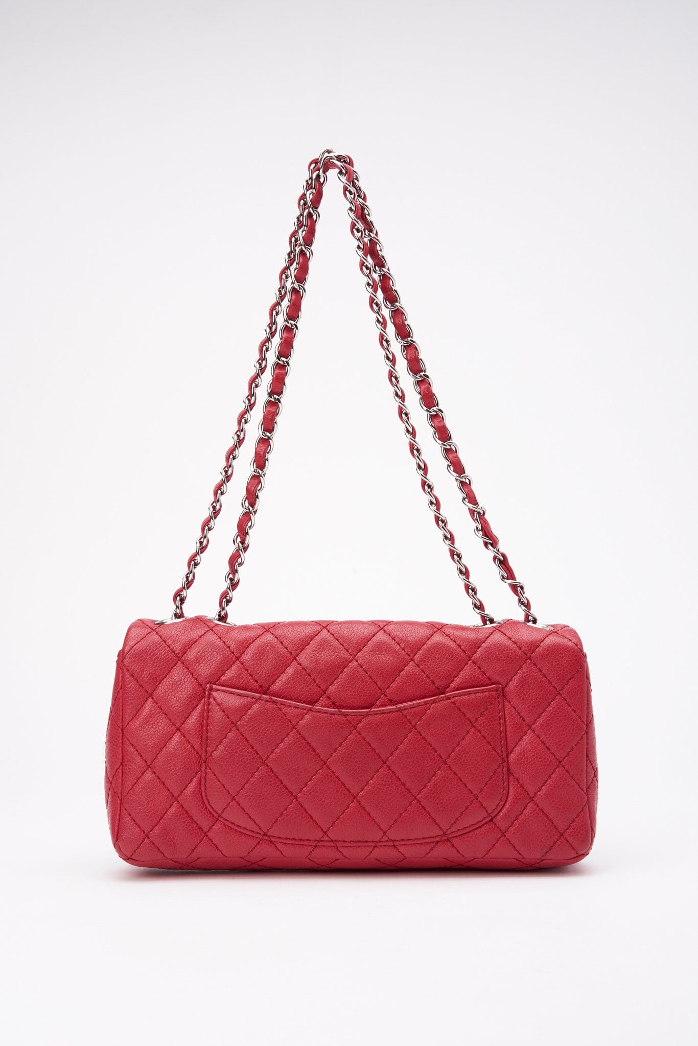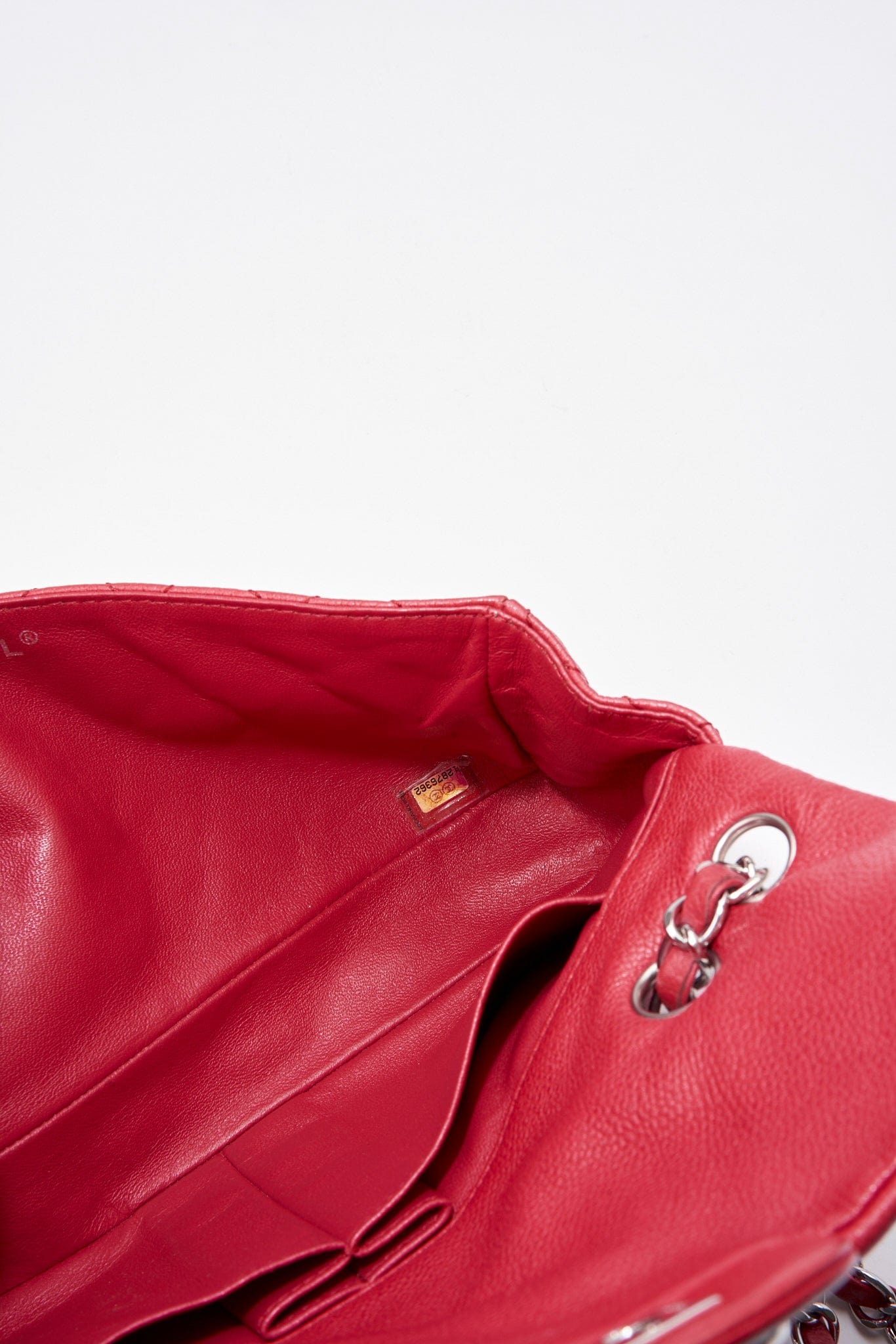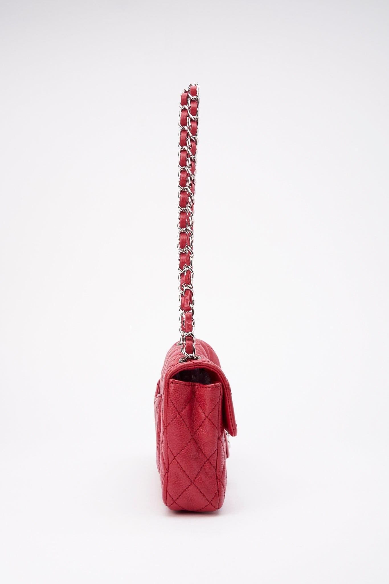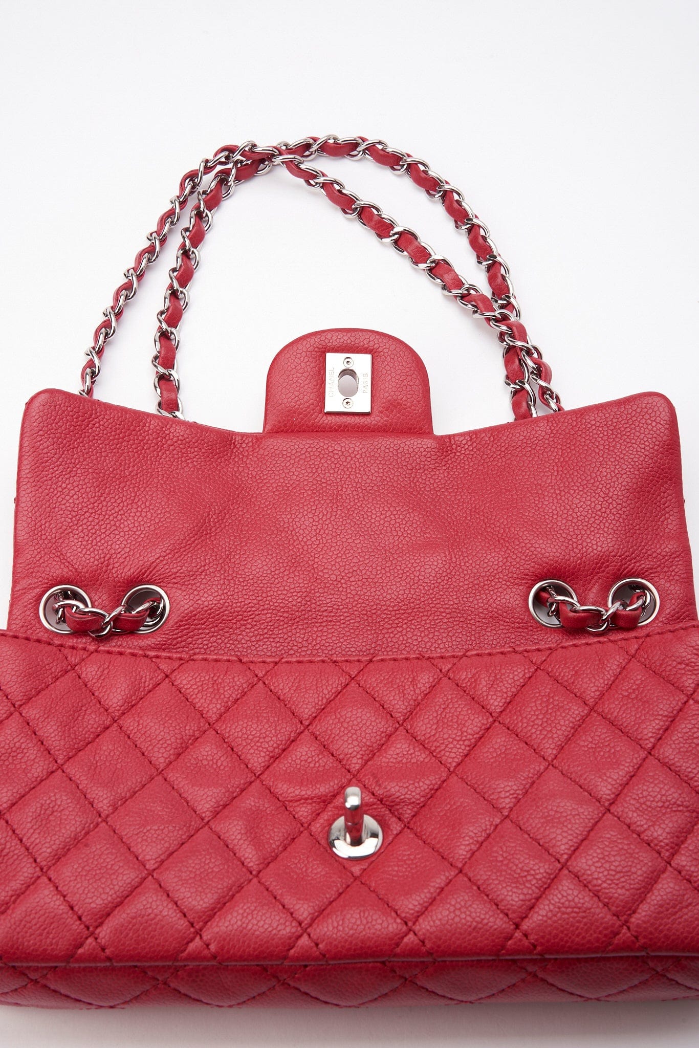 This Classic Chanel Single Flap bag is crafted from a raspberry red caviar quilted leather with silver hardware and a leather-trimmed chain-link shoulder strap.