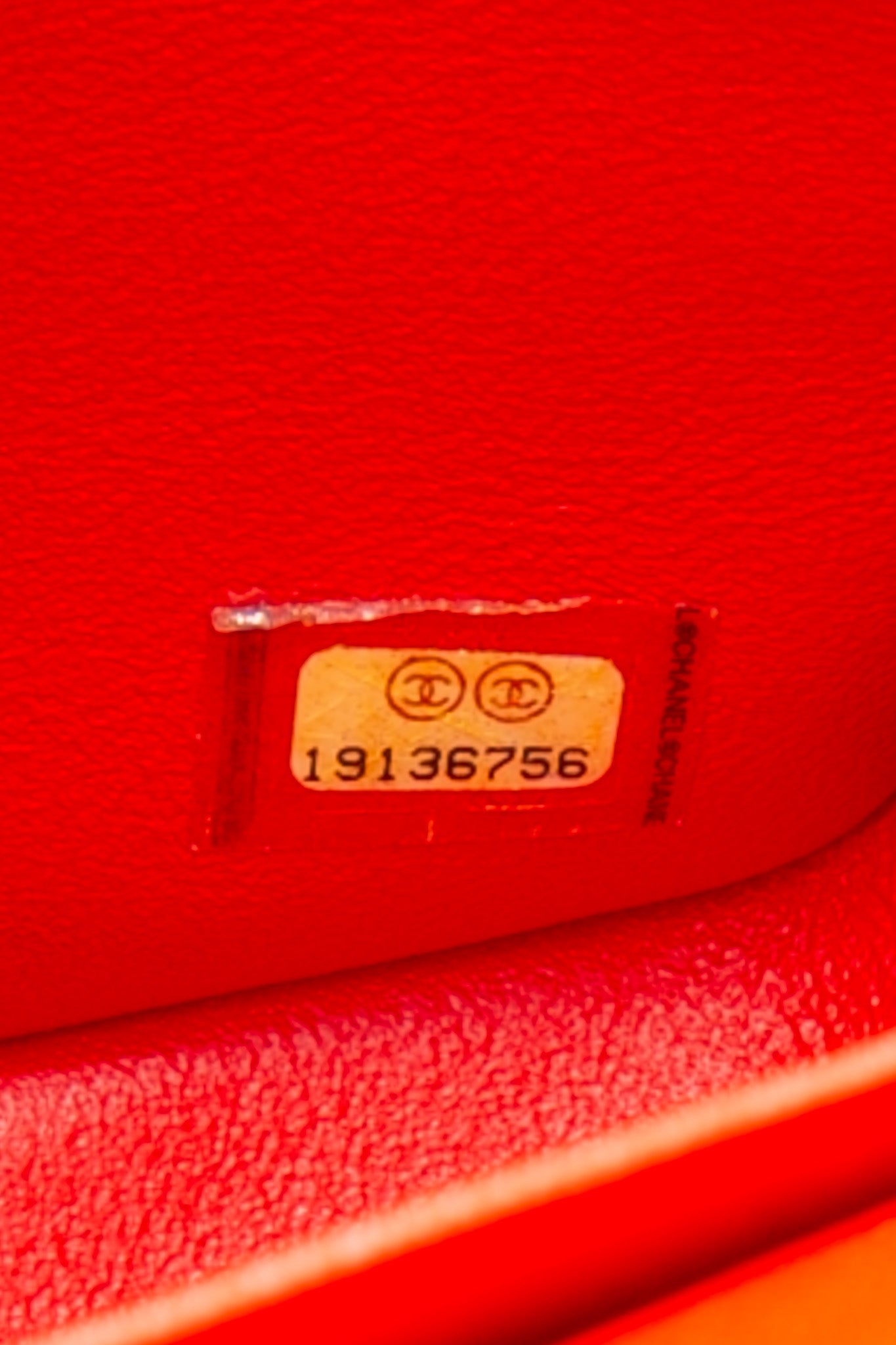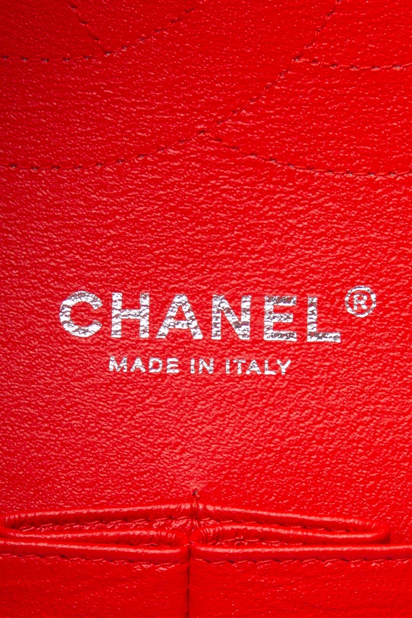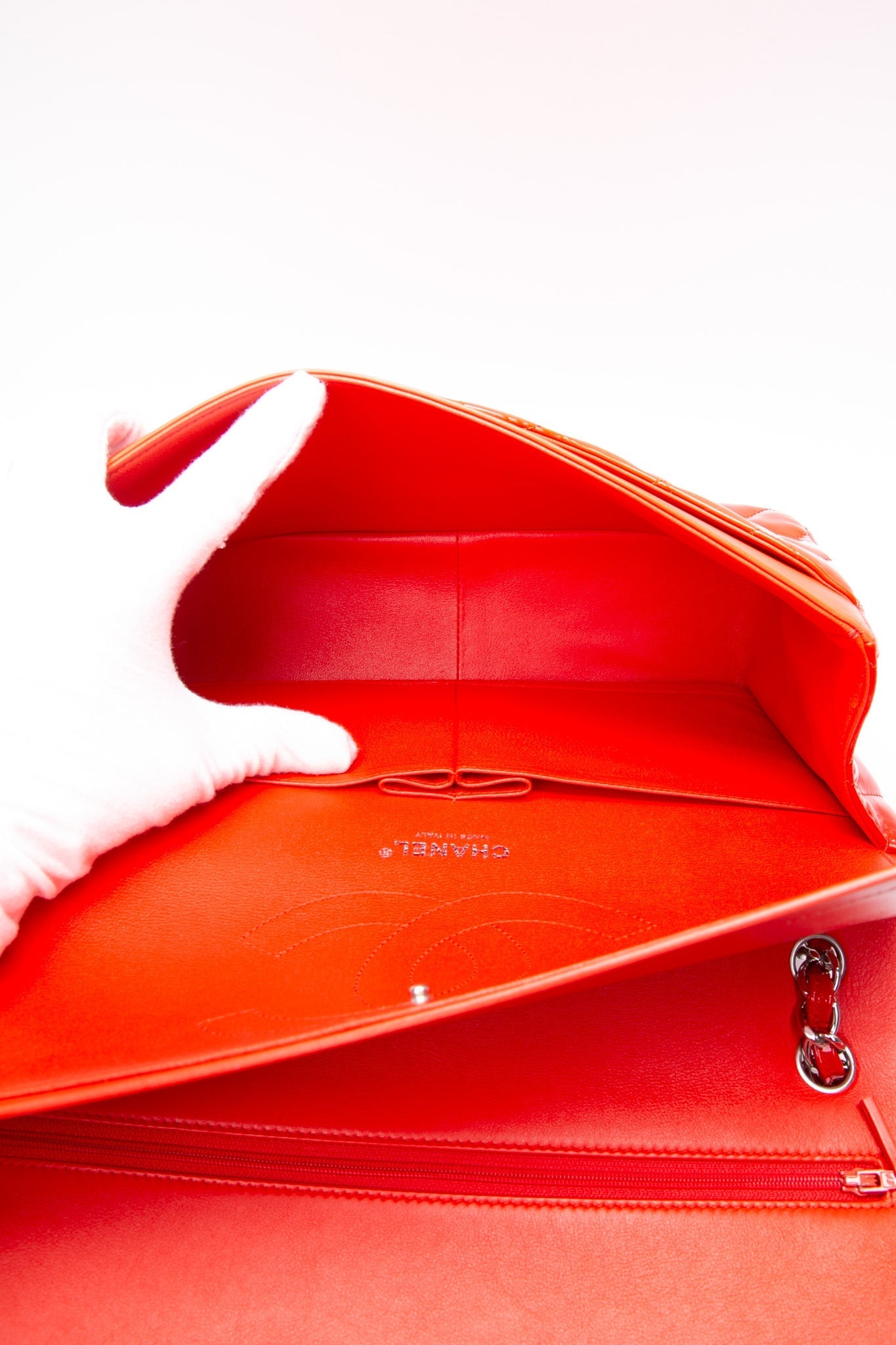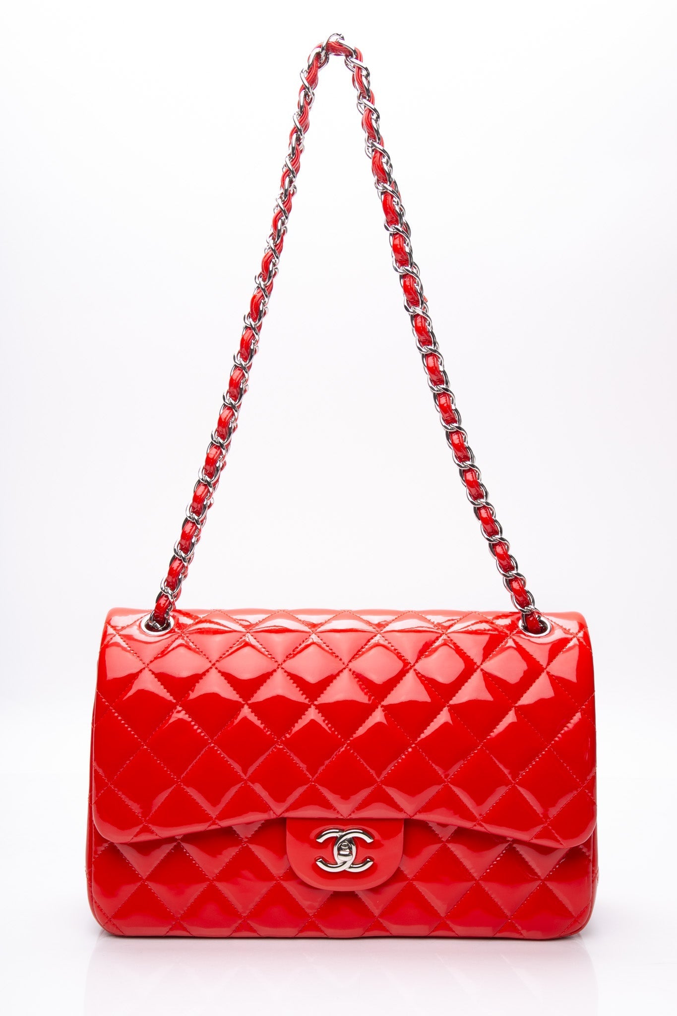 This shoulder bag is crafted of diamond-quilted patent leather in red. The bag features a silver chain-link leather-threaded shoulder strap and a facing silver Chanel CC turn-lock. This opens the facing flap to reveal an inner flap and a matte leather interior with patch pockets.
