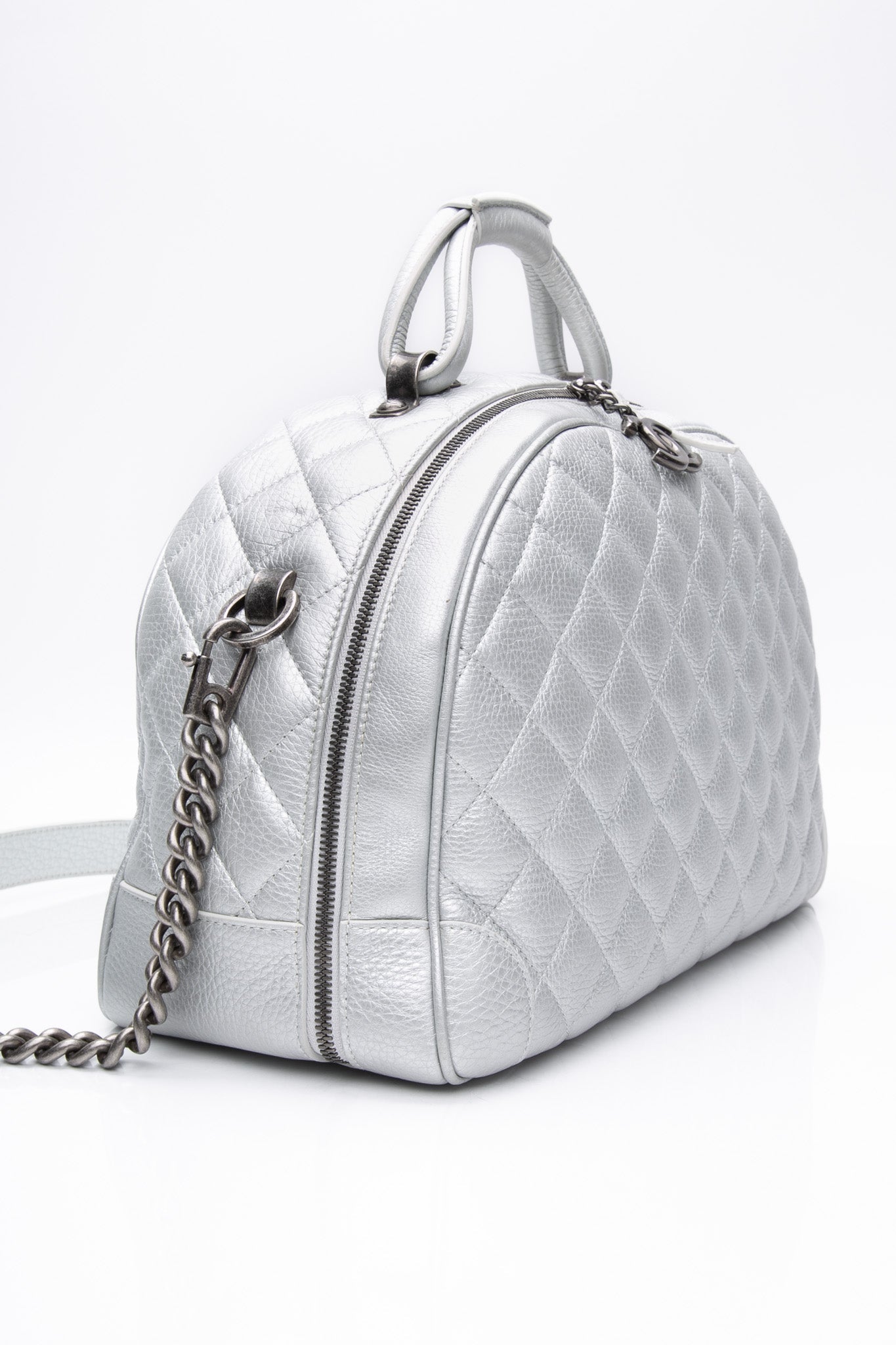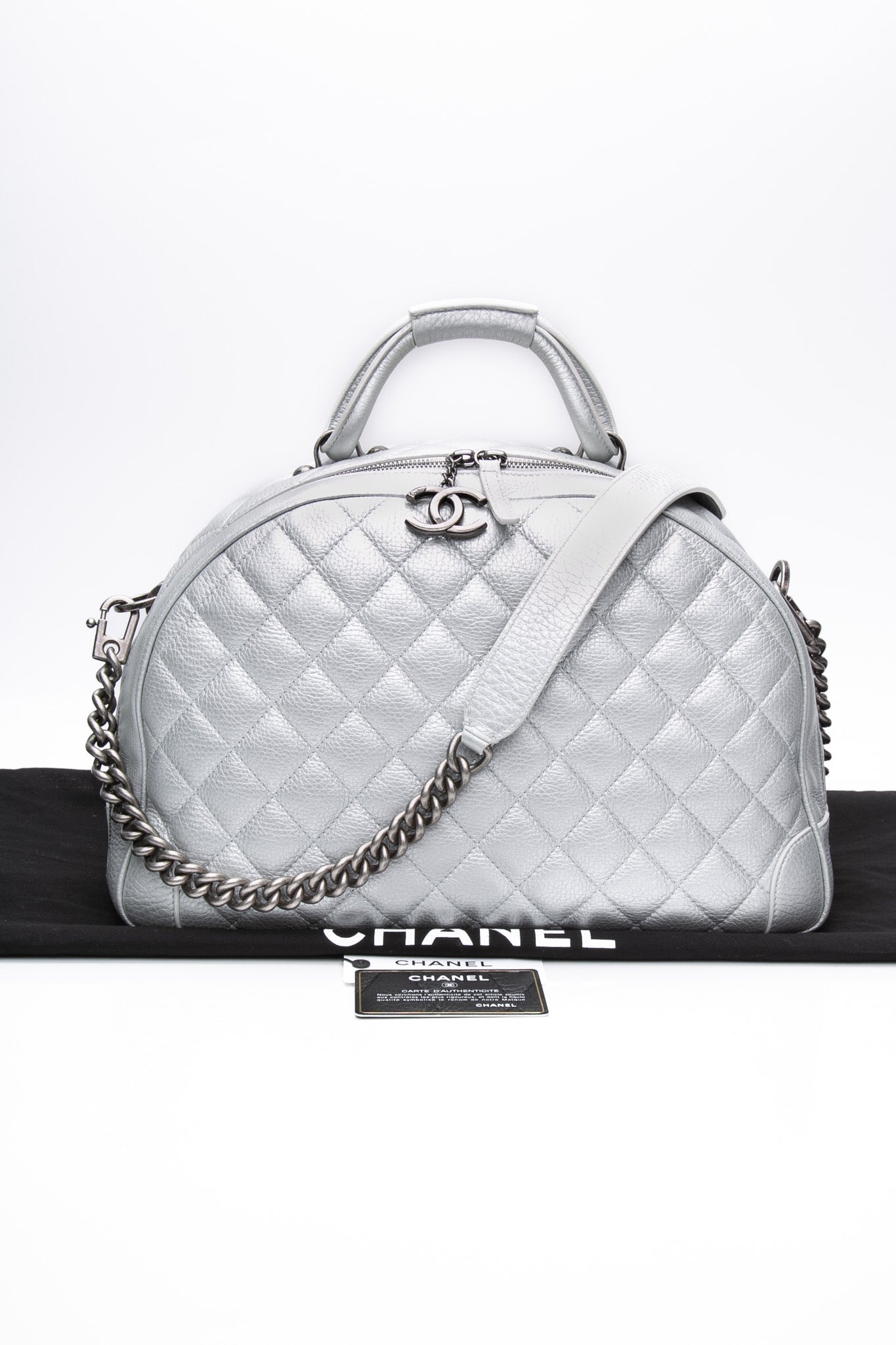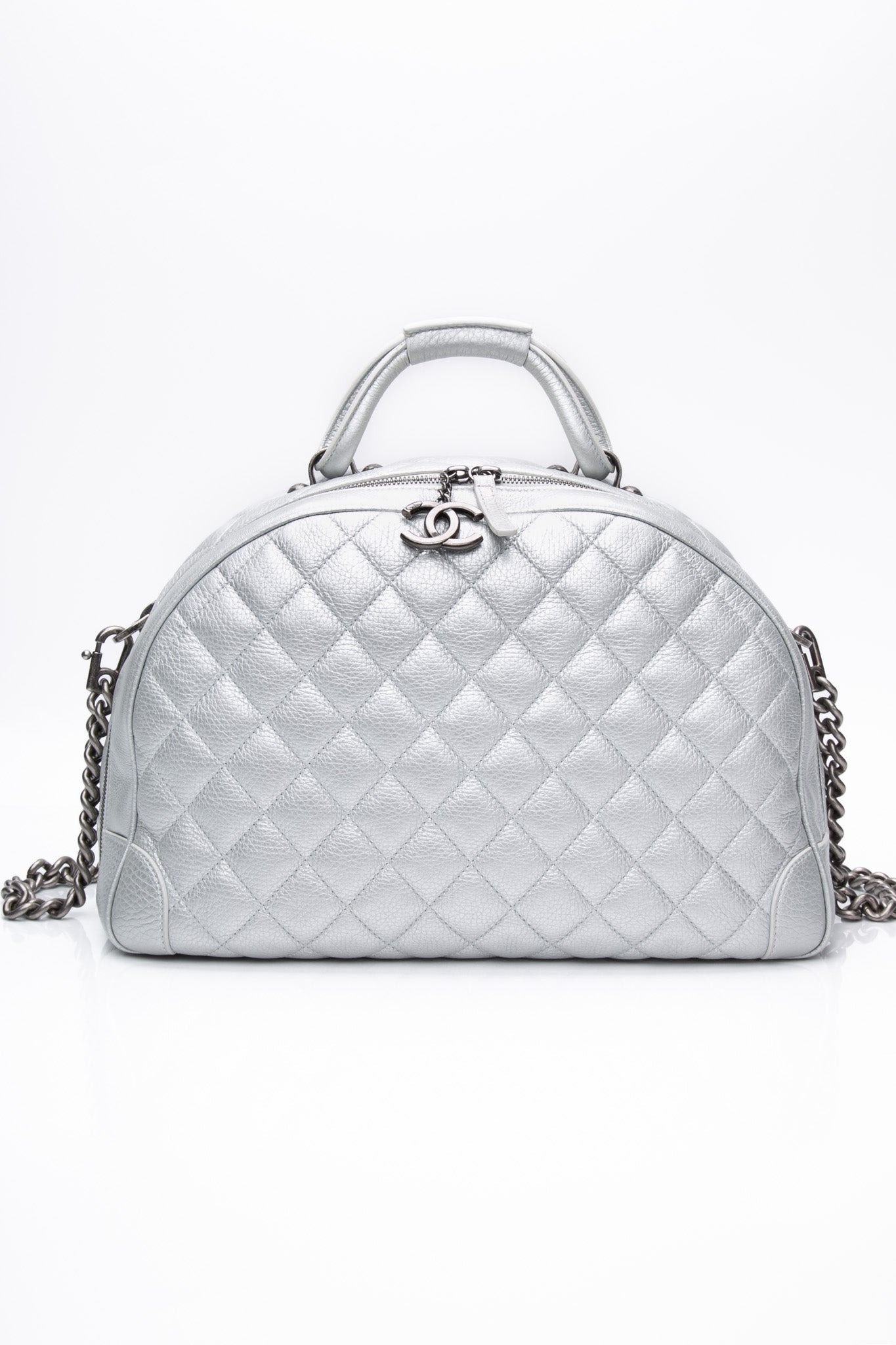 This lovely tote is crafted of diamond quilted calfskin leather in silver. The bag features a leather top handle, a ruthenium shoulder strap with a shoulder pad and ruthenium hardware. The wrap around zipper opens to a spacious grey fabric interior with zipper and patch pockets.