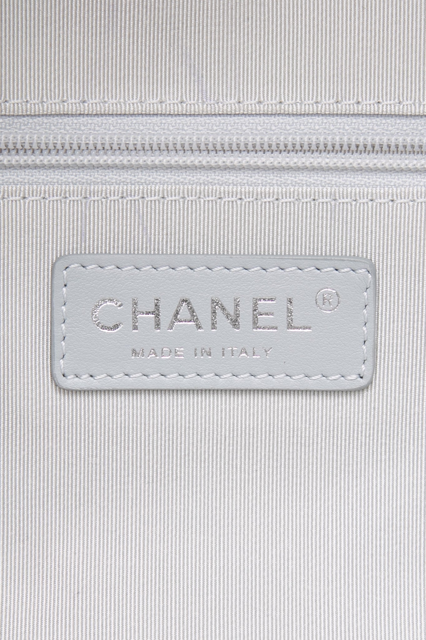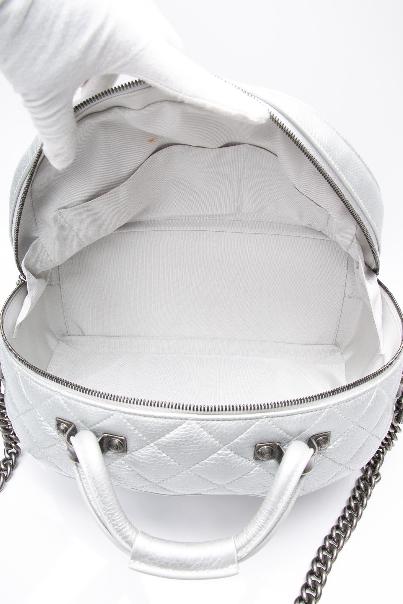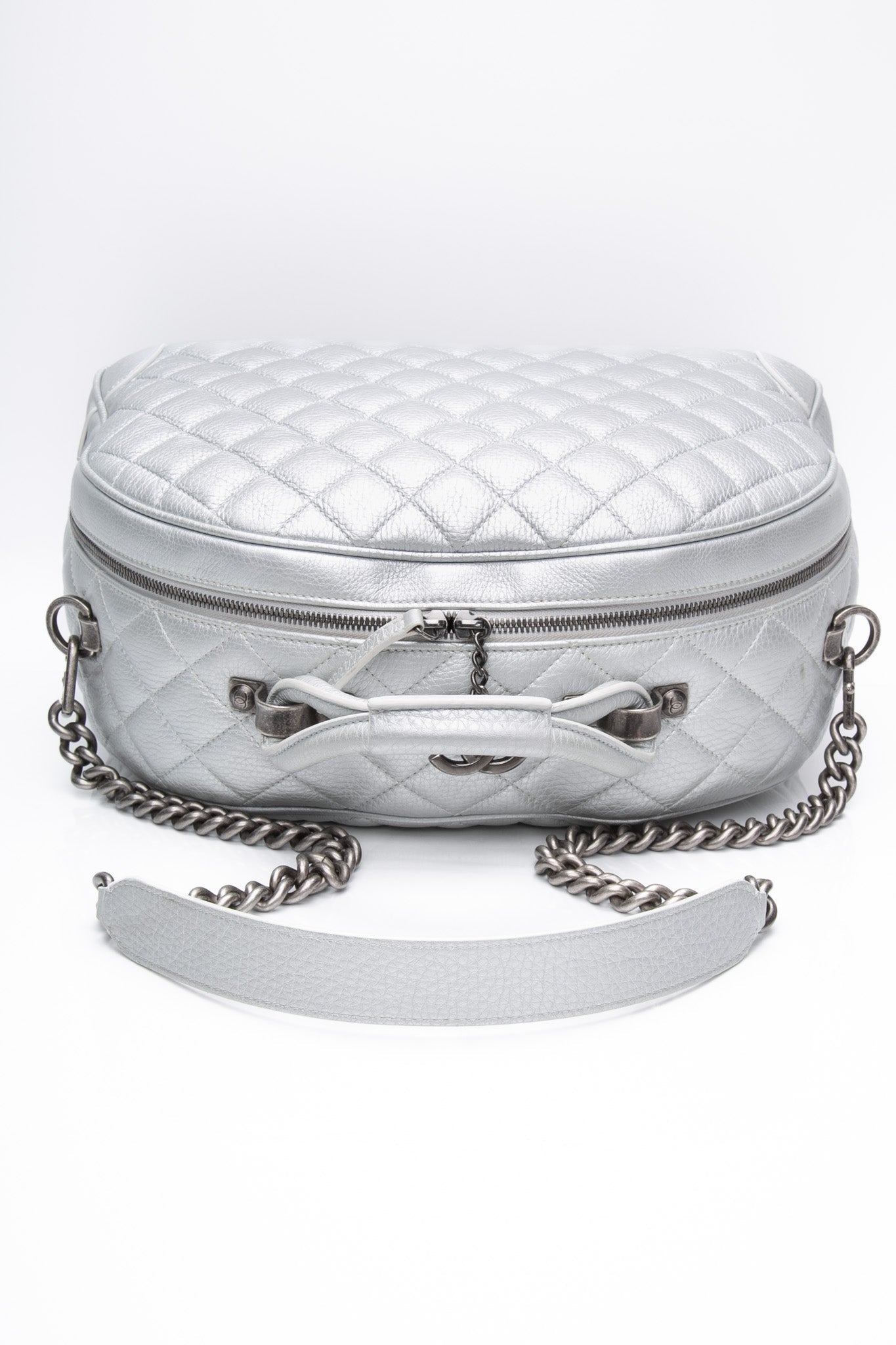 This lovely tote is crafted of diamond quilted calfskin leather in silver. The bag features a leather top handle, a ruthenium shoulder strap with a shoulder pad and ruthenium hardware. The wrap around zipper opens to a spacious grey fabric interior with zipper and patch pockets.