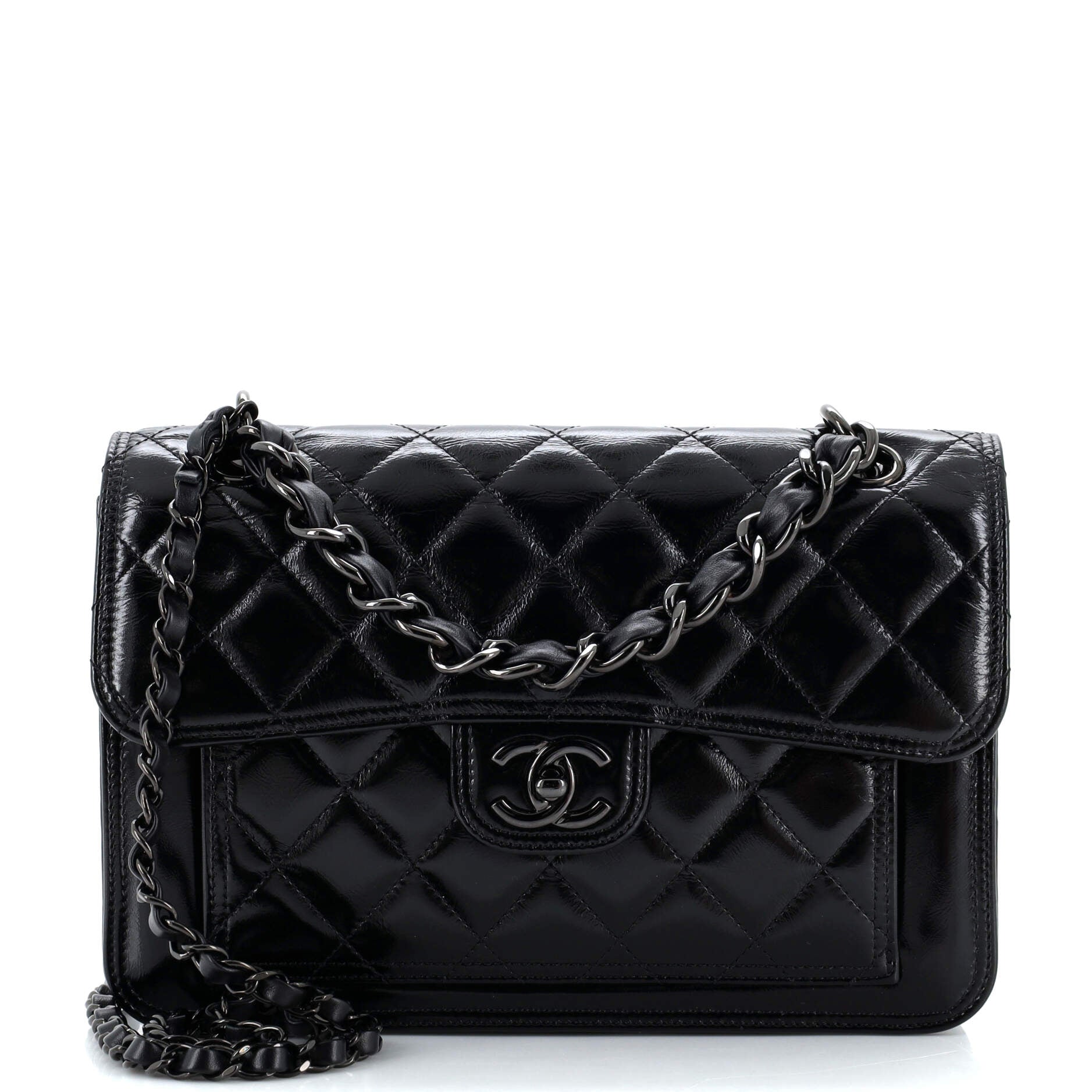 CHANEL So Black CC Front Pocket Chain Flap Bag Quilted Shiny Calfskin Medium