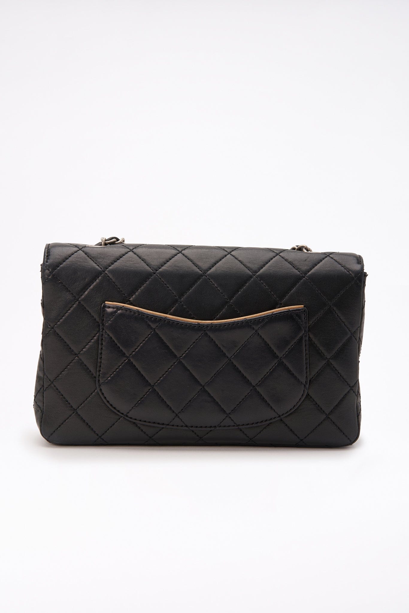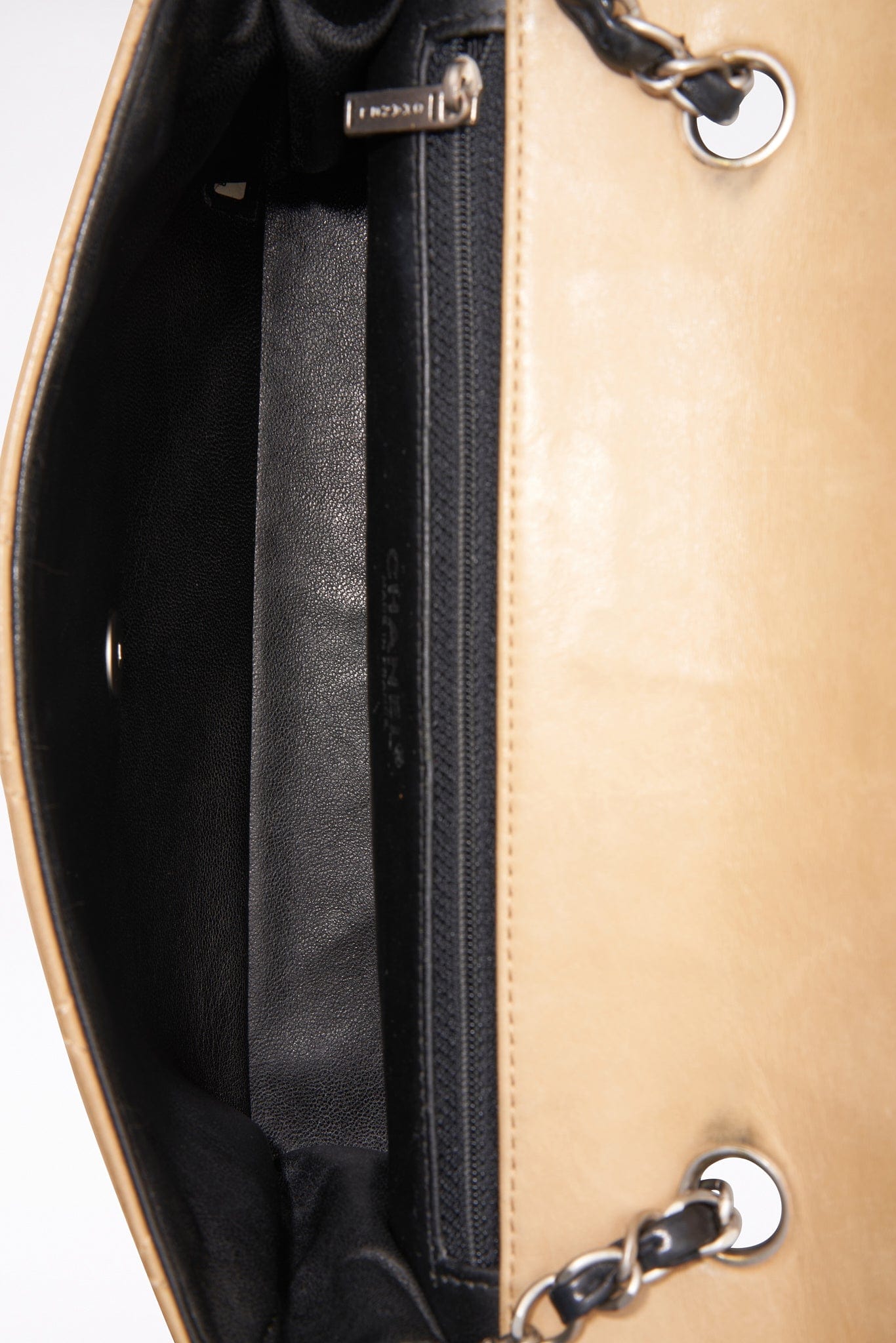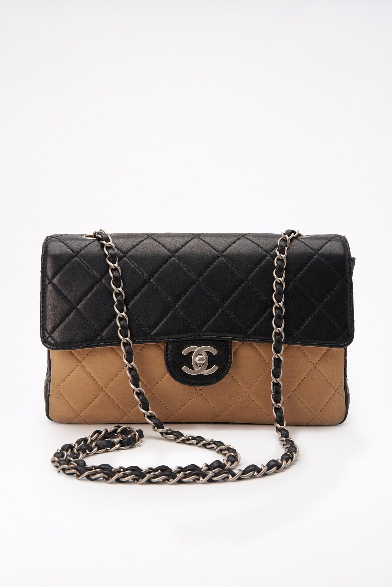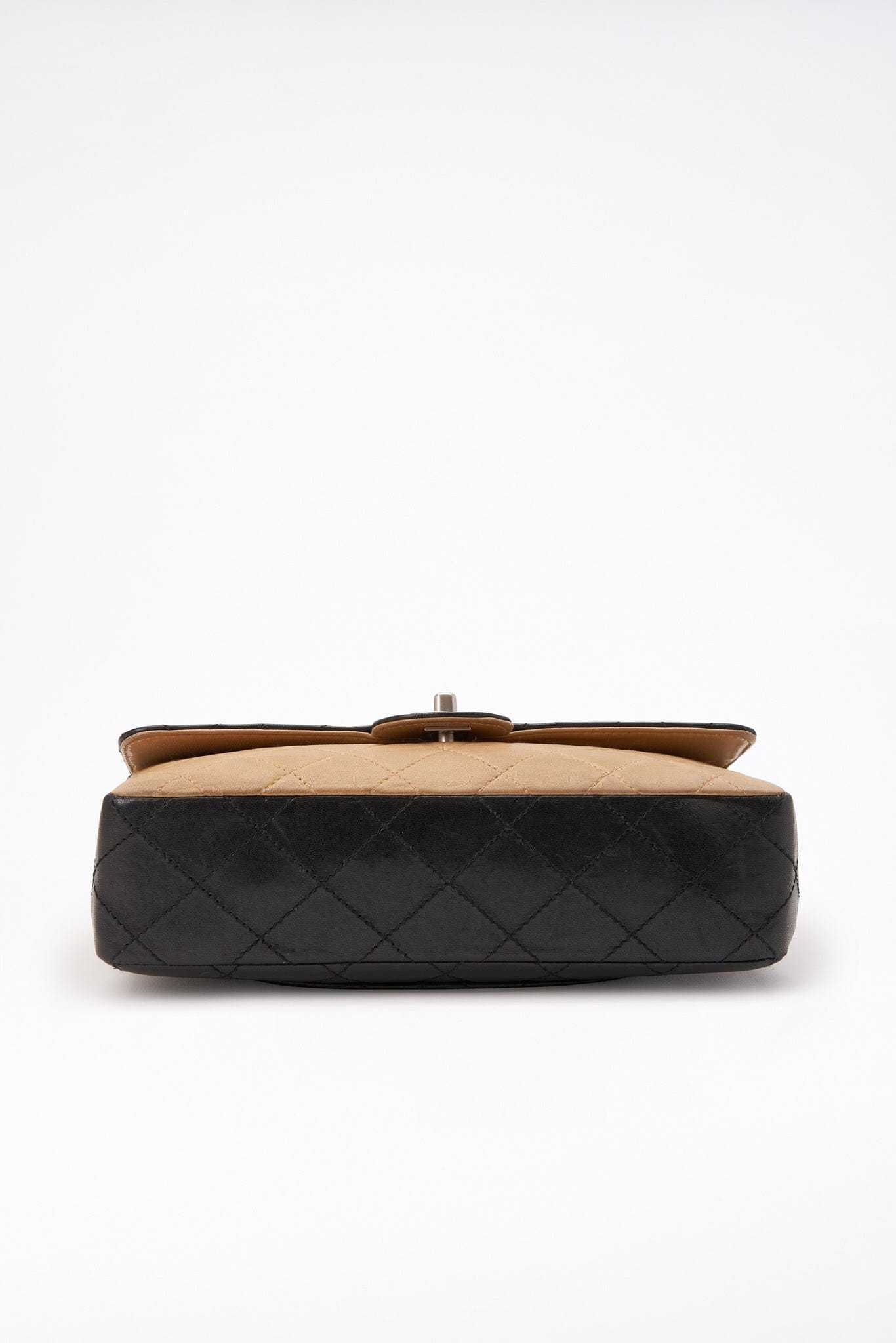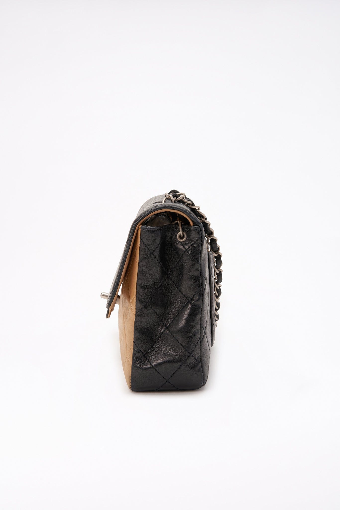 This is a gorgeous Chanel Timeless Medium Limited Edition single flap shoulder bag in Black & Beige Two-Tone quilted lamb leather with matt silver metal hardware and black leather Interlaced silver metal chain.
