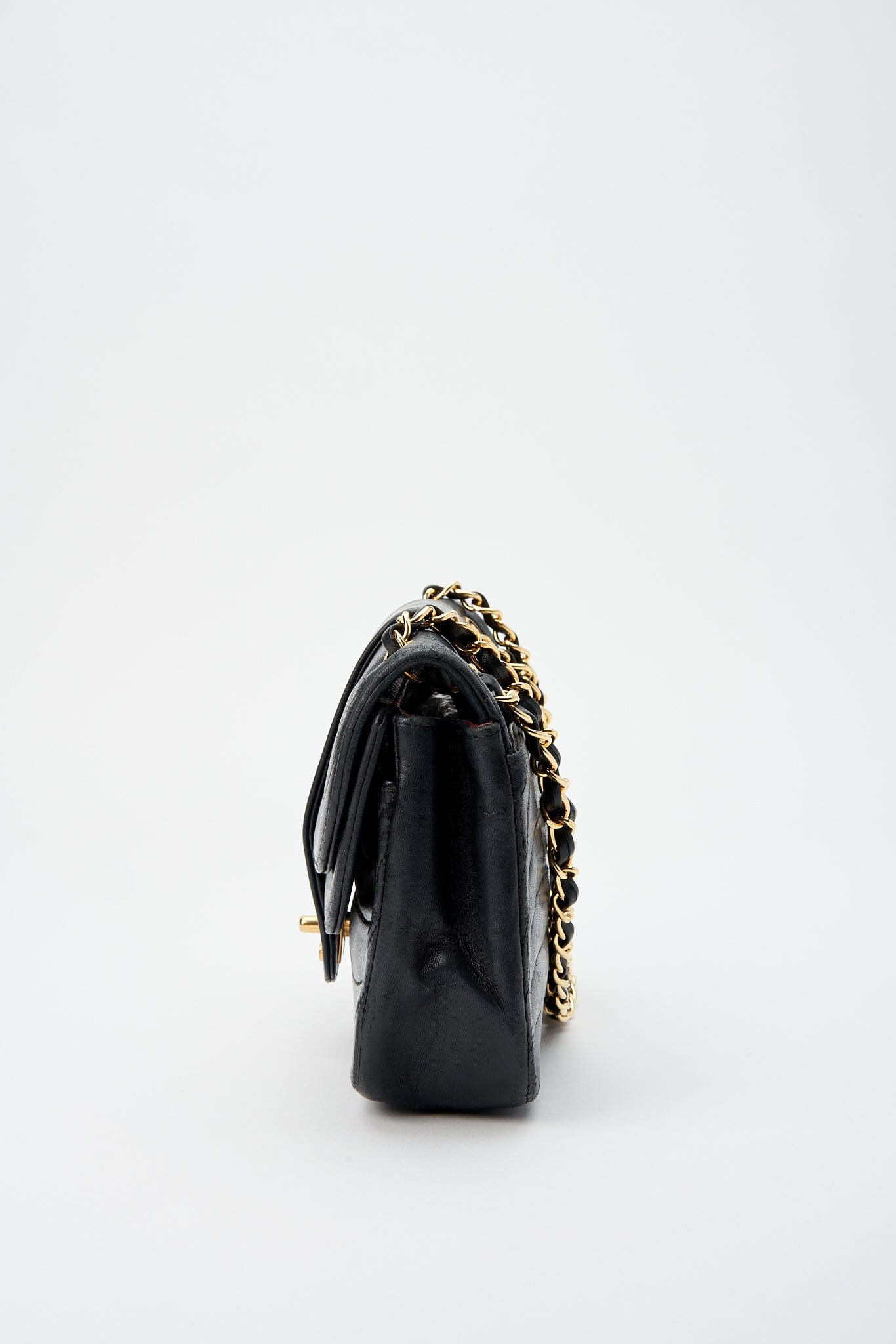 This vintage Chanel Single Flap bag is crafted with black quilted lambskin leather with 24k gold-plated hardware and a double leather-trimmed chain-link shoulder strap.