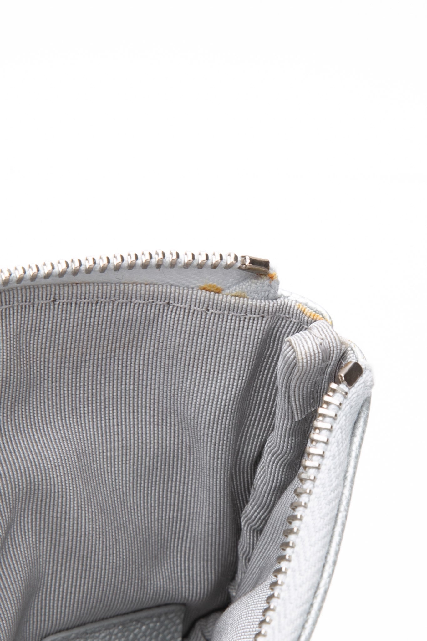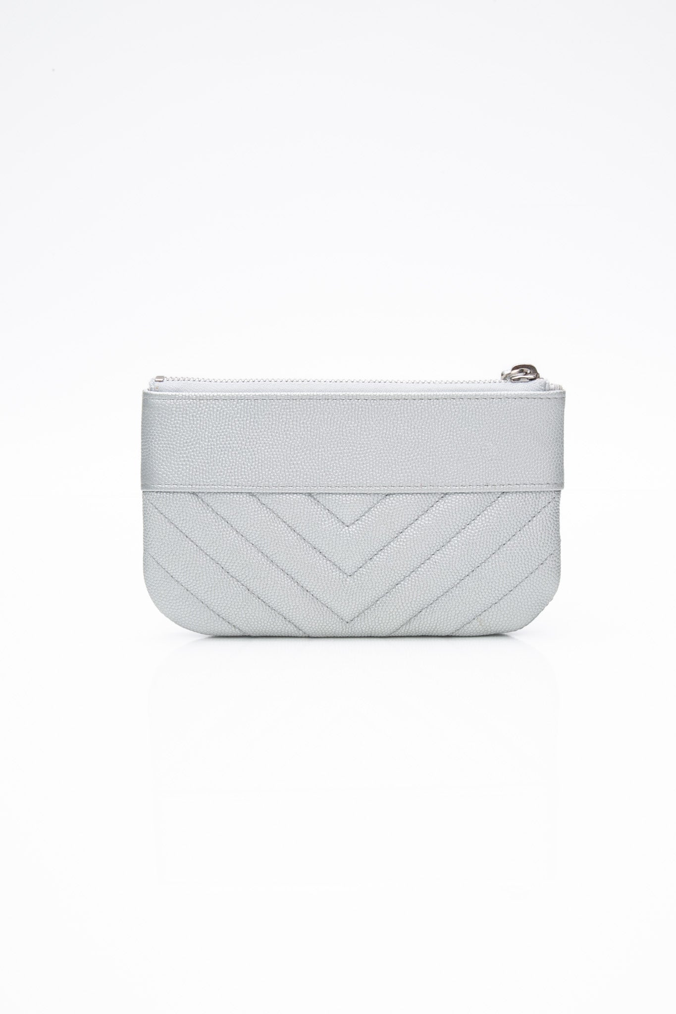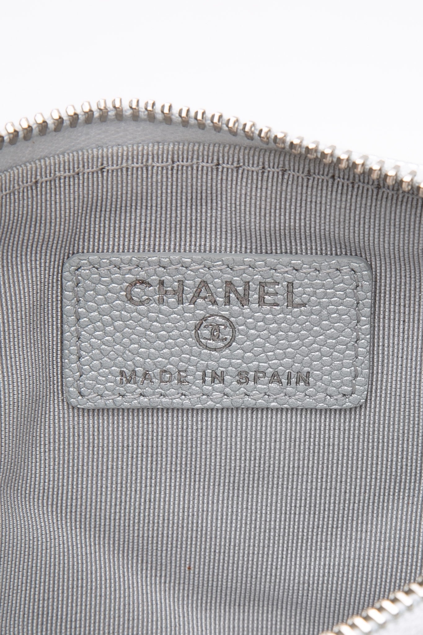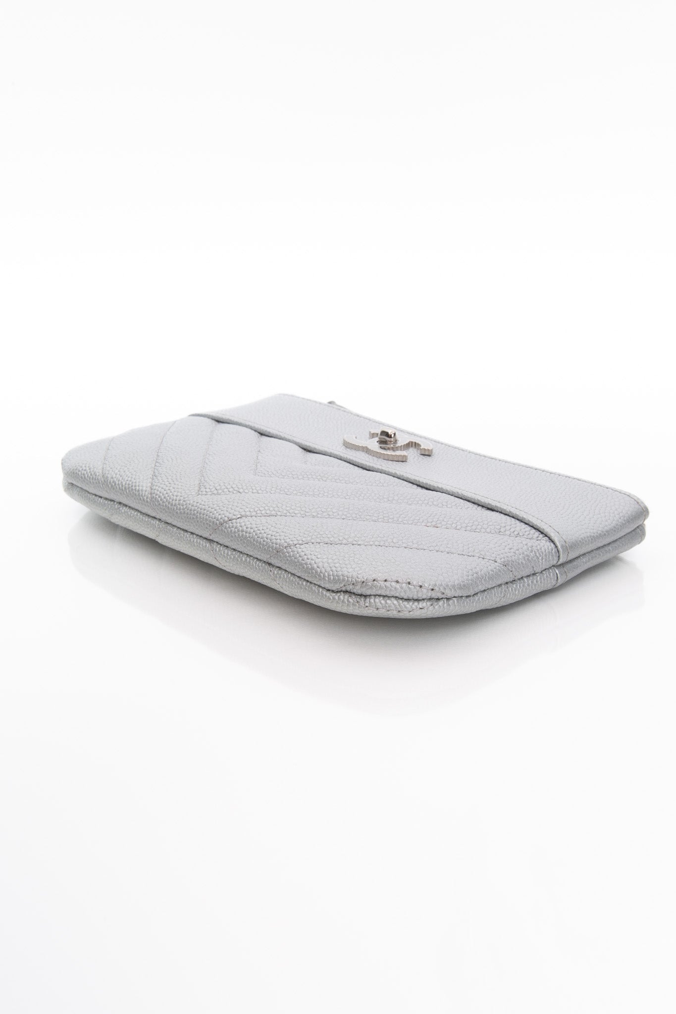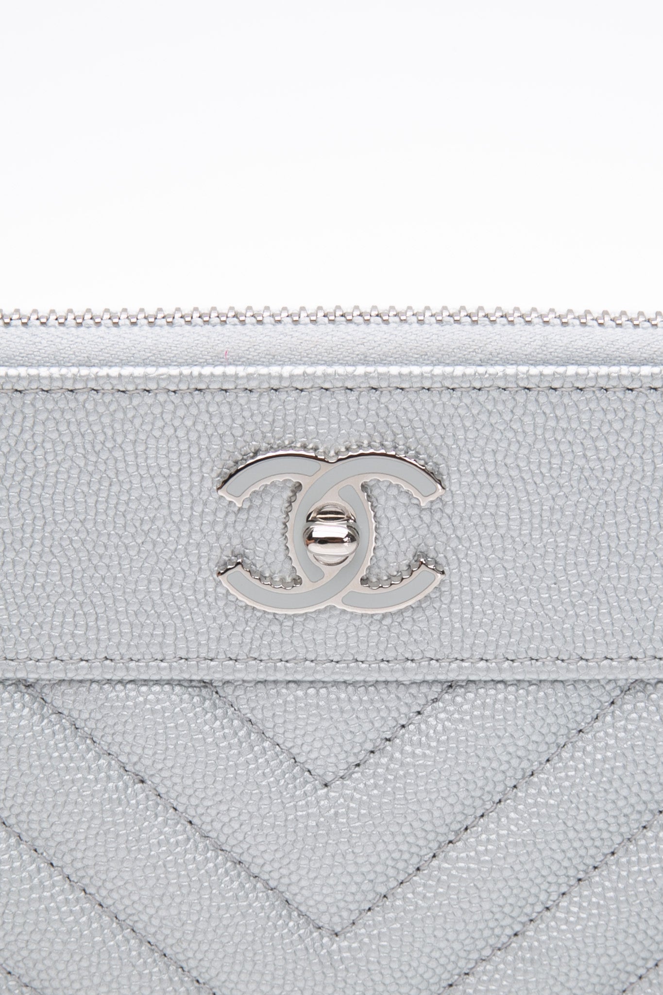 This petite case is crafted of chevron quilted leather in silver and features a faux CC turn lock in silver with grey enamel inlay. The top zipper opens to a grey fabric interior.