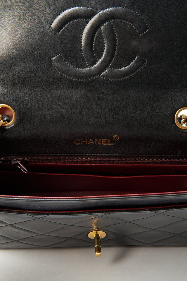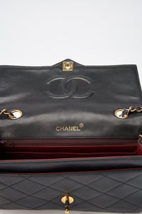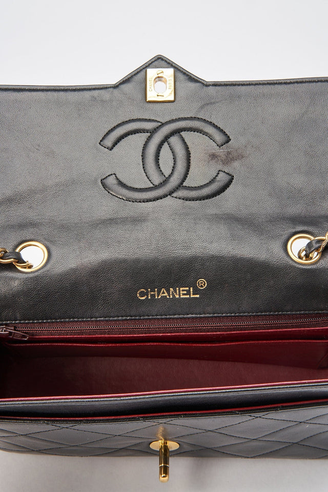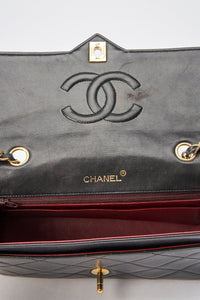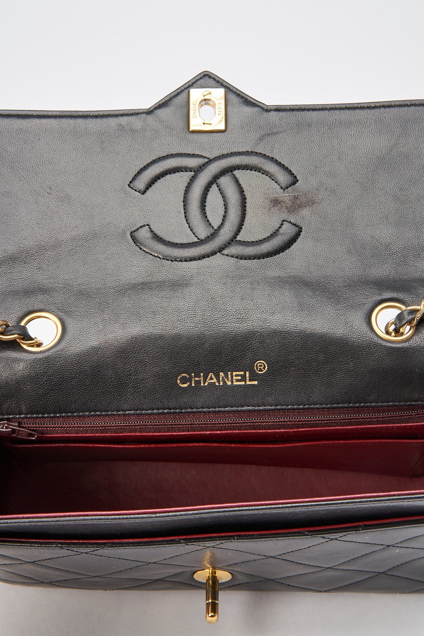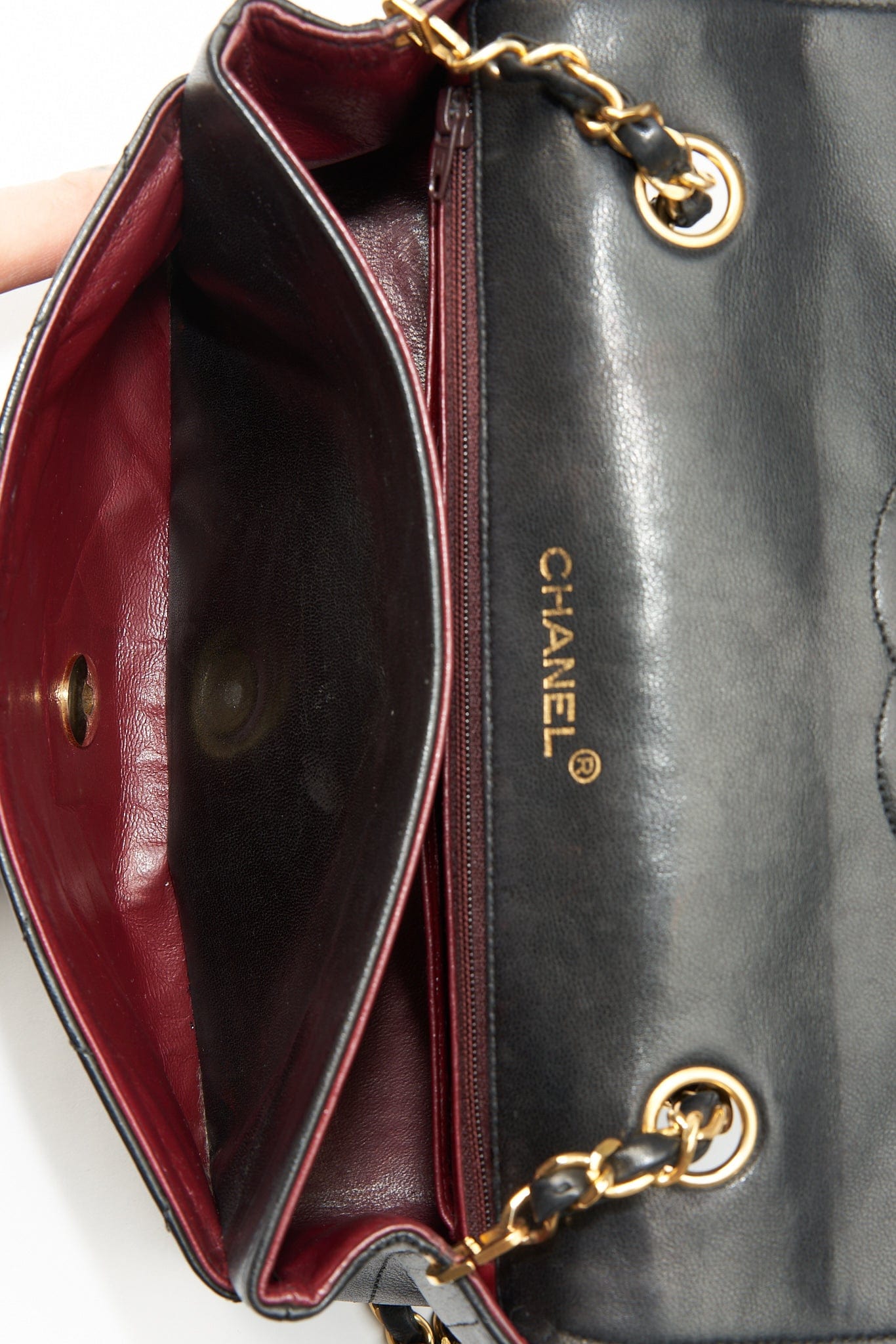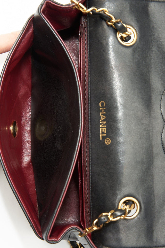 This vintage Classic Chanel Single Flap bag is crafted with black diamond quilted lambskin leather with 24k gold-plated hardware and a single leather-trimmed chain-link shoulder strap. There is a zip and a slip pocket inside this bag plus the interior is lined with maroon leather.