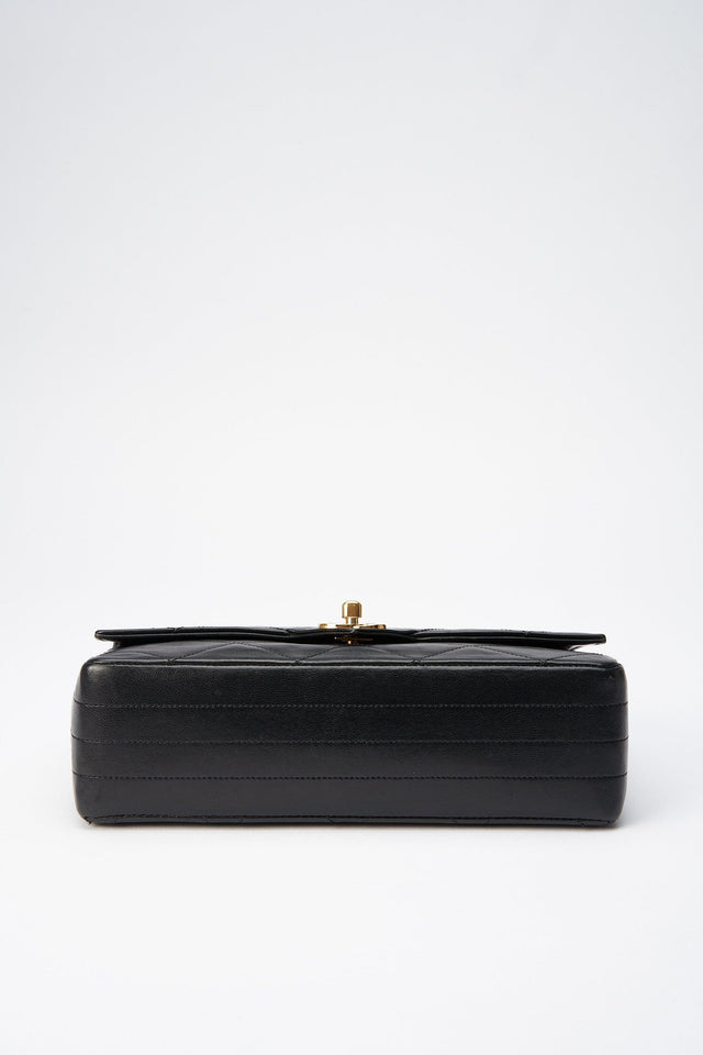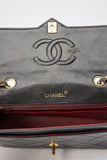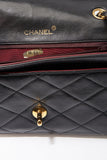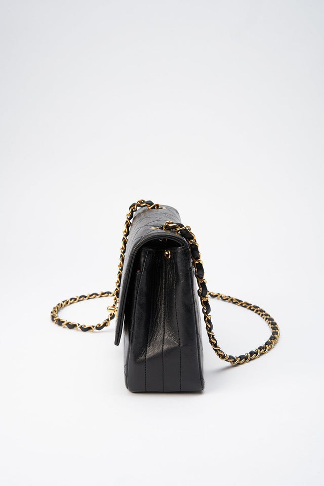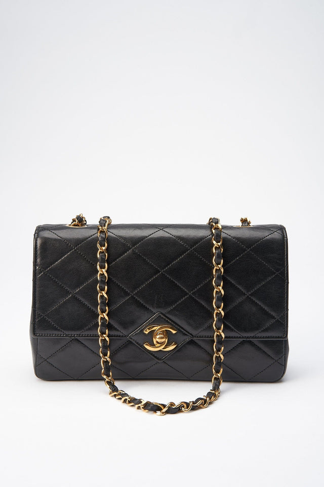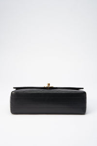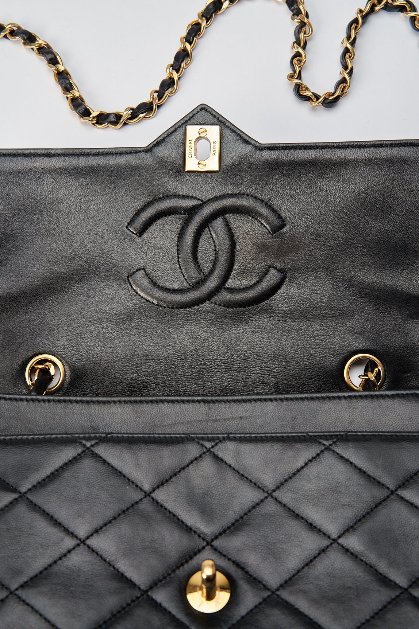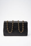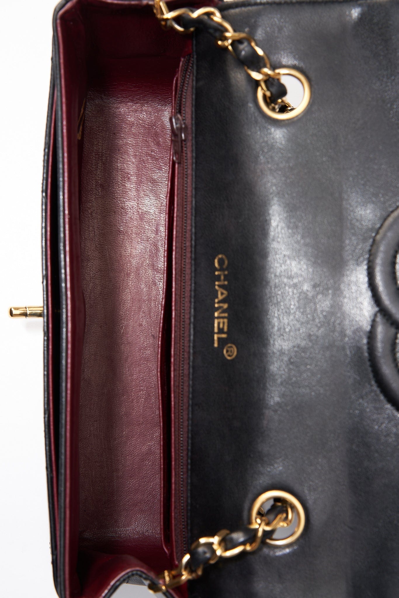 This vintage Classic Chanel Single Flap bag is crafted with black diamond quilted lambskin leather with 24k gold-plated hardware and a single leather-trimmed chain-link shoulder strap. There is a zip and a slip pocket inside this bag plus the interior is lined with maroon leather.