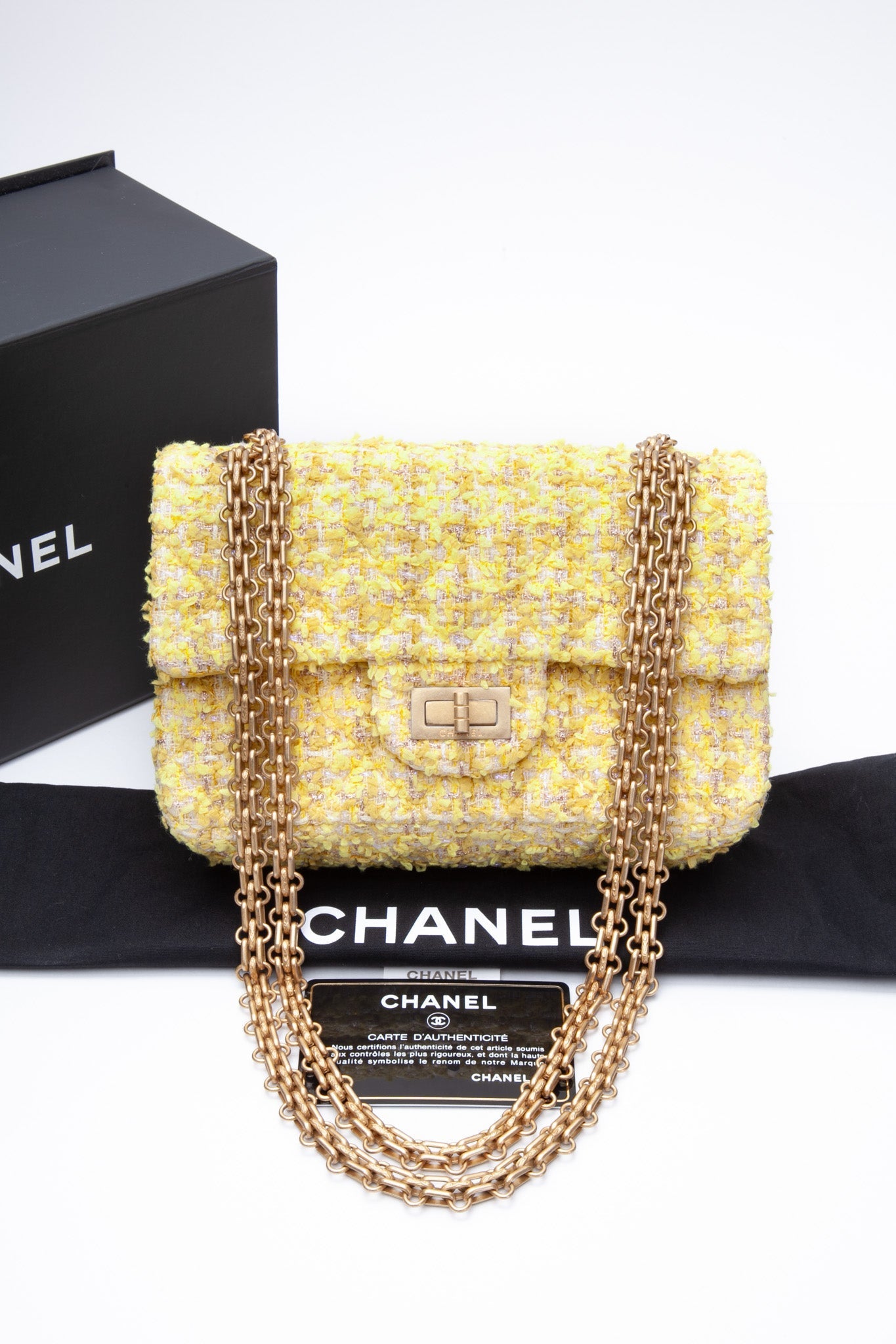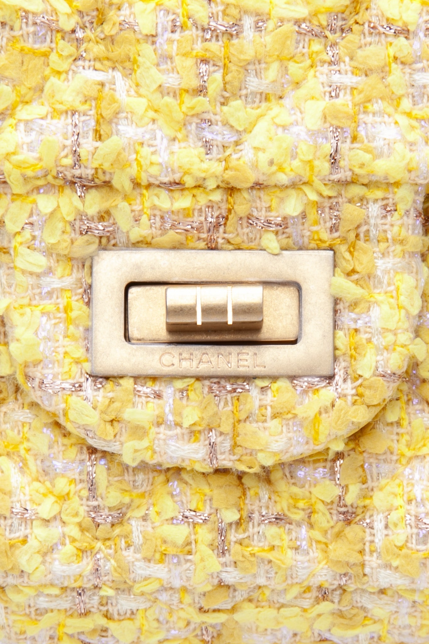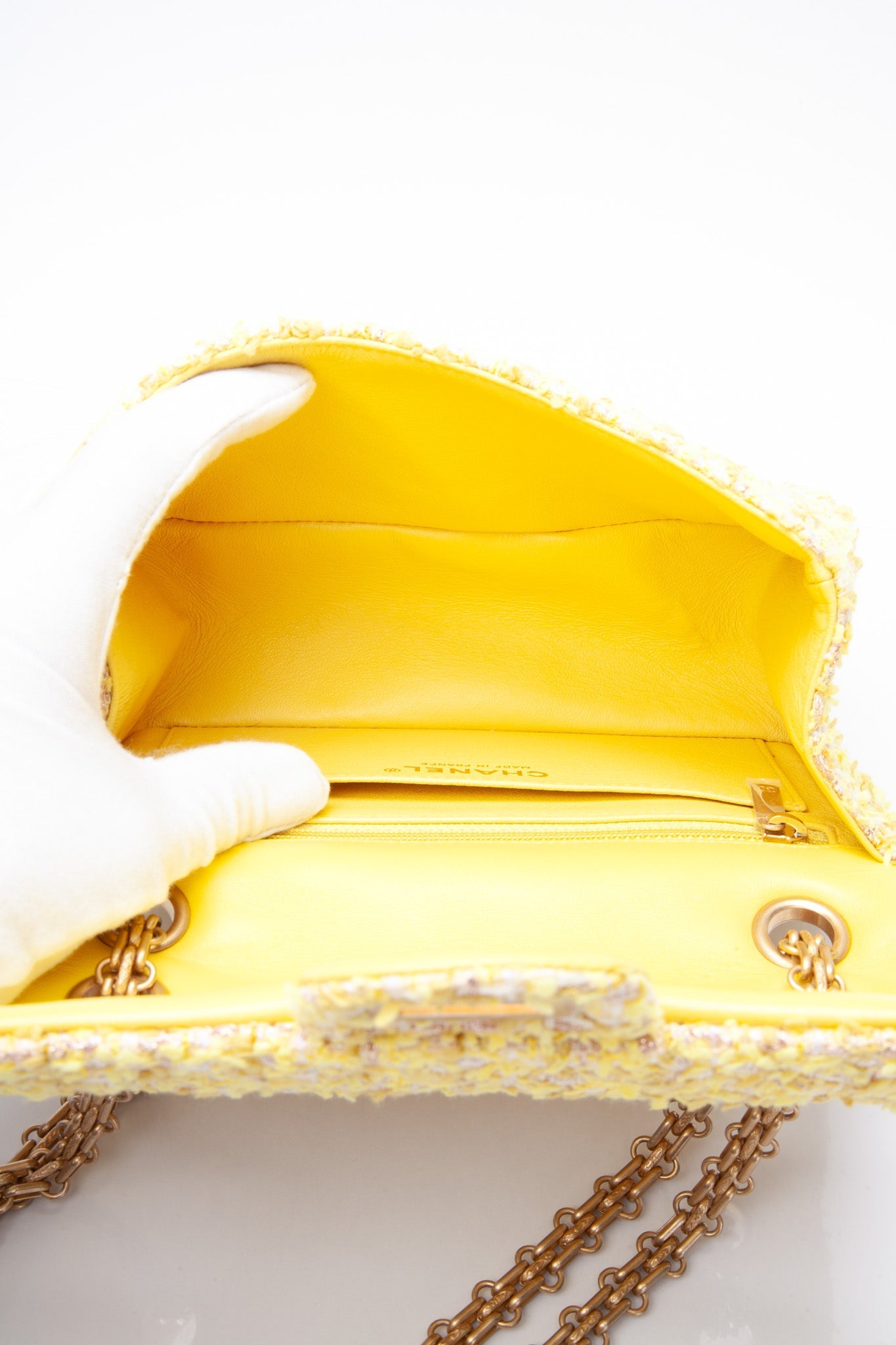 This Chanel bag is crafted of tweed in yellow. It features an in The tweed handbag opens from an aged gold Mademoiselle lock to a bright yellow leather interior with a pockets.