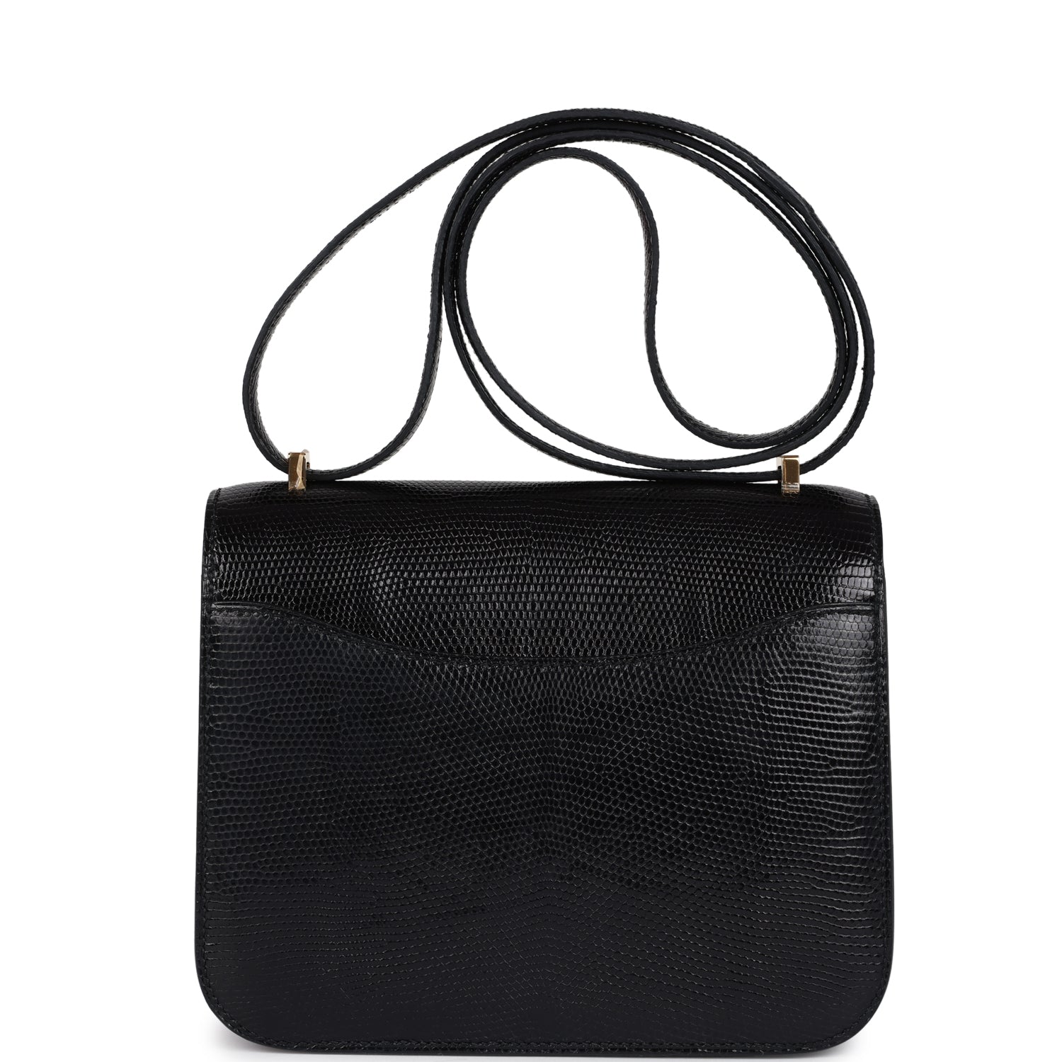 This Constance 18 is in Black Varanus Niloticus Lizard leather with Gold hardware and has tonal stitching, a gold "H" snap lock closure and adjustable shoulder strap.