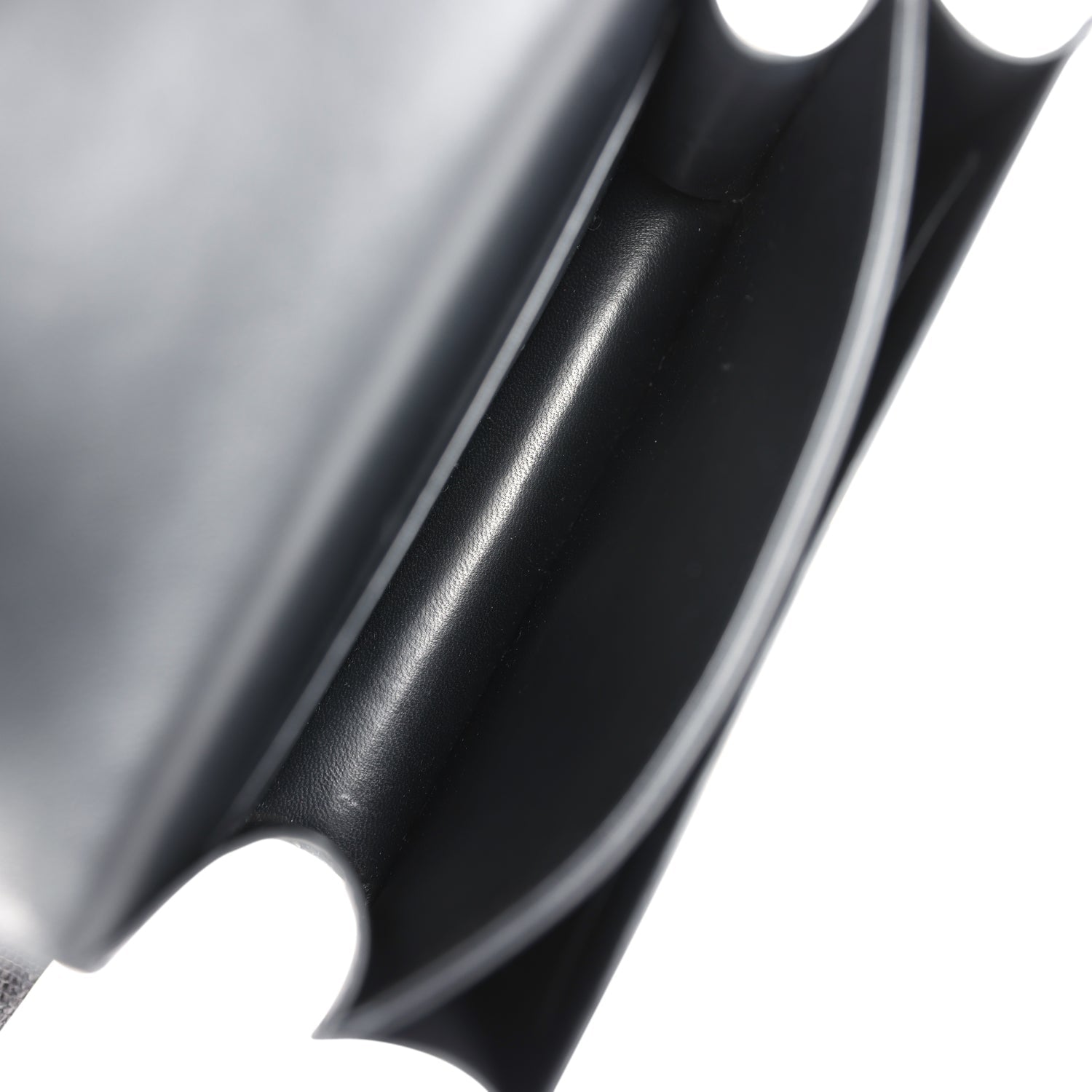 The interior is lined with Black lambskin and has an open pocket on the front wall, a center divide, and a slit pocket on the back wall.