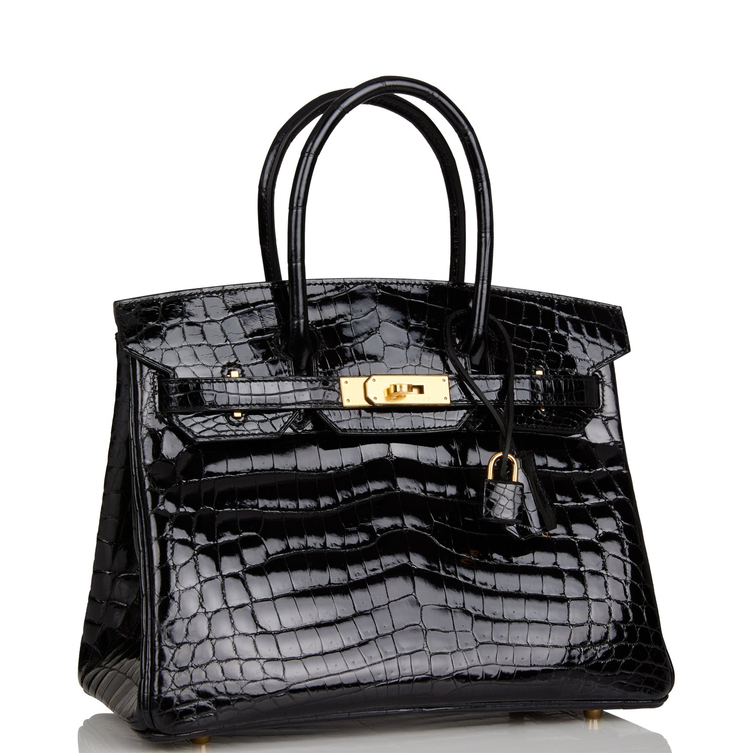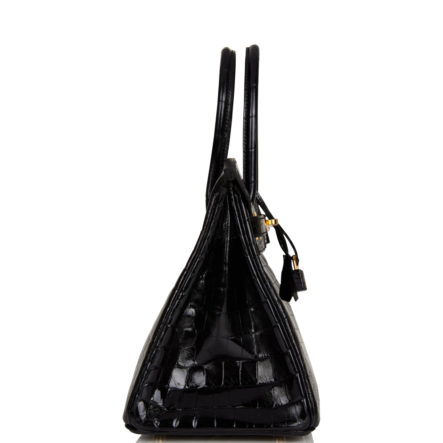 This Birkin is in Black shiny Niloticus crocodile with gold hardware and has tonal stitching, front flap, two straps with center toggle closure, clochette with lock and two keys, and double rolled handles.