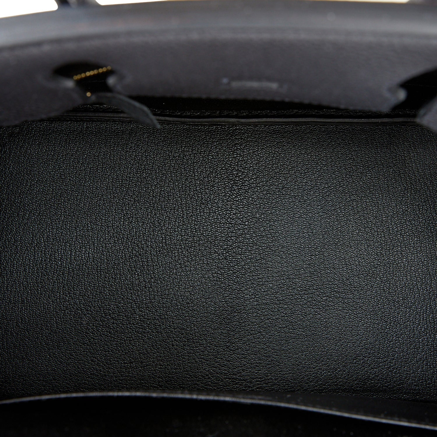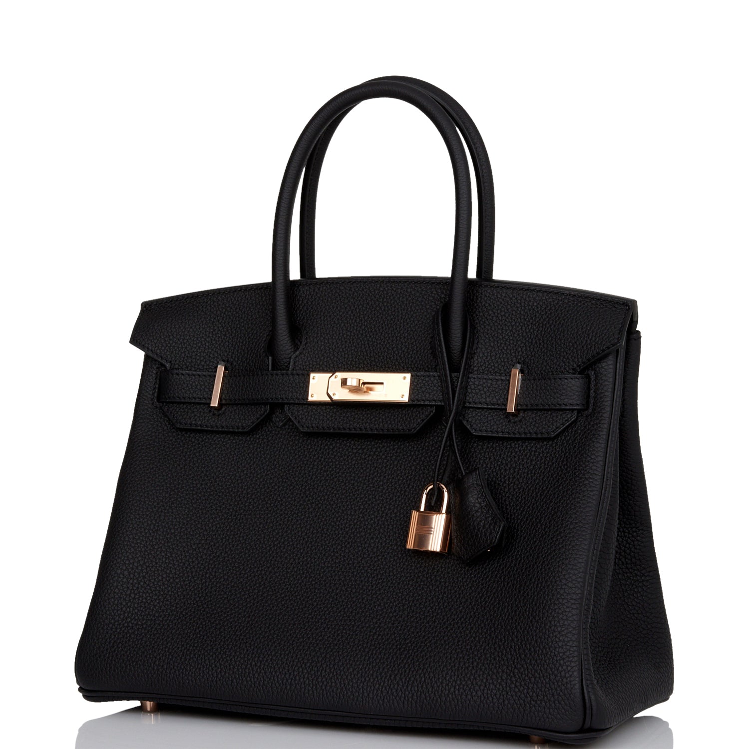 This Birkin is in Black togo leather with rose gold hardware and has tonal stitching, front flap, two straps with center toggle closure, clochette with lock and two keys, and double rolled handles.