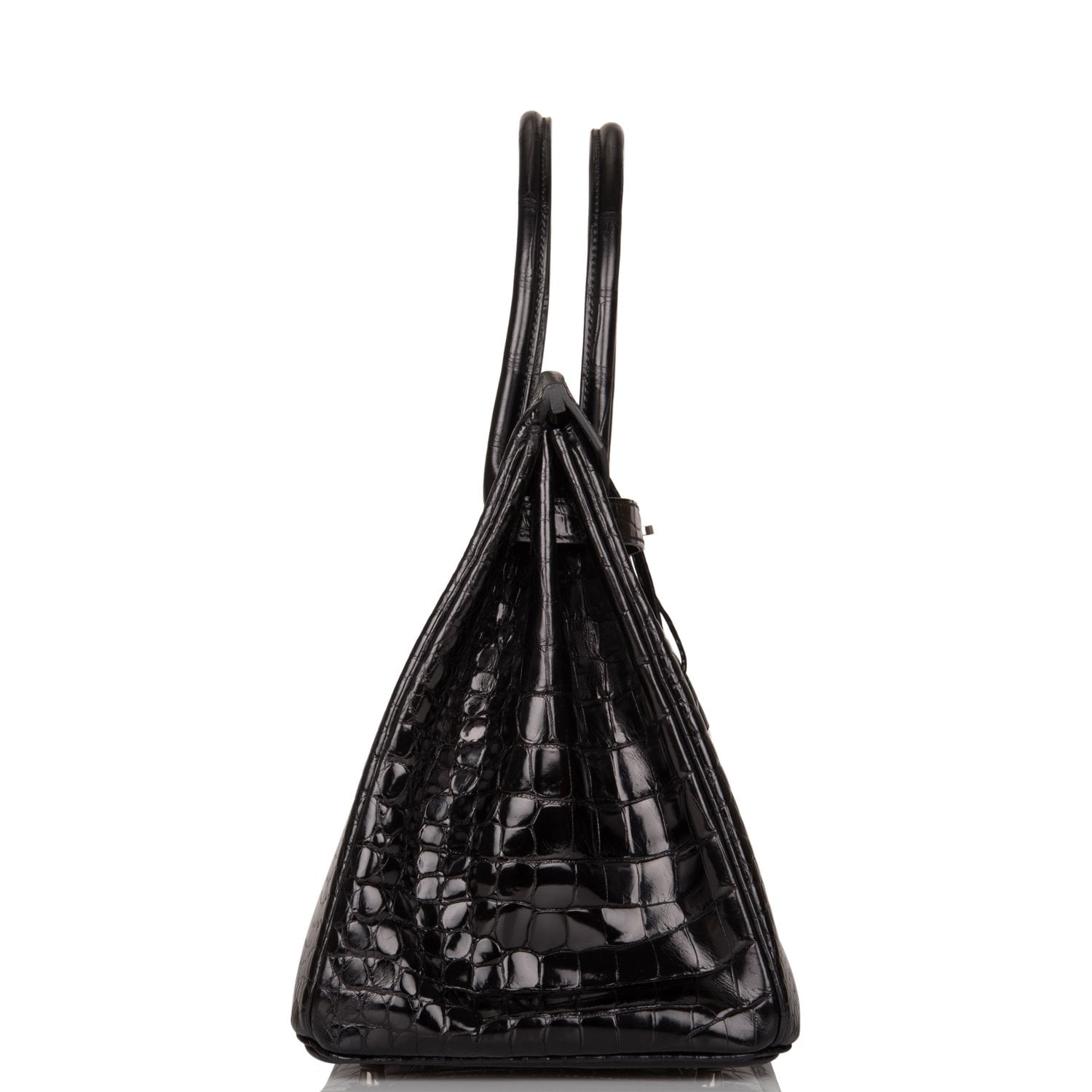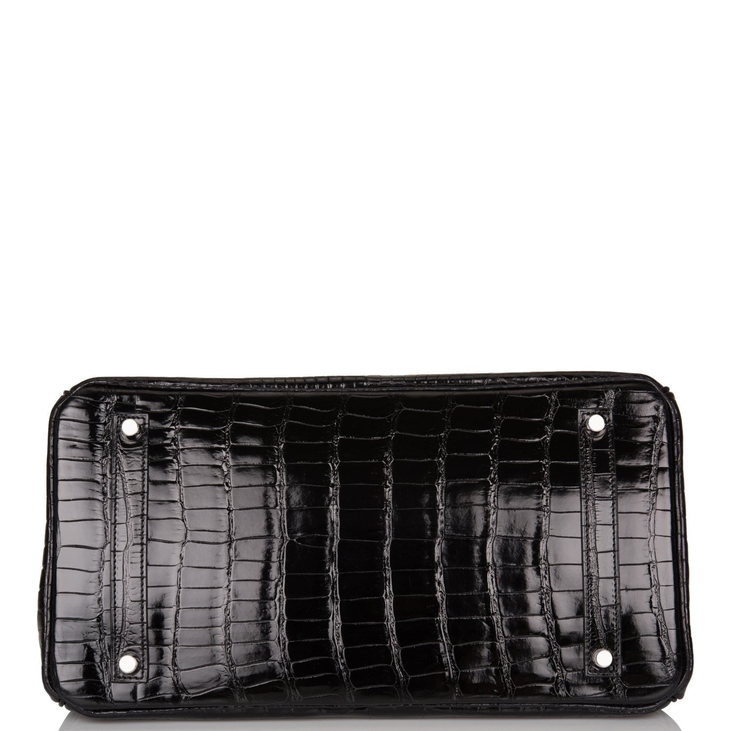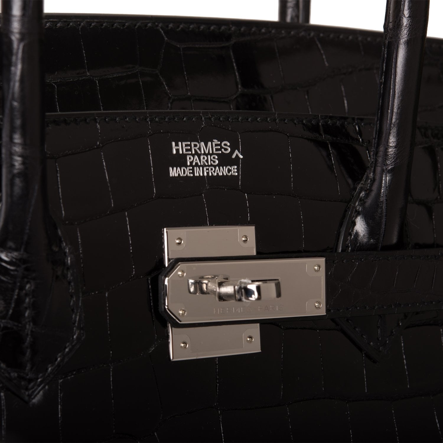This Birkin is of black shiny Porosus crocodile with palladium hardware and features tonal stitching, front flap, two straps with center toggle closure, clochette with lock and two keys, and double rolled handles.