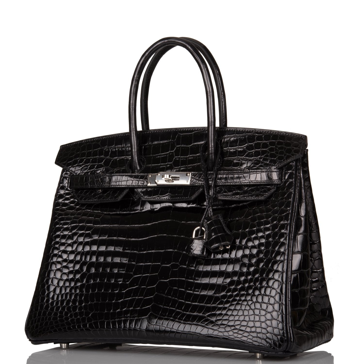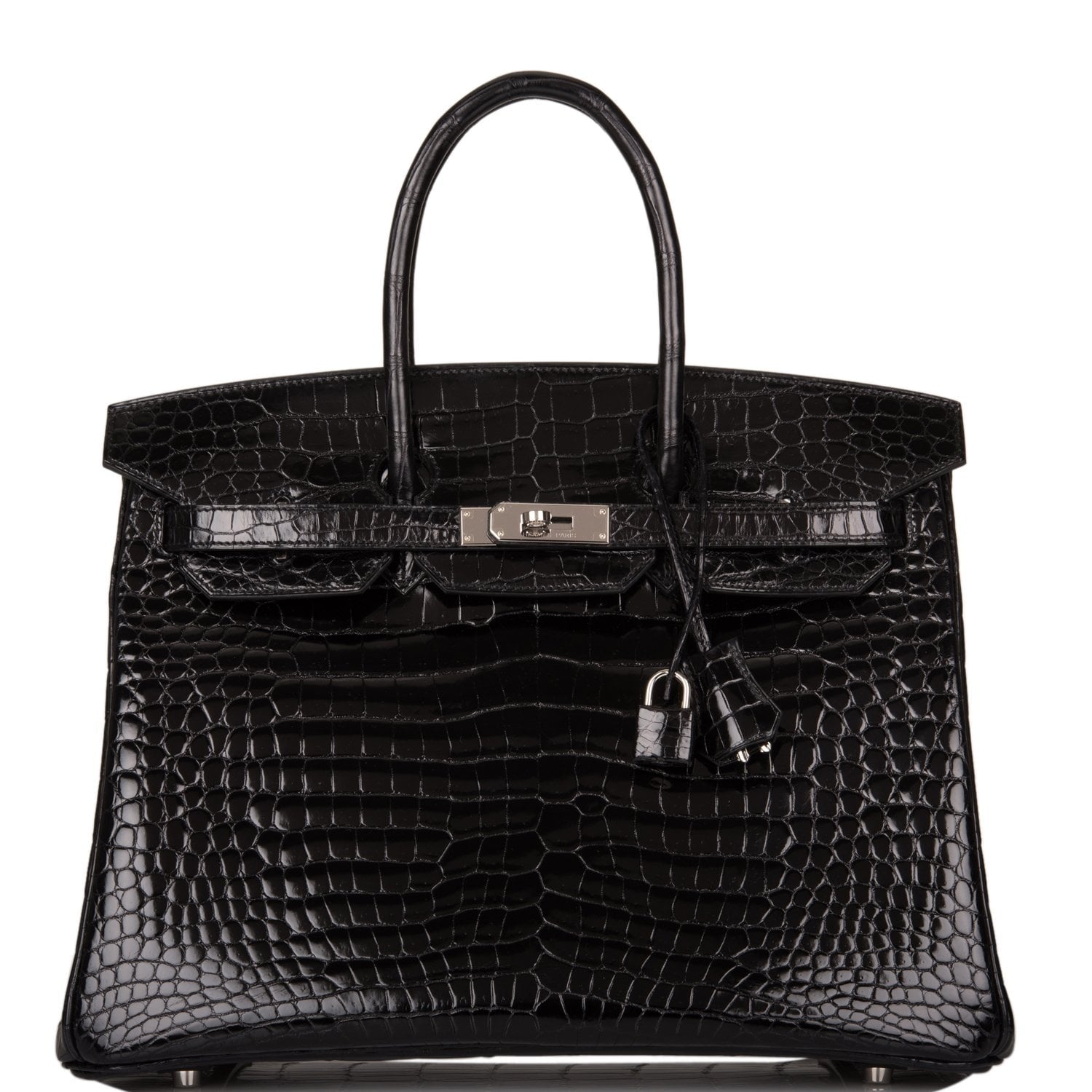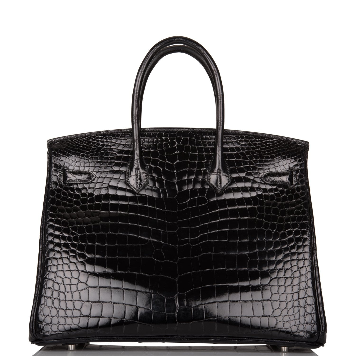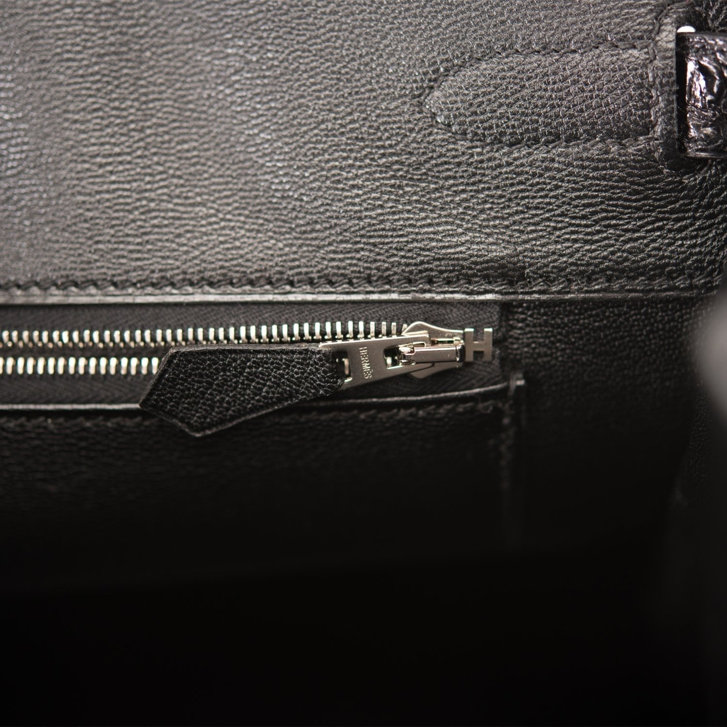 This Birkin is of black shiny Porosus crocodile with palladium hardware and features tonal stitching, front flap, two straps with center toggle closure, clochette with lock and two keys, and double rolled handles.