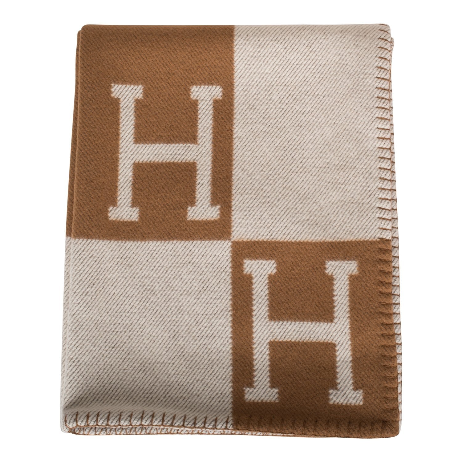 Hermes Classic Avalon Signature H blanket in ecru and camel made of 90% merino wool and 10% cashmere.